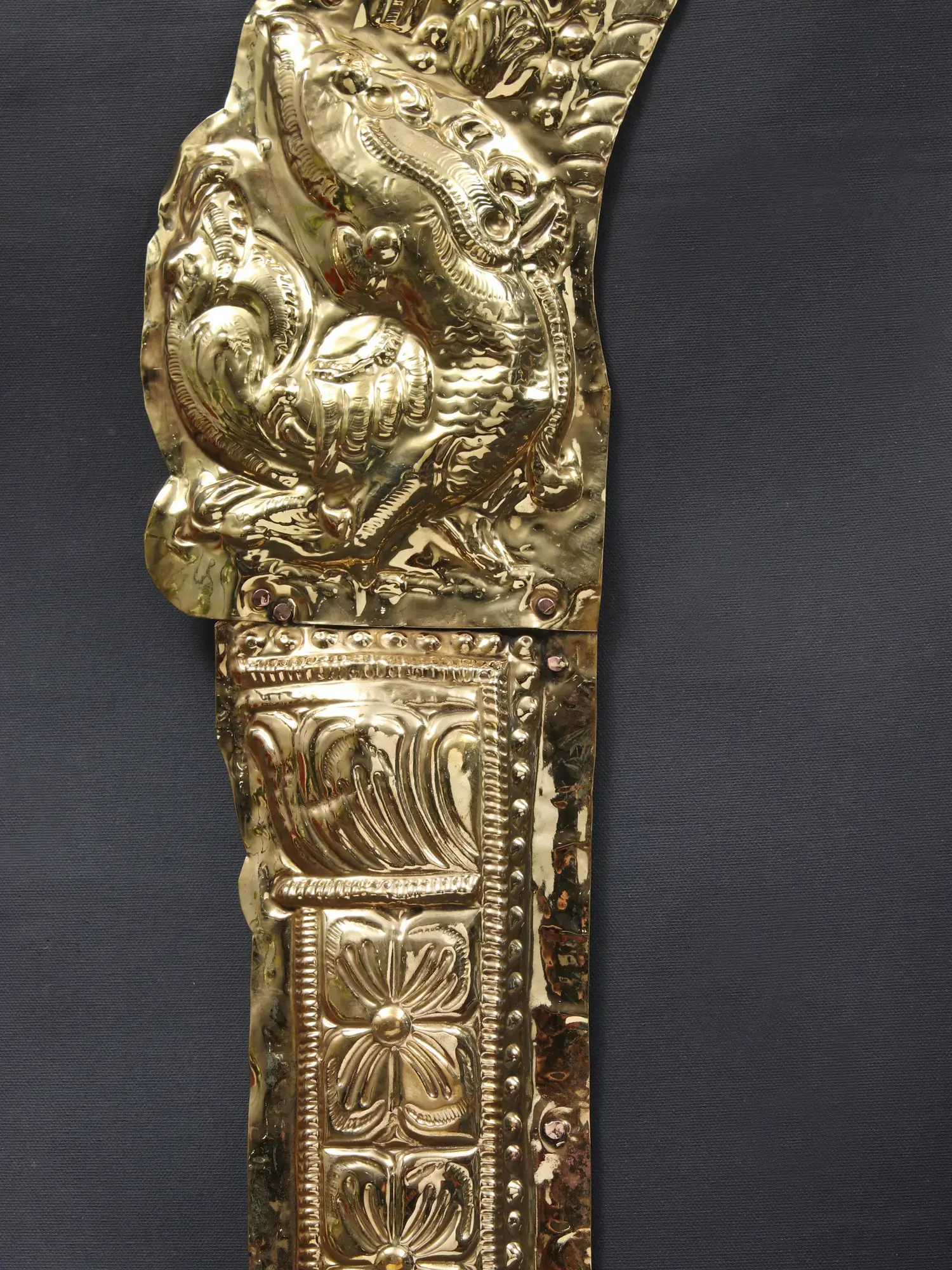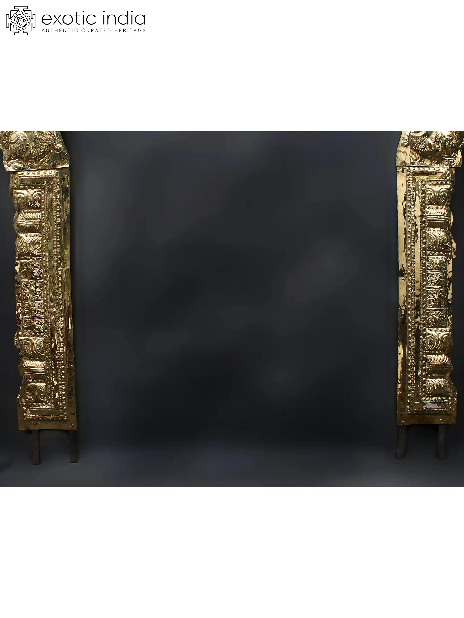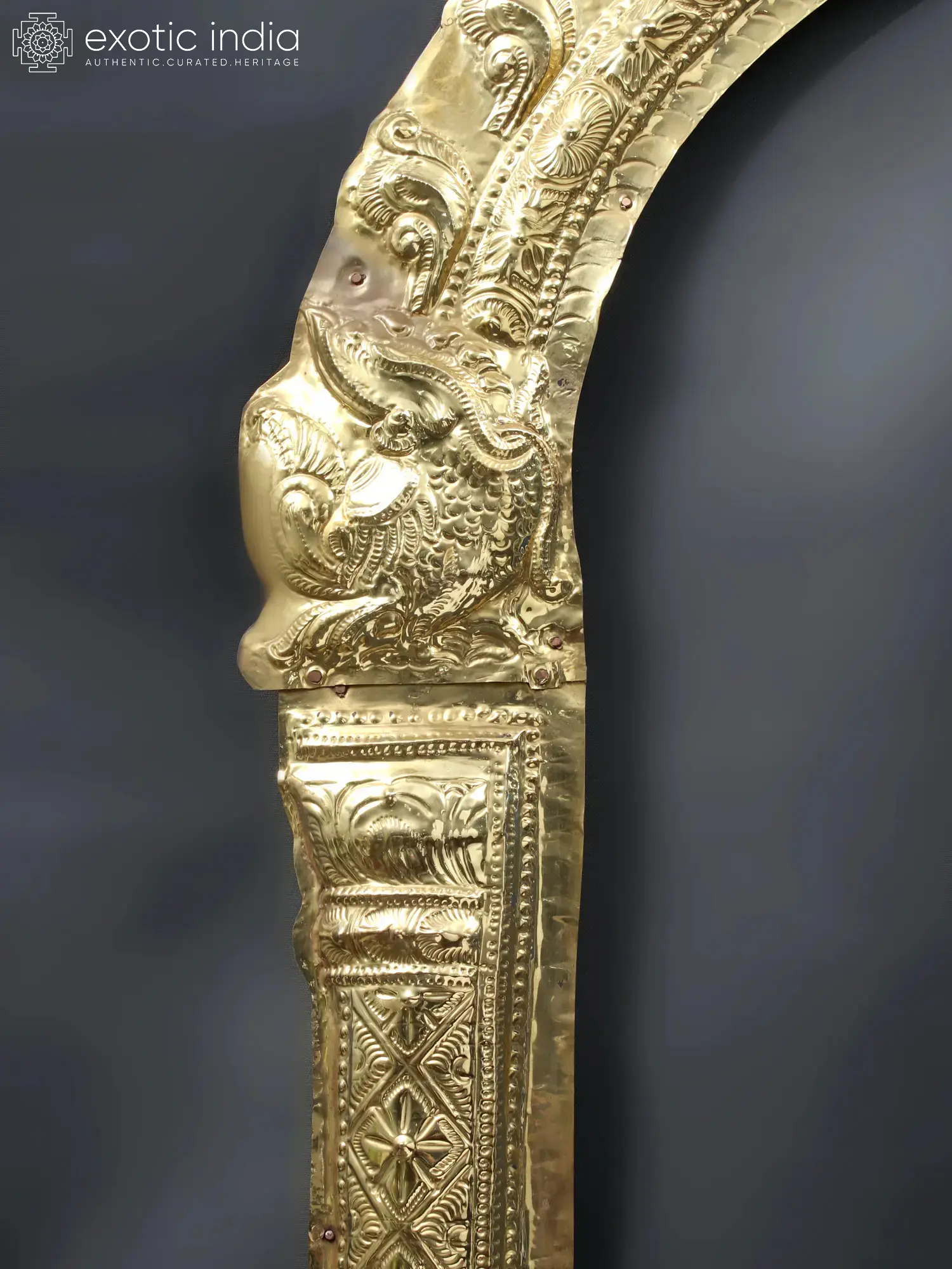 Marking the sacred aura of divinity in the sanctum sanctorum, a Prabhavali or aureole is a majestic element in the architecture of ancient Hindu shrines. Bringing the grandeur of Indian temples to your Puja ghar, this brass Thiruvachi arch is adorned with exquisite motifs and images of Kirtimukha and Makara. Crafted with the technique of repousse, that lends the composition an aesthetic richness, this Prabhavali is the perfect devoted offering to the throne of your deity.