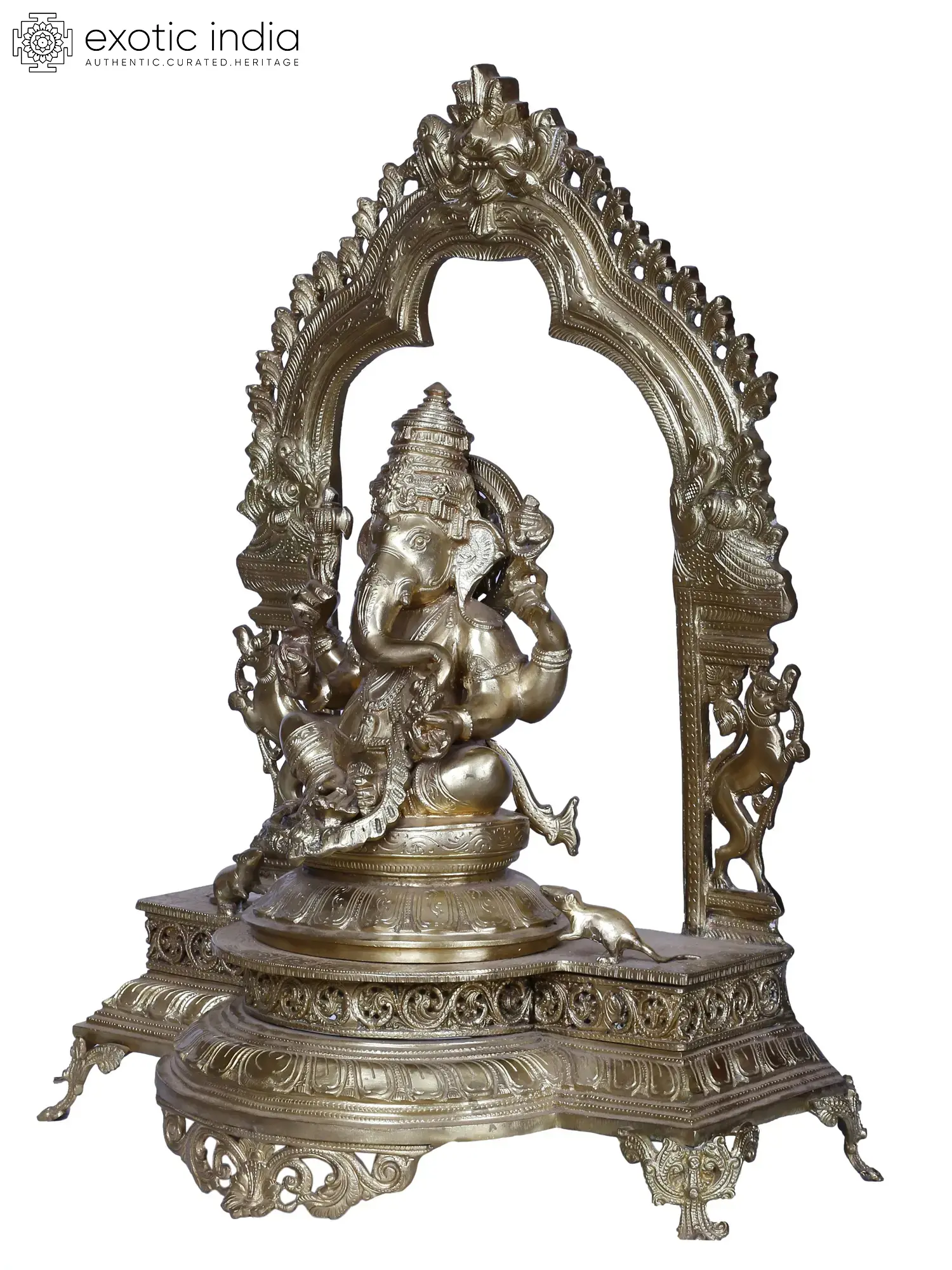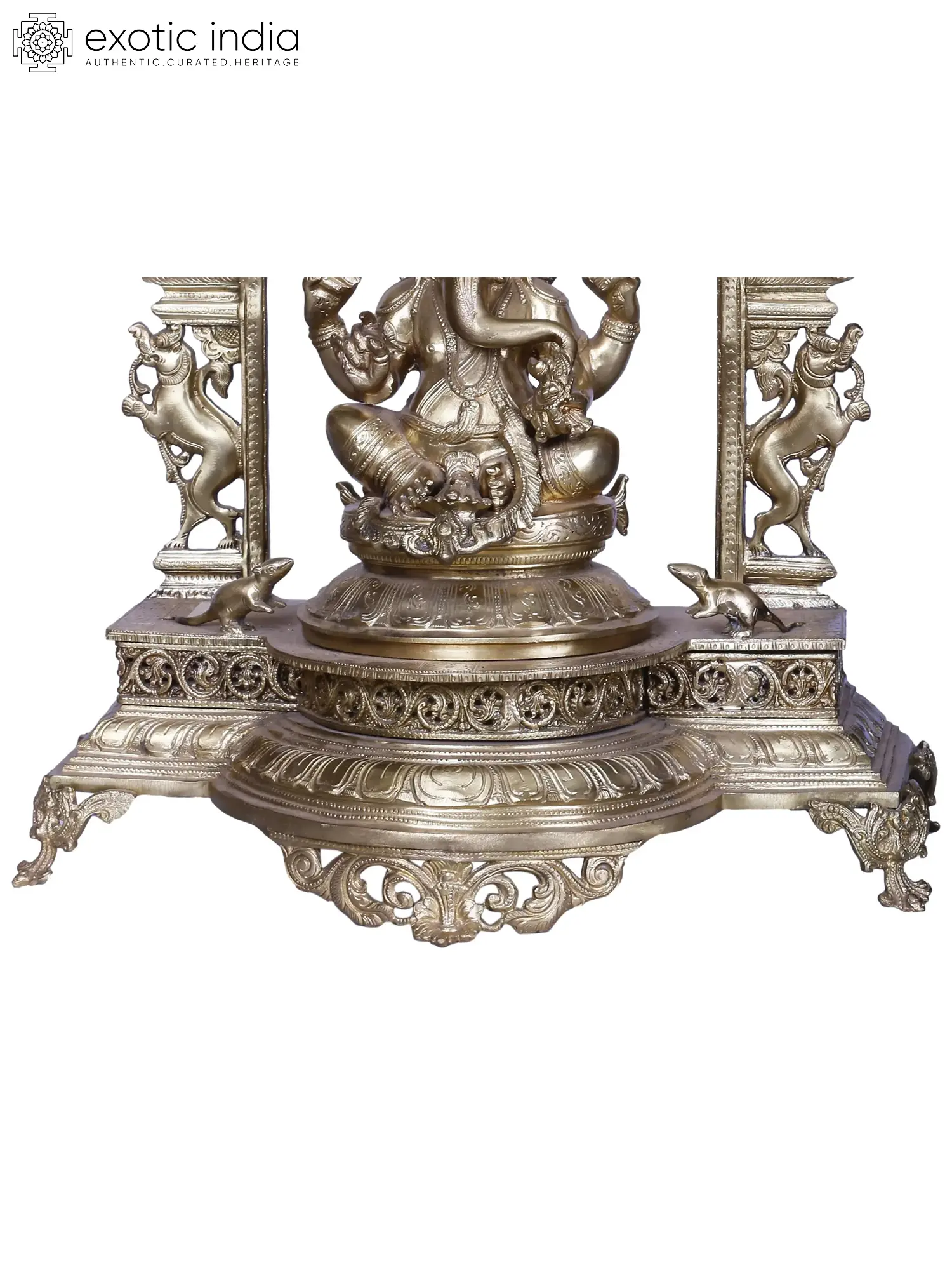 Crafted from high-quality brass, this statue is not merely an object of worship but a testament to enduring artistic tradition. The weight and substantial feel of the brass indicate its premium quality and the meticulous attention given to its creation. The intricate detailing, from the delicate etchings on Ganesha's ornaments to the fine relief work on the pedestal and the supporting pillars, showcases a level of artistry that is both timeless and profound. This piece is destined to become a cherished heirloom, passed down through generations, carrying with it blessings and a connection to ancient spiritual heritage. Its imposing yet graceful presence will undoubtedly become the focal point of any altar, puja room, or living space, radiating an aura of peace and prosperity.