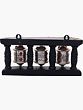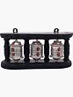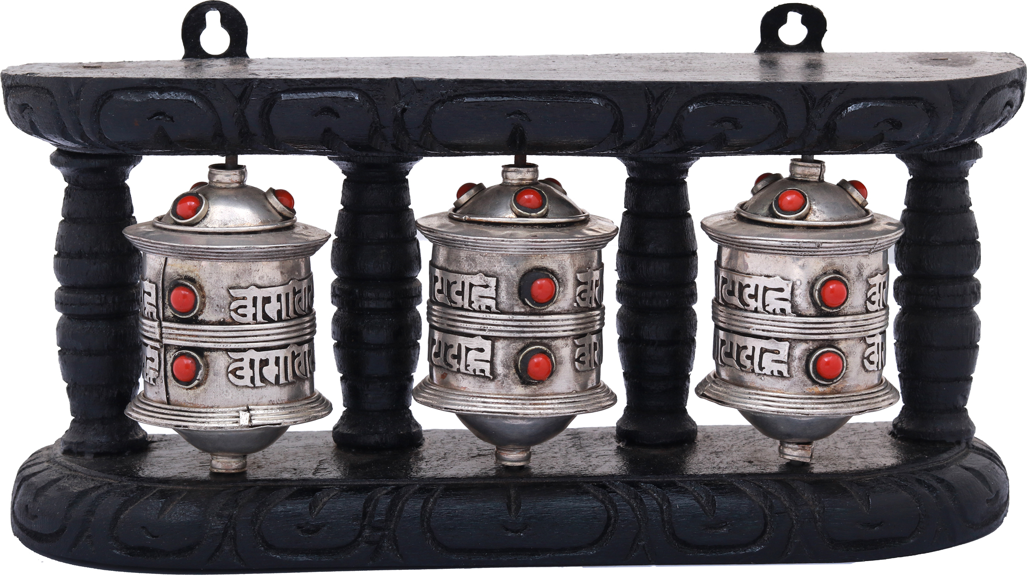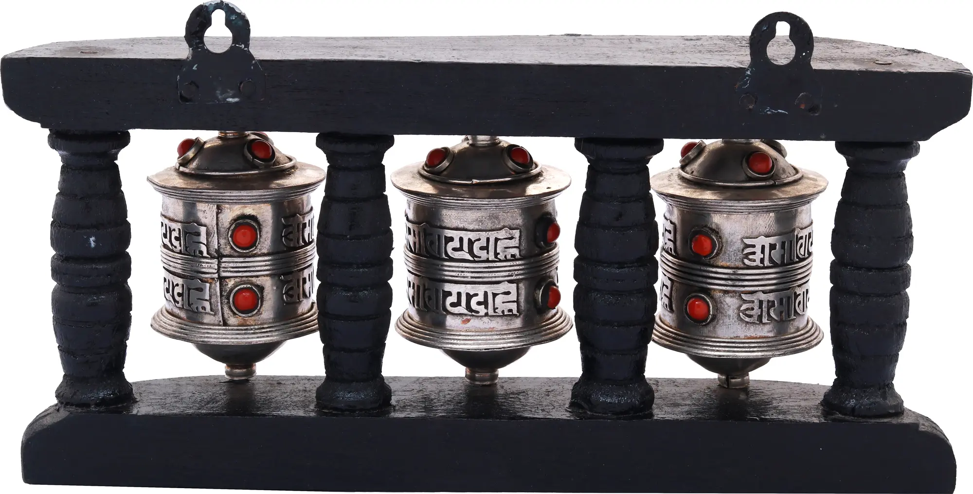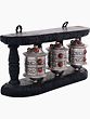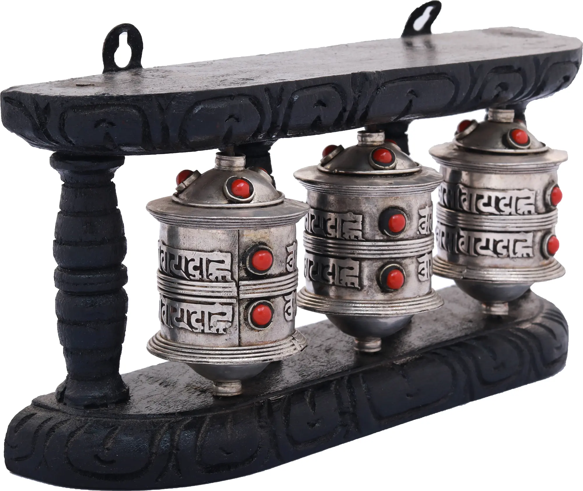 The Auspicious Trio: Triple Prayer Wheels on a Hand-Carved Stand