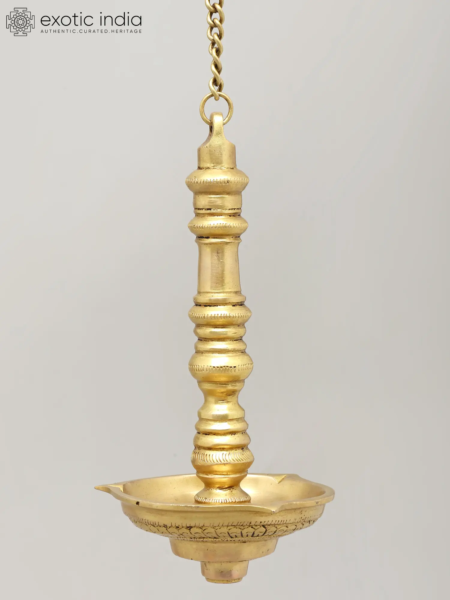 Each facet of this hanging lamp speaks of dedication and a deep understanding of metalcraft. The polished brass gleams with a rich patina, a result of skilled hands shaping and finishing the metal. The elongated, graceful form, suspended by a sturdy chain, allows it to be a focal point in any sacred space or a statement piece in your home decor. Its height, measuring 25 inches including the chain, makes it suitable for various ceiling heights, offering a versatile way to introduce a touch of divine ambiance. The bowl itself is designed to hold oil and wicks, ready to be illuminated and fill your surroundings with a gentle, sacred light. This lamp is more than an object; it is an heirloom in the making, imbued with the spirit of its creators and the timeless traditions it represents.