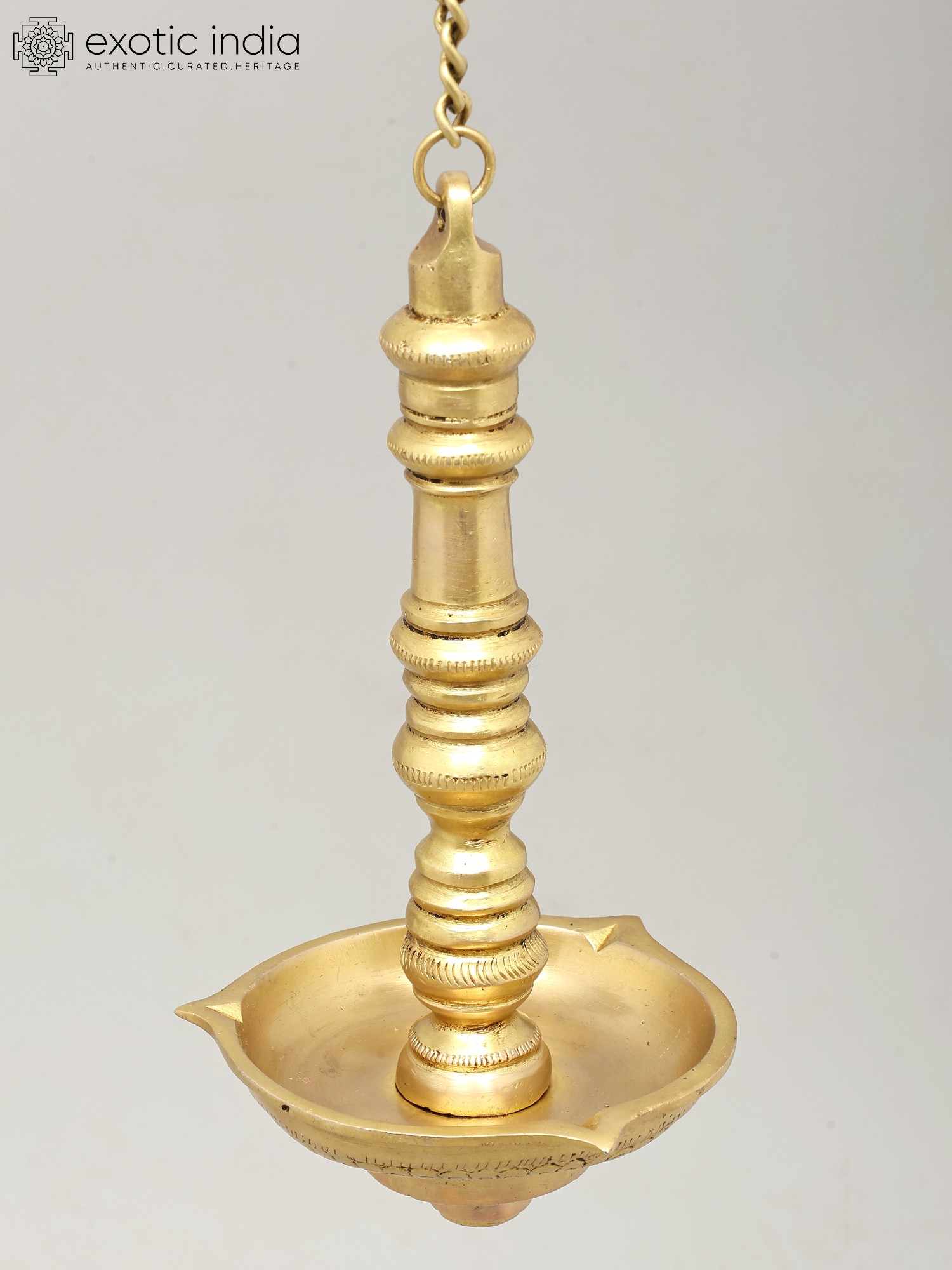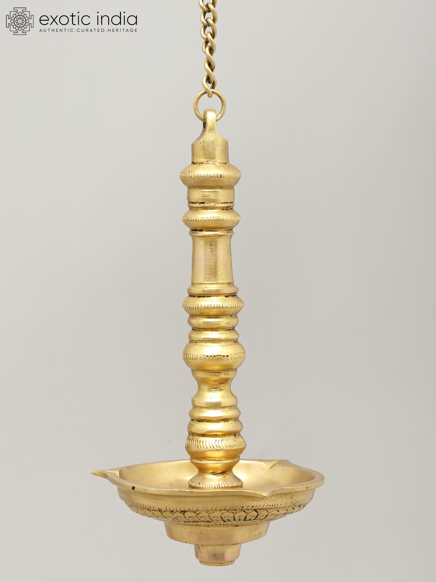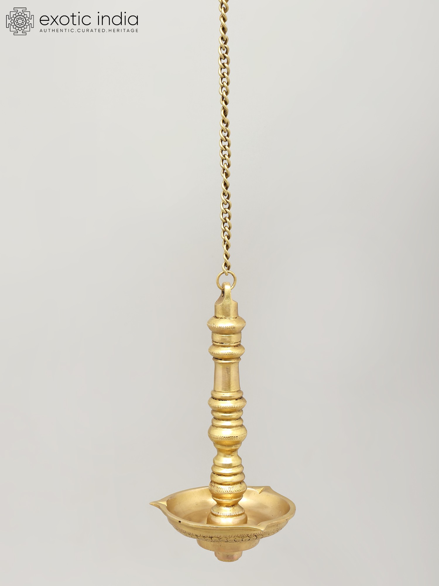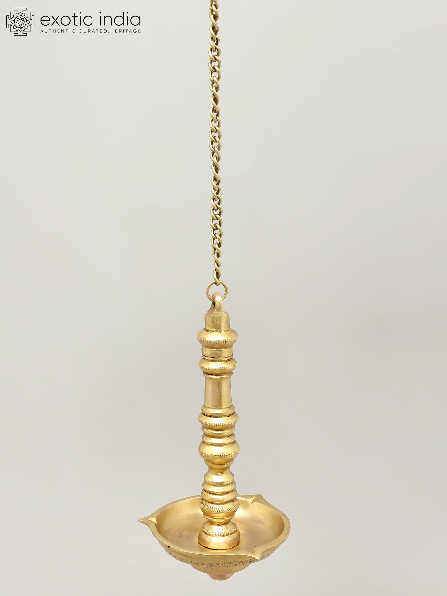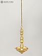 Each facet of this hanging lamp speaks of dedication and a deep understanding of metalcraft. The polished brass gleams with a rich patina, a result of skilled hands shaping and finishing the metal. The elongated, graceful form, suspended by a sturdy chain, allows it to be a focal point in any sacred space or a statement piece in your home decor. Its height, measuring 25 inches including the chain, makes it suitable for various ceiling heights, offering a versatile way to introduce a touch of divine ambiance. The bowl itself is designed to hold oil and wicks, ready to be illuminated and fill your surroundings with a gentle, sacred light. This lamp is more than an object; it is an heirloom in the making, imbued with the spirit of its creators and the timeless traditions it represents.
