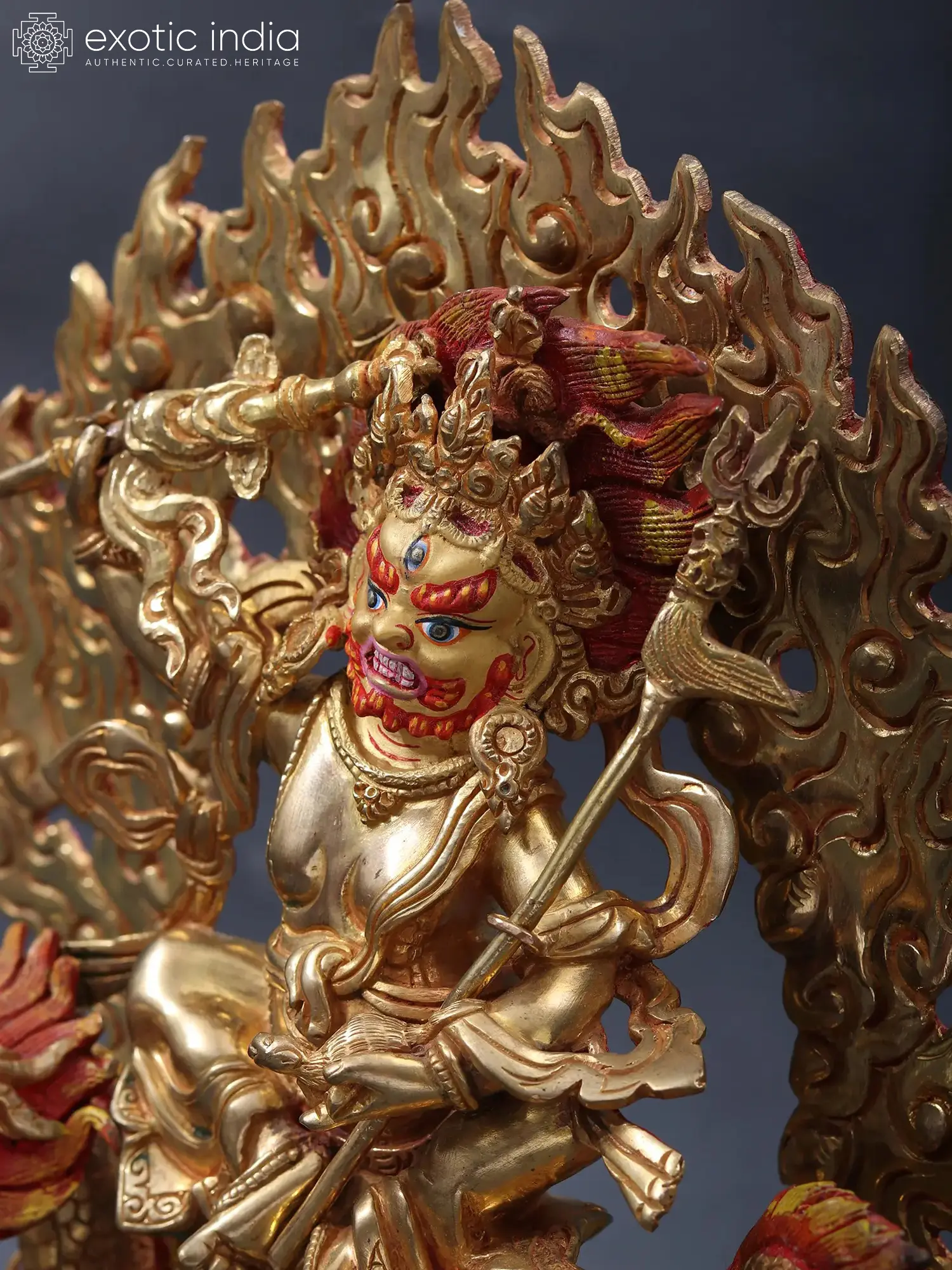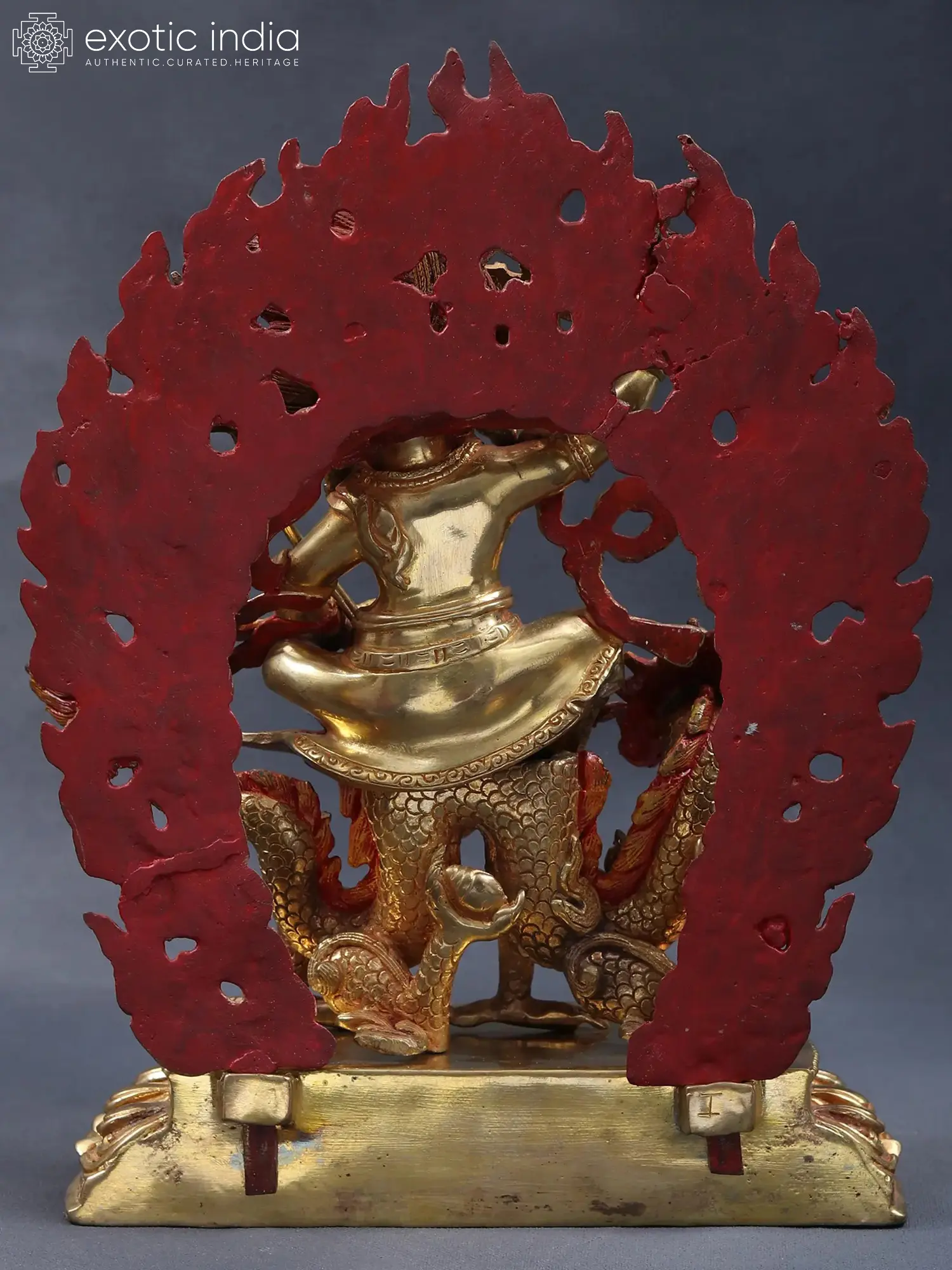 Kubera or Jambhala, the Buddhist Lord of Wealth is presented in this exquisite copper and gold statue from Nepal in a heavenly form, surrounded by the flames of enlightenment, seated on a majestic dragon- an animal that is representative of pure wisdom in Buddhist culture. His form balanced on the roaring dragon carries a brilliant energy, delineated by his three eyes and blazing tresses.