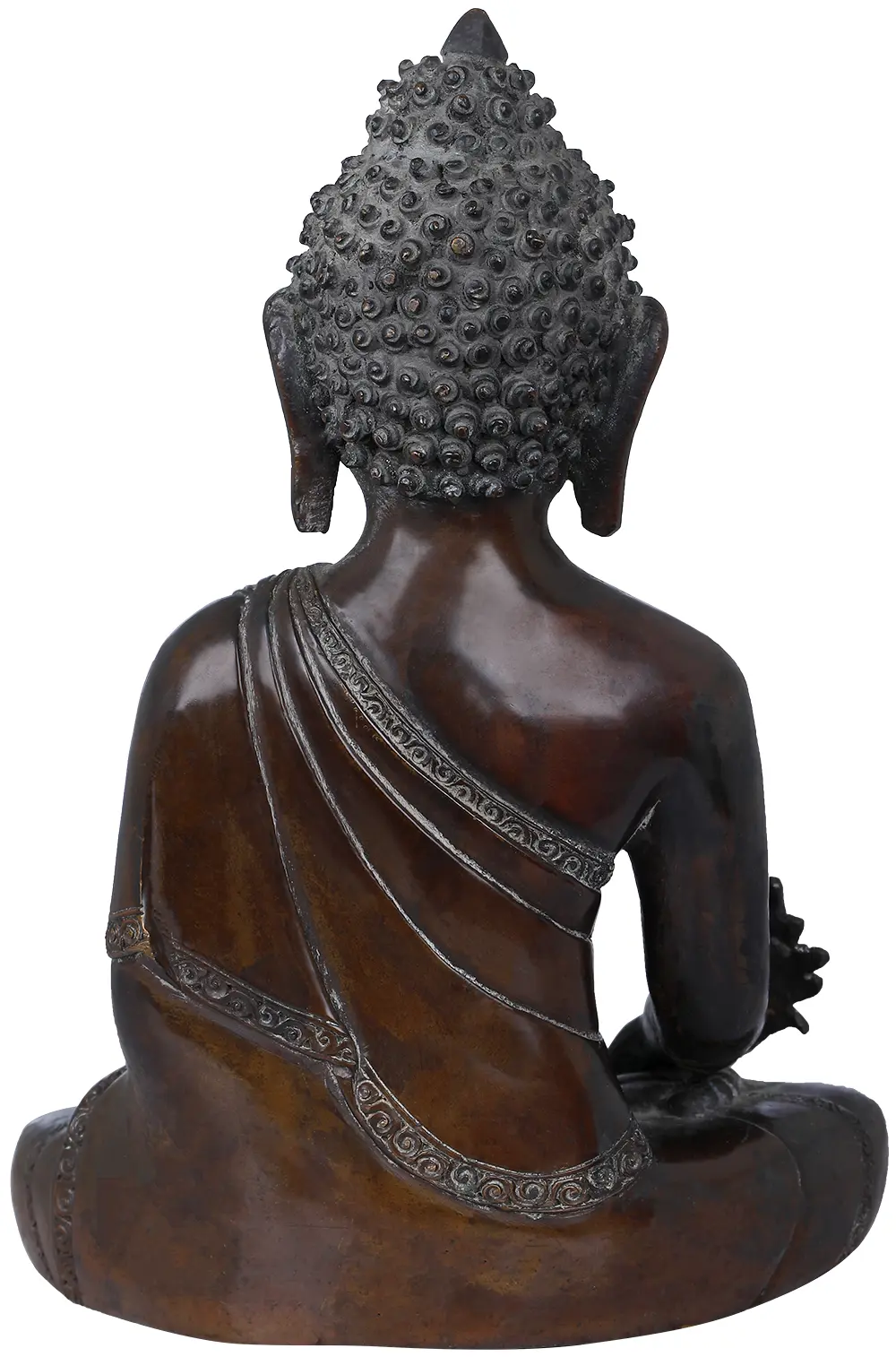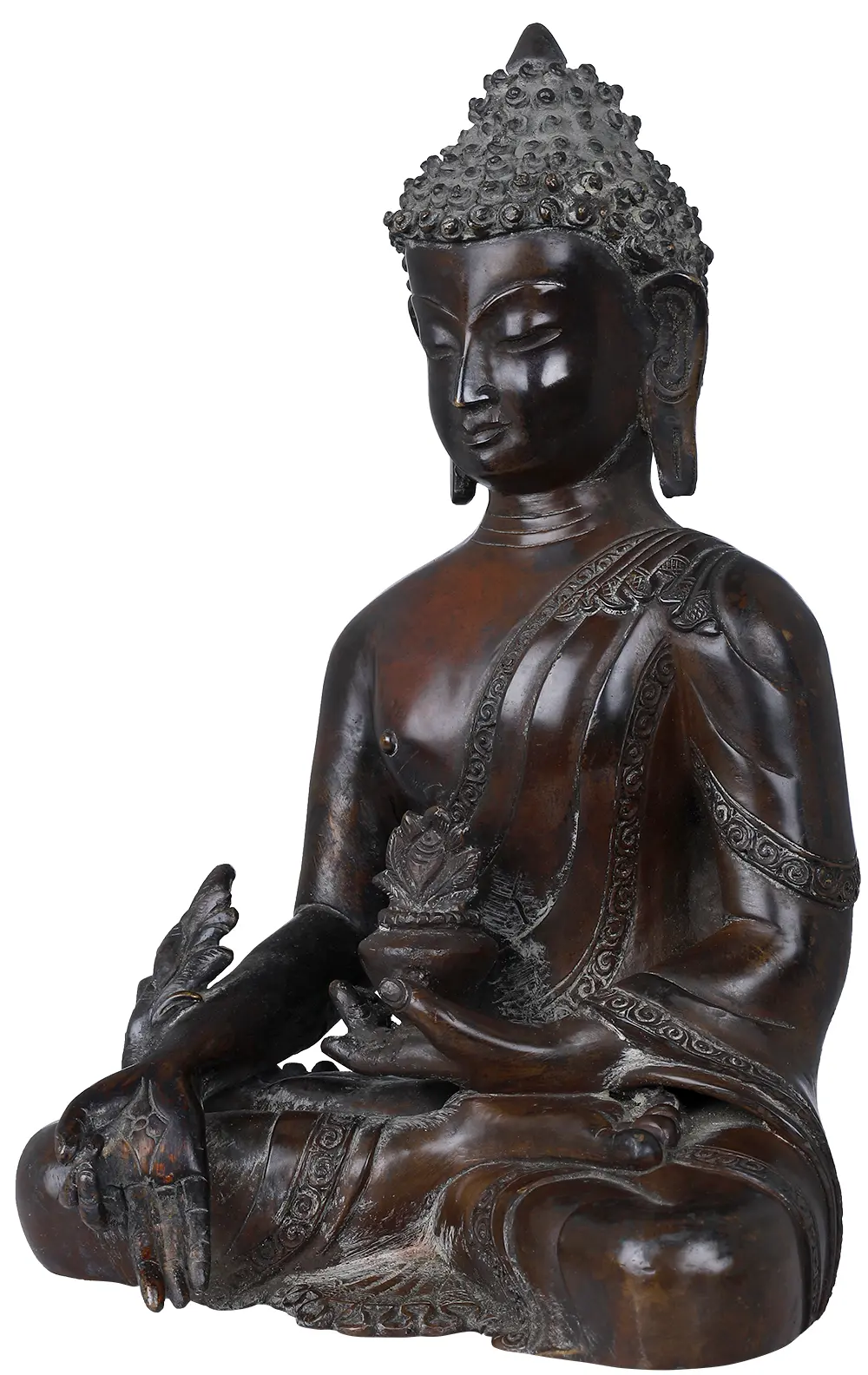 Sculpted in a royal lustre of cola shade, having a smooth, solid and glossy texture, Bhaisajyaguru sits in his usual cross-legged posture of padmasana and eyes closed in deep meditation. He is also known as ‘Medicine Buddha’ as he is the supreme healer, both for oneself as well as others. This statue is sculpted in Nepal having the characteristic art style of round face, restricted use of jewels and clothes and maintaining the simplicity. The sharp features and realistic expressions communicate that feel of spirituality directly to the viewer’s heart. As per Vajrayana tradition of Buddhism, any kind of illness can be cured by spiritual practices, whether it is physical or emotional like attachment, hatred or ignorance