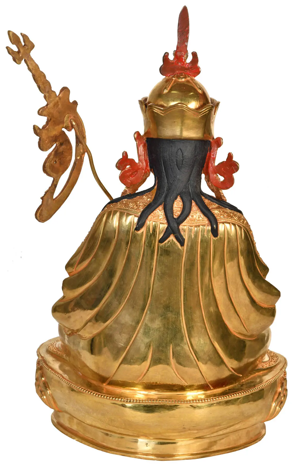 Now comes the most important part of Nepalese art which is gold gilding. This is done by the traditional fire gilding method. A mixture of mercury and 18K gold is applied on the surface of the statue and heat is applied using a flame torch. The result is that mercury evaporates along with impurities, leaving a pure 24K gold finish.