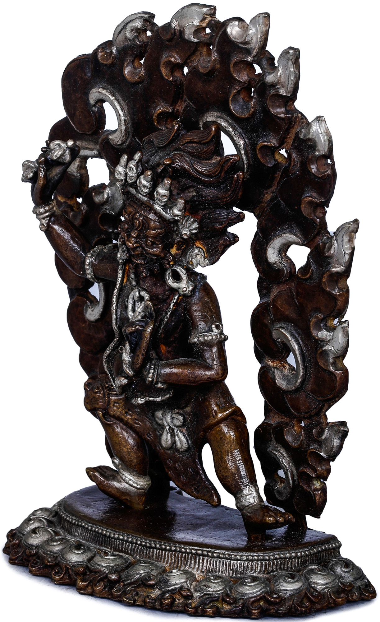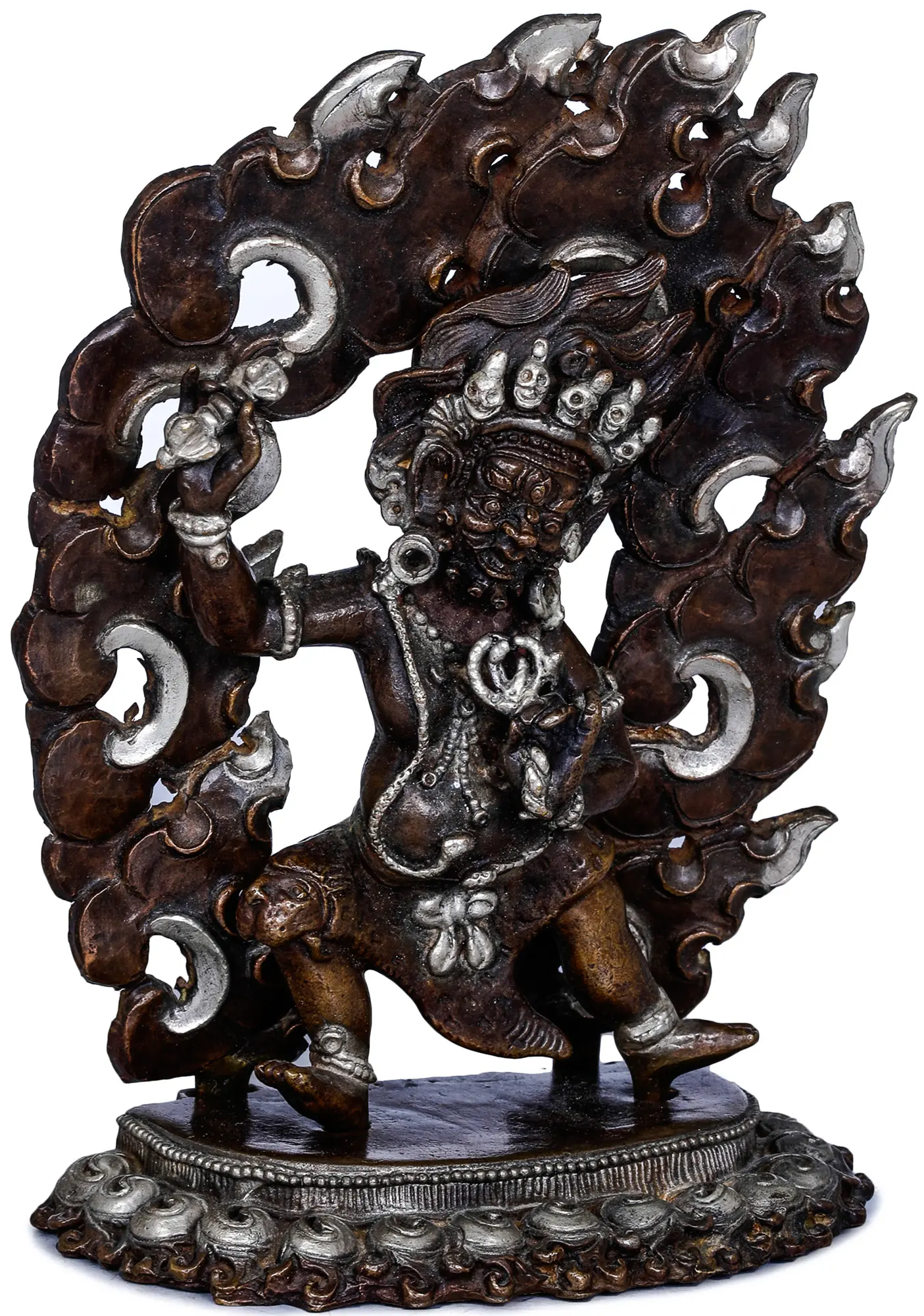 Hailing from Nepal, a land steeped in a rich spiritual heritage and renowned for its artistic traditions, this copper statue is a testament to centuries-old artisanal skills. The use of copper as the medium, combined with masterful sculpting and finishing techniques, results in a piece that is both visually striking and spiritually resonant. The contrasting silver accents highlight key features, adding depth and a celestial quality to the deity's form. This statue is not merely an object of art, but a sacred representation, crafted with reverence and intended to inspire devotion and contemplation. Its compact size makes it ideal for personal altars, meditation spaces, or as a meaningful gift for those seeking protection and strength on their spiritual journey.