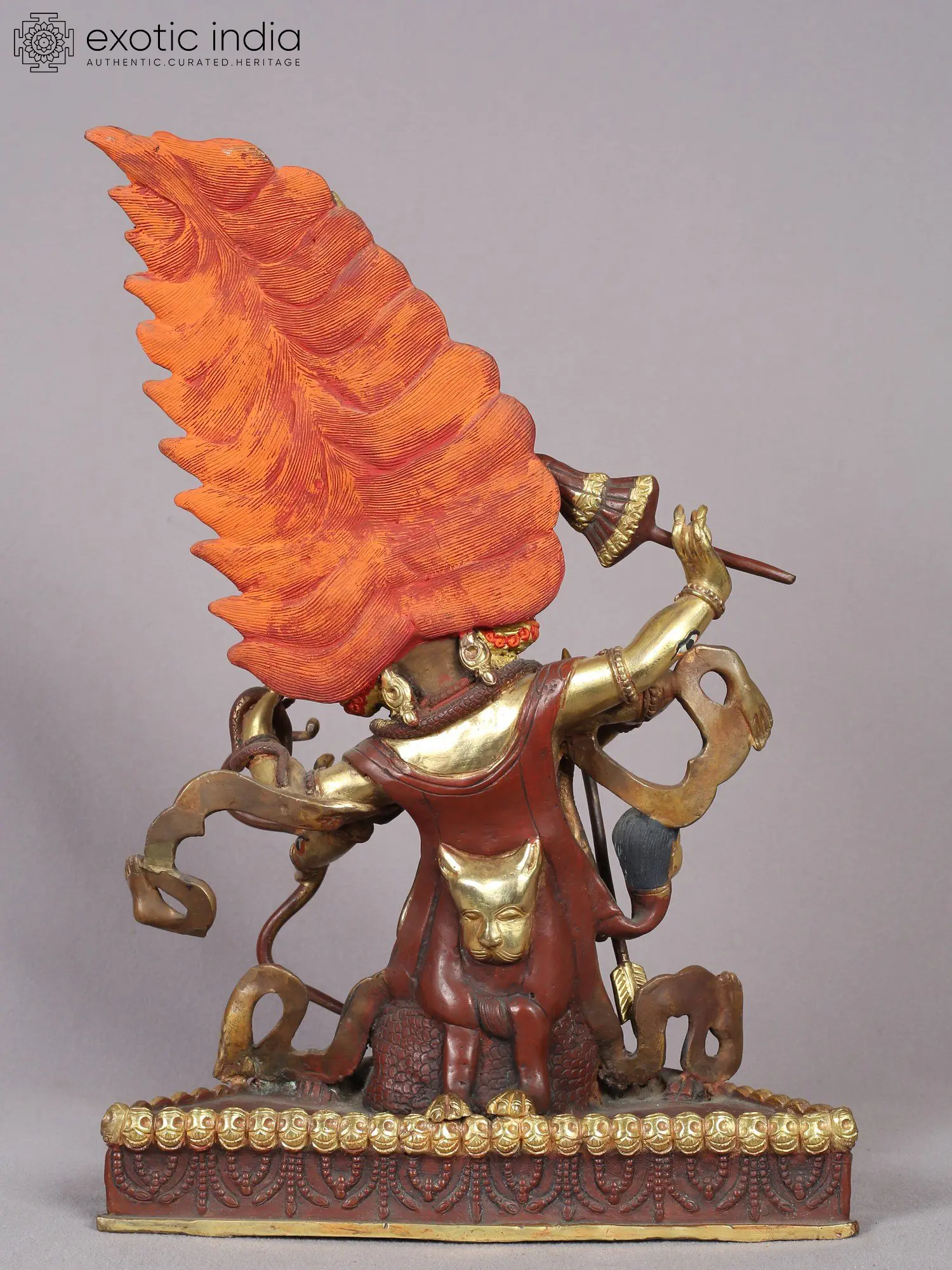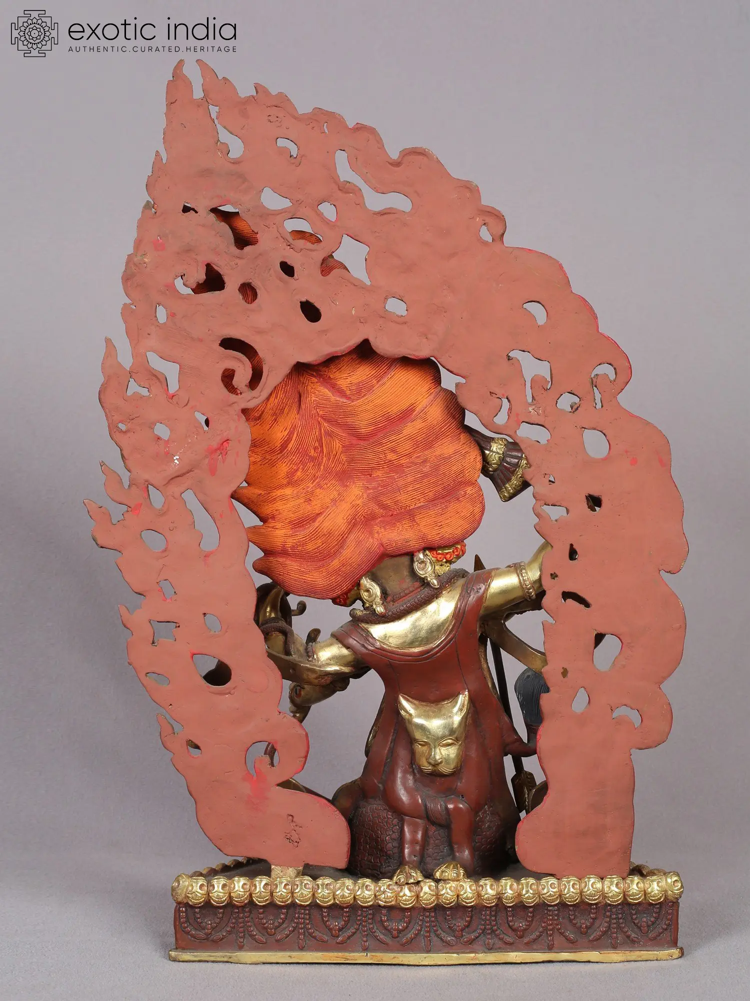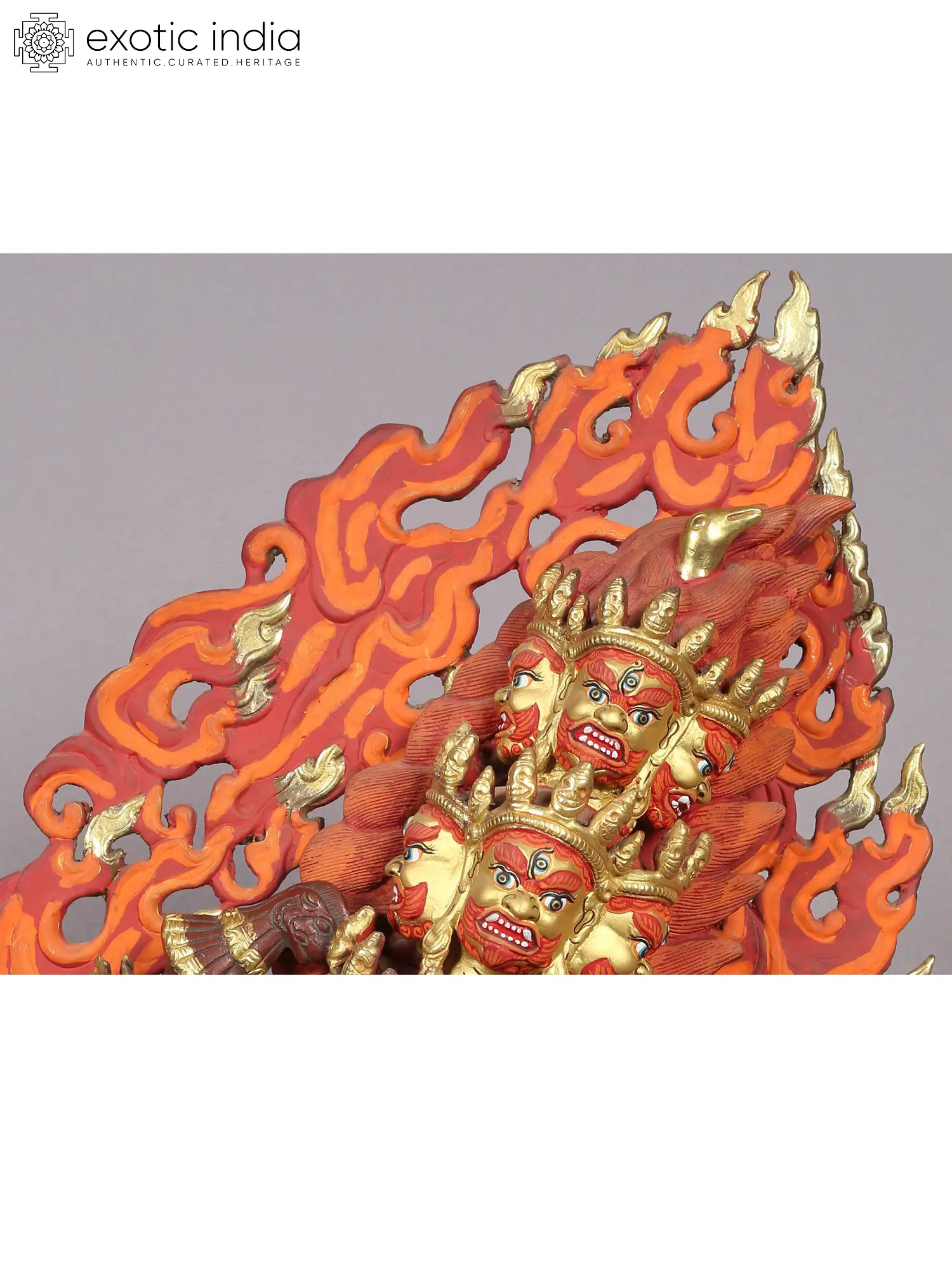 In the Nyingma school of Himalayan Buddhism, Rahula is a wrathful protective deity, with nine ferocious faces stacked one upon the other and a giant gaping face on his torso. This gilded copper Nepalese statue of Rahula brings the majestic guardian deity on a jeweled platform, lined with skulls. A fiery aureole surrounds his dynamically positioned body, a raven on the skull crown adorns his head, and ornaments of severed heads enhance the ethereal appearance of his icon. Armed with multiple weapons, Rahula in this statue soothes and astounds the onlooker with his powers.