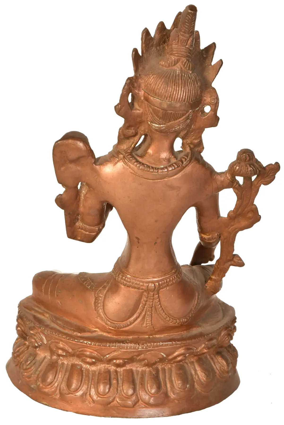 This exquisite brass statue captures the serene presence of Green Tara, a revered bodhisattva in Tibetan Buddhism. Known as the "Mother of Liberation," Green Tara embodies active compassion, swiftness, and the dispelling of fear and obstacles. Her form, meticulously rendered in warm brass, radiates an aura of peace and protective energy, making her a powerful focal point for meditation, devotion, or simply as a beautiful object of spiritual contemplation.