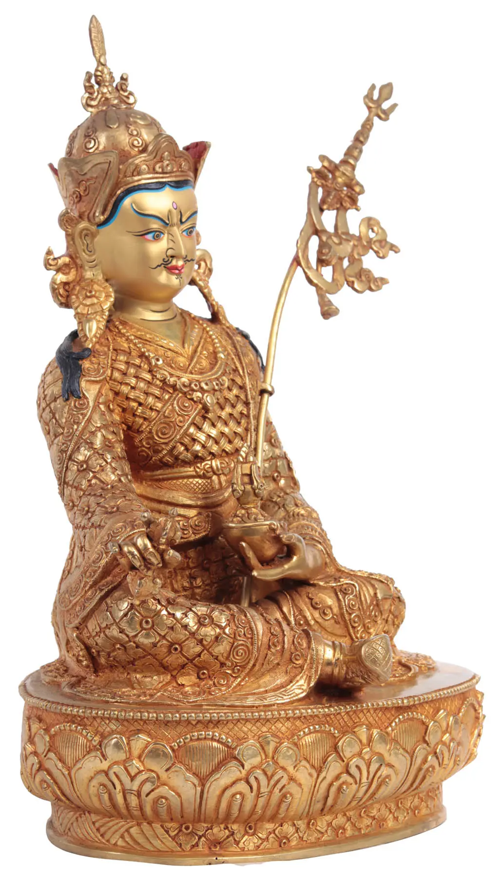 This magnificent representation of Guru Padmasambhava serves as a powerful reminder of the path to liberation and the enduring legacy of his teachings. In Tibetan culture, he is invoked for protection, guidance, and the removal of obstacles on the spiritual journey. Possessing this statue is not merely acquiring a beautiful object; it is inviting the blessings and wisdom of one of Buddhism's most revered masters into your sacred space. Its presence can inspire mindfulness, foster devotion, and serve as a constant source of spiritual strength and solace. Crafted with devotion and an unwavering commitment to traditional aesthetics, this gilded copper statue is a testament to the profound spiritual heritage of Nepal and a treasure for any practitioner or admirer of Tibetan Buddhist art.