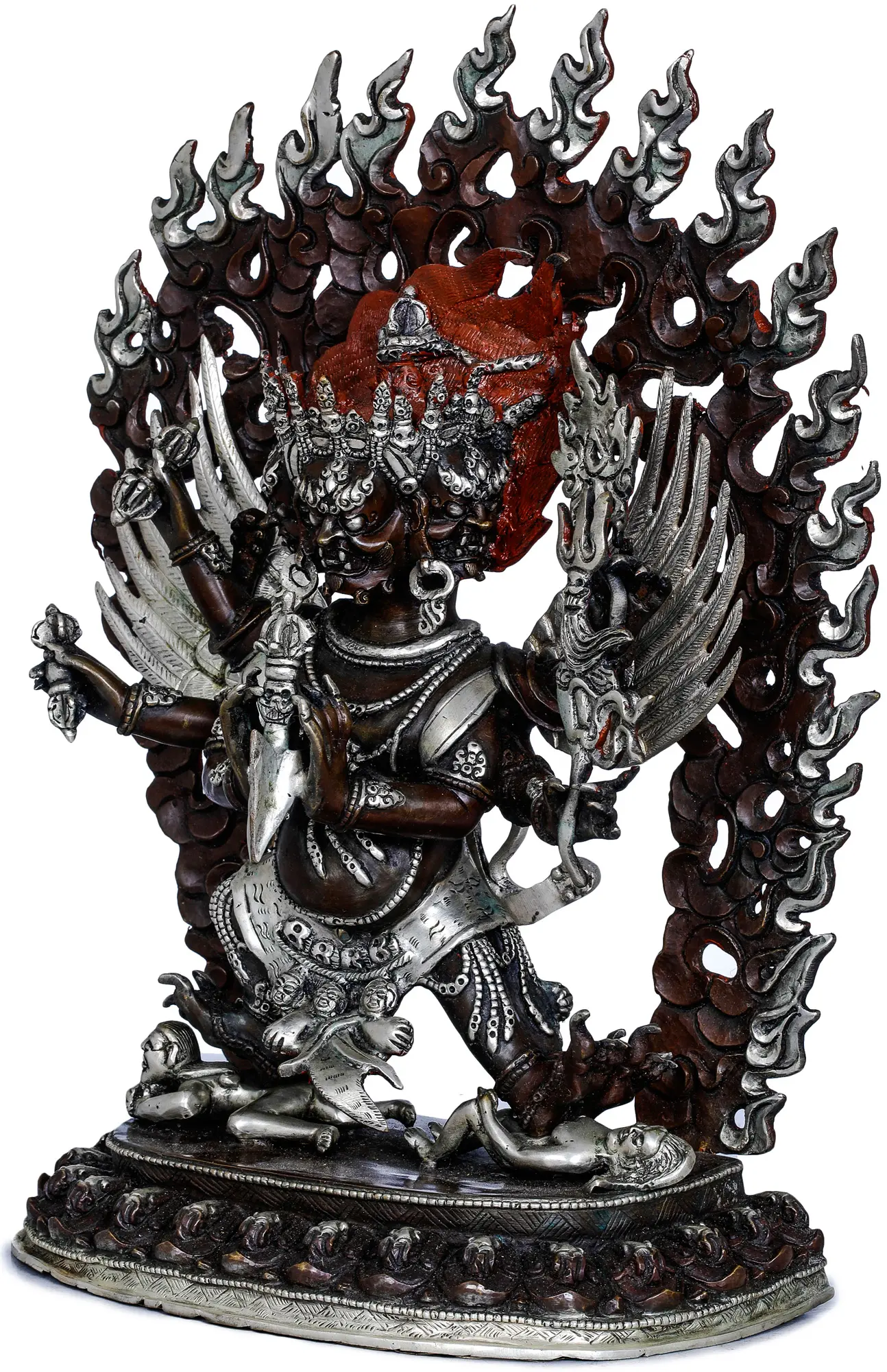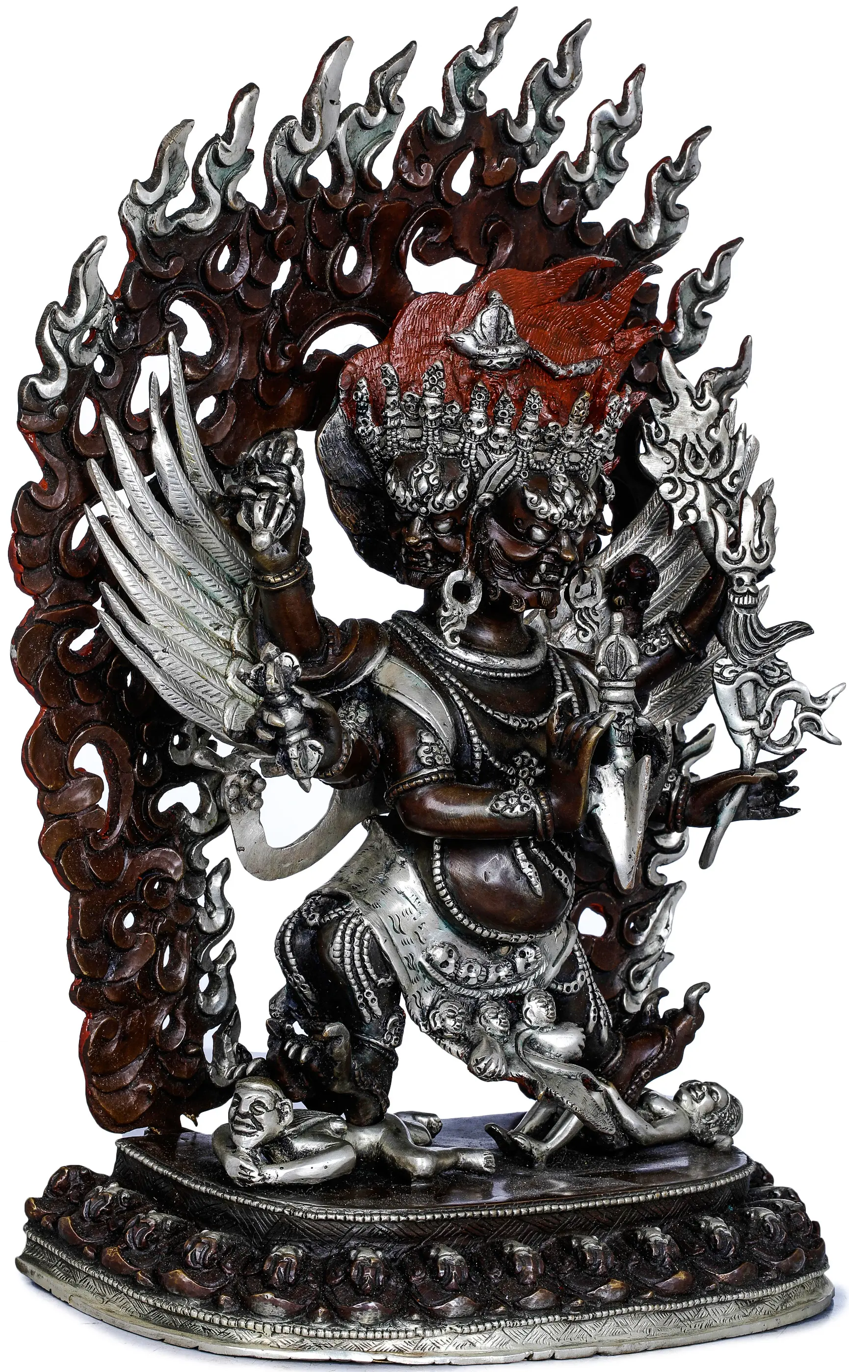 This exquisite statue is a testament to the skill of Nepalese artisans, who have preserved traditional methods of metalwork for generations. Fashioned from high-quality copper, the statue has been expertly sculpted and finished to highlight the intricate details of the divine form. The application of contrasting patinas further enhances the visual depth, bringing out the dynamic musculature, the fierce facial features, and the delicate adornments. The detailed rendering of the flaming halo, the skulls, and the various symbolic implements held by the deity showcases a profound understanding of Buddhist iconography and a masterful command of the medium. Each element, from the powerful stance to the menacing yet ultimately compassionate expression, is rendered with precision and devotion, creating a powerful and evocative representation of a significant Buddhist protector.
