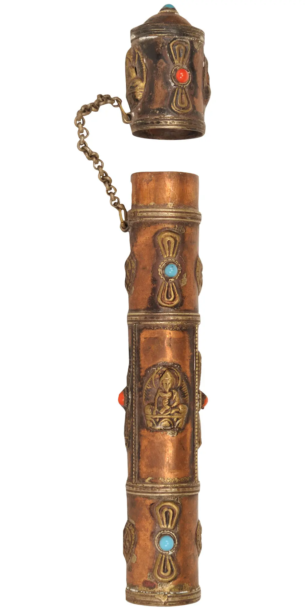 The cylinder is thoughtfully segmented, with each section featuring meticulously detailed figures and patterns. You'll discover representations of deities or enlightened beings, perhaps Shakyamuni Buddha himself, seated in meditative posture, radiating serenity and wisdom. These figures are often depicted within decorative frames, evoking the sacred mandalas used in tantric practice, which represent the universe and the path to enlightenment. The presence of turquoise and coral stones, traditionally believed to possess protective qualities and to enhance spiritual awareness, further imbues this holder with auspicious power. The chain and rings, a delicate detail, suggest its original purpose was not only functional but also ornamental, perhaps allowing it to be worn or hung in a place of reverence. ––––––––––––––––––
