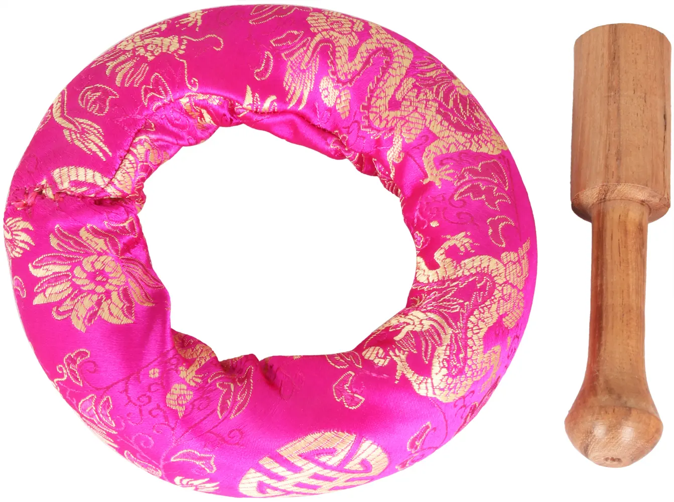 Each singing bowl is a testament to the dedication and skill of its creators. The careful craftsmanship ensures a bowl that is not only beautiful but also produces a rich, sustaining tone when struck or rimmed. The included wooden striker, smooth and comfortable to hold, is perfectly balanced to elicit the bowl's full sonic potential. Resting upon a vibrant, intricately patterned cushion, this set brings an aesthetic as well as an auditory delight to any space. The cushion, often adorned with auspicious symbols like the Endless Knot, further signifies good fortune and interconnectedness.