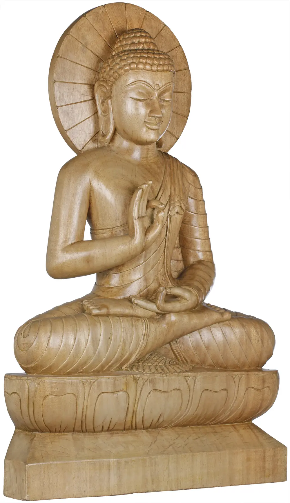 Bring the profound serenity and timeless wisdom of the Buddha into your sacred space with this exquisite hand-carved wooden statue. Depicting Lord Gautama Buddha in a posture of serene contemplation and profound teaching, this piece captures the very essence of enlightenment. The Buddha is seated in the lotus position, a symbol of purity and spiritual growth, with his legs crossed in perfect meditation. His hands are held in the Abhaya Mudra, with the right hand raised and palm facing outward, signifying protection, fearlessness, and reassurance – the very gesture he would have used to calm his disciples and dispel their anxieties. ––––––––––––––––––––