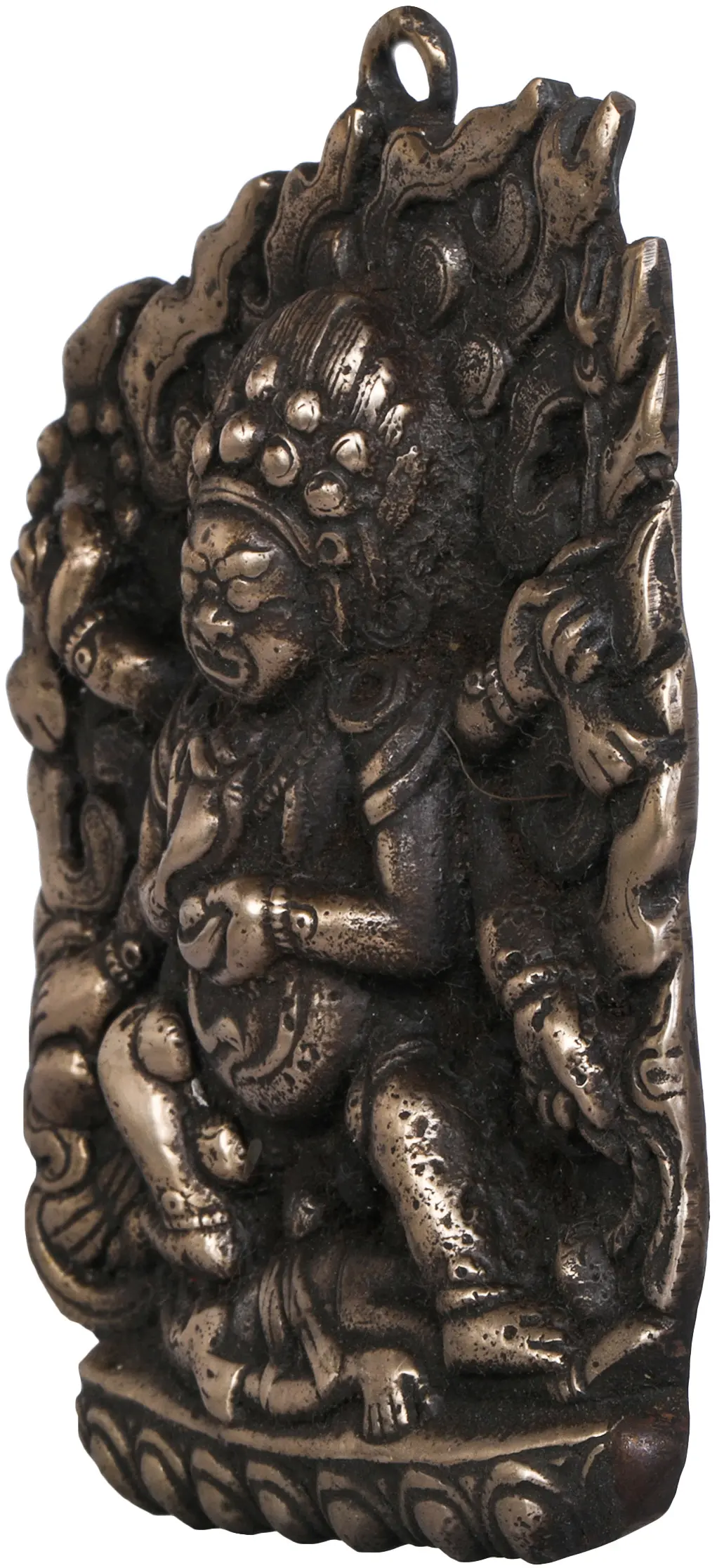 The artistry of this piece captures the essence of Mahakala's powerful presence in a compact and intricate form. The copper material lends a timeless quality, its subtle patina hinting at the ancient traditions from which this iconography originates. Each detail, from the serene yet fierce visage to the numerous hands and symbolic attributes, is rendered with remarkable precision. This wall hanging is more than just an object of art; it is a conduit for invoking protection and spiritual strength. It can serve as a personal altar piece, a powerful amulet, or a beautiful reminder of the inherent power of the awakened mind to conquer all adversities. Its size makes it suitable for a variety of spaces, bringing a sense of sacredness and protective energy wherever it is placed.