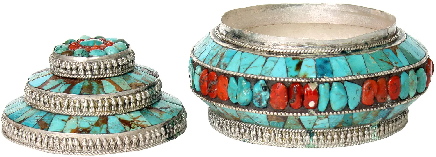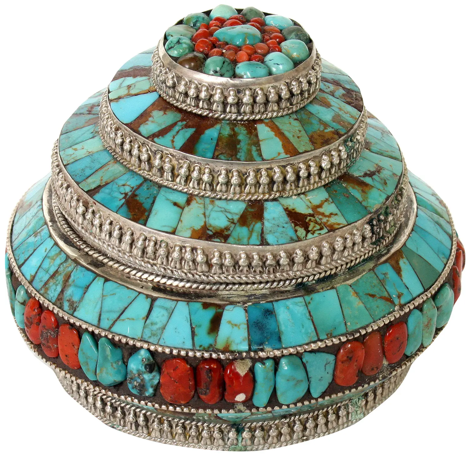 This exquisite sterling silver box, meticulously inlaid with vibrant turquoise and fiery red coral, is more than just a decorative item; it is a tangible representation of profound cosmic and spiritual concepts. Its tiered, pyramidal structure evokes Mount Meru, the sacred five-peaked mountain that, in Buddhist cosmology, is considered the center of all universes, the axis mundi. Imagine this box as a miniature Mount Meru, holding within its depths not just treasures, but a microcosm of the sacred realm. The intricate silver detailing, resembling a band of tiny figures, can be interpreted as a celestial procession or a gathering of guardian deities, encircling the sacred mountain and protecting its essence.
