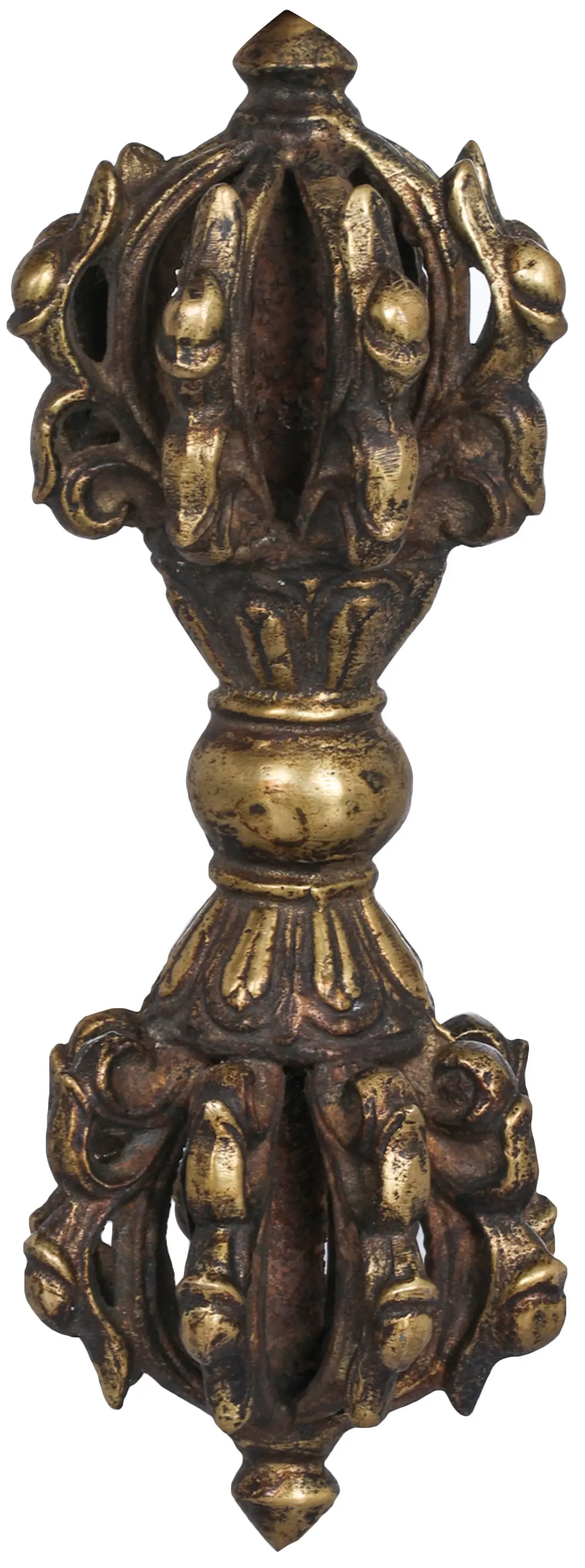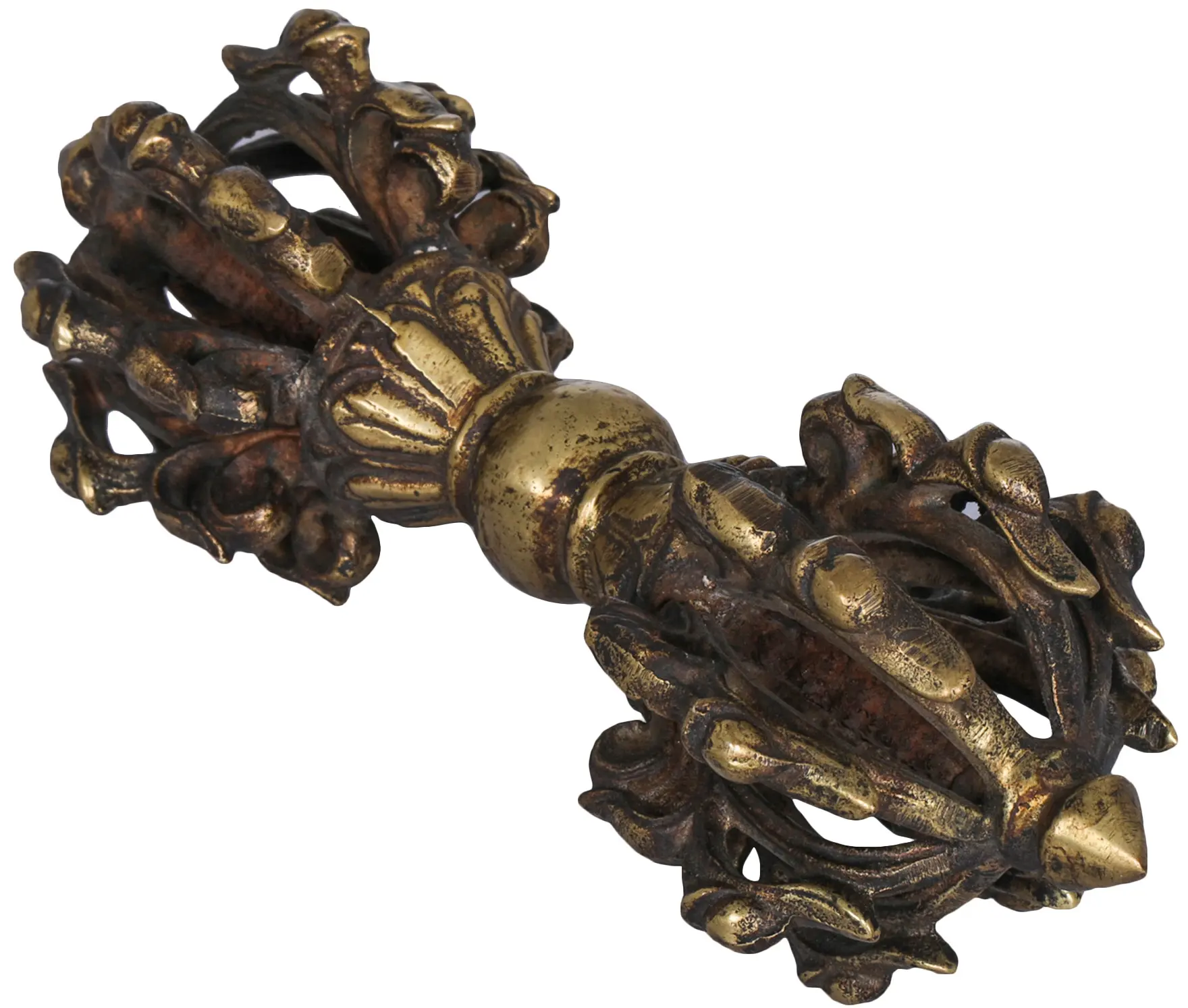 Each dorje is a testament to the enduring artistry of Nepalese craftspeople, who imbue their creations with devotion and skill. The brass material lends a substantial feel to the object, while the intricate detailing speaks to generations of artistic tradition. The aged patina of the brass adds to its authentic charm, suggesting a history of spiritual practice and reverence. This particular dorje, with its balanced proportions and the precise rendering of its nine prongs, embodies the profound symbolism it carries. Its compact size makes it ideal for personal altars, meditation spaces, or as a meaningful adornment for those seeking to connect with the rich spiritual heritage of Tibet.