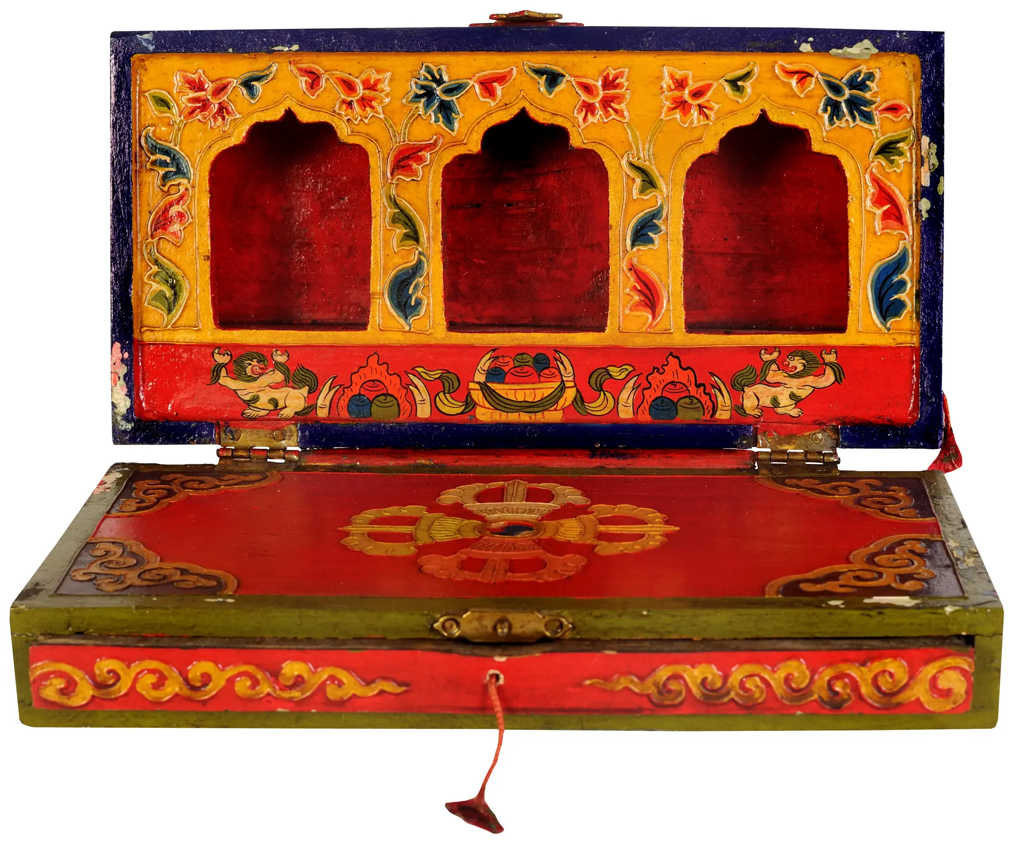 The sides of the altar are painted in a striking deep red, a color often associated with auspiciousness, passion, and protection in many Asian cultures. Adorning this vibrant backdrop are swirling golden patterns that echo the auspicious clouds (lungta) often depicted in Tibetan art. These clouds represent good fortune, the breath of life, and the auspicious winds that carry prayers and blessings across the land. The ornate brass clasps and central embellishment are more than mere decorative elements; they are guardians of the sacred space within, ensuring that what is kept here is protected and revered. The central emblem, with its circular design and colorful inlays, evokes the Wheel of Dharma, the eight-spoked wheel that symbolizes the Buddha's noble eightfold path to liberation. ––––––––––––––––––
