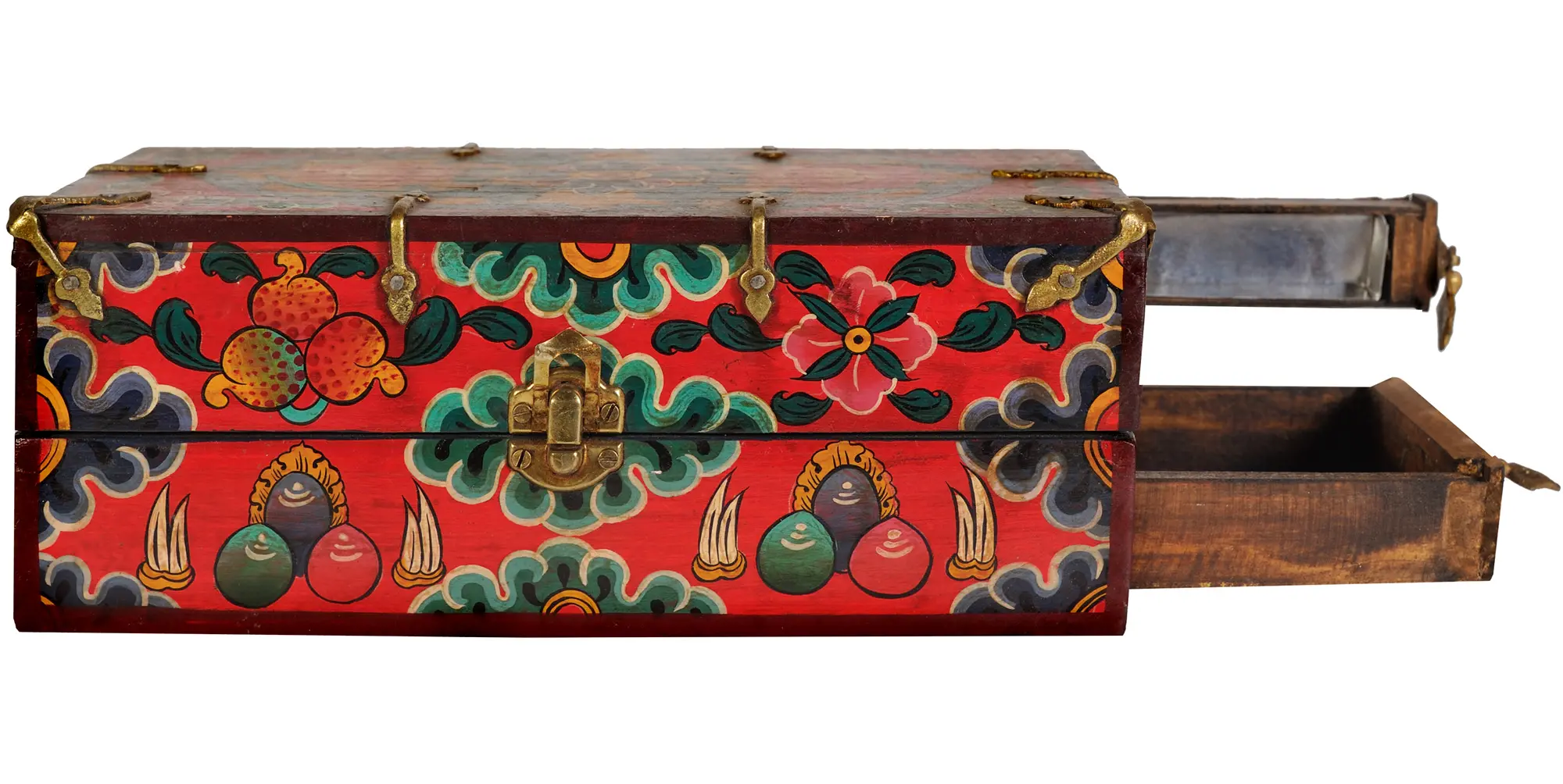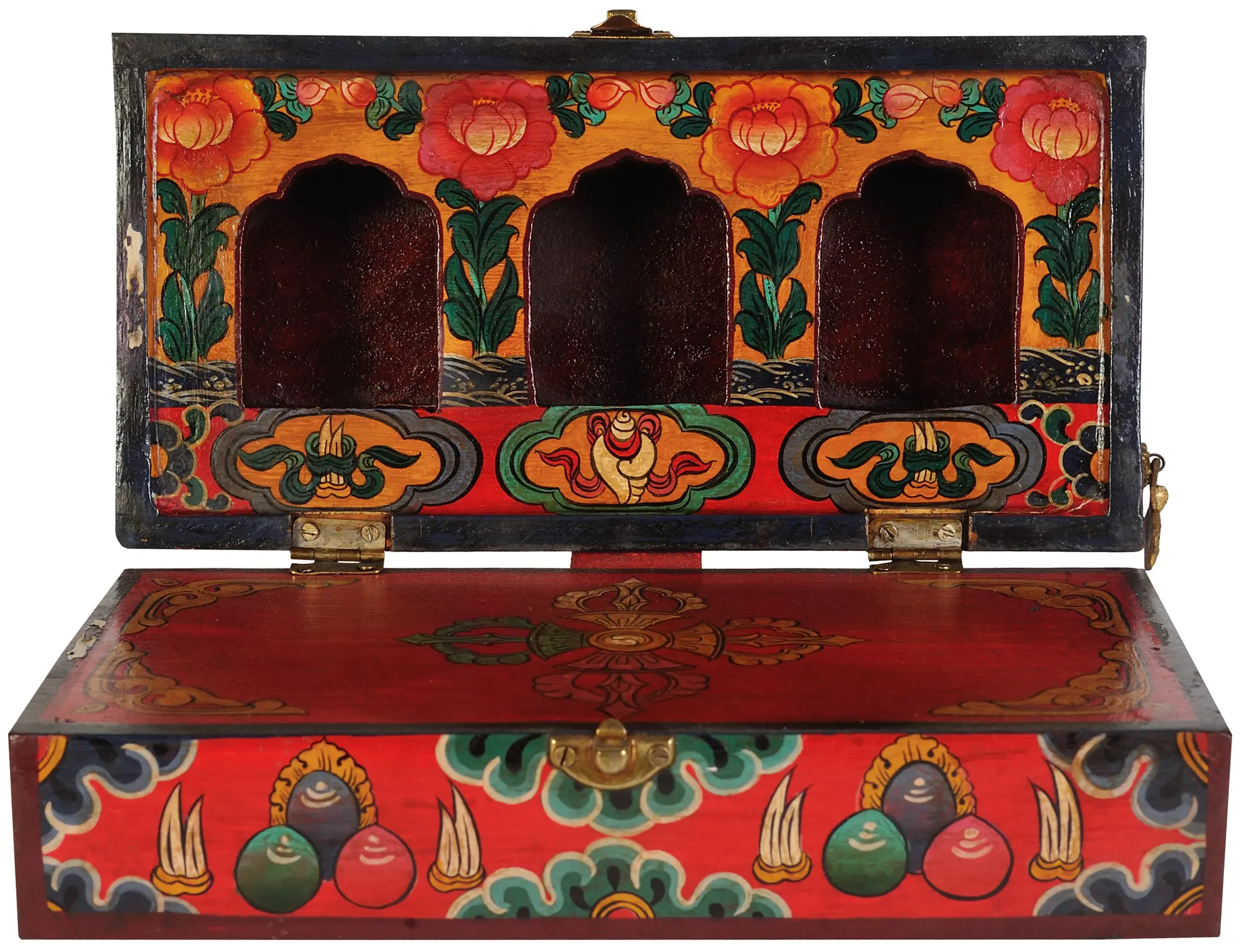 This exquisite wooden box is more than just a container; it is a portable sanctuary, a vessel designed to hold your most cherished devotional items and bring a touch of sacred presence wherever you go. Crafted with traditional artistry, its vibrant red lacquered finish serves as a striking canvas for a rich tapestry of symbolic imagery. The intricate hand-painted motifs evoke the deep spiritual heritage of Tibetan Buddhism, transforming a functional object into a work of devotional art. ––––––––––