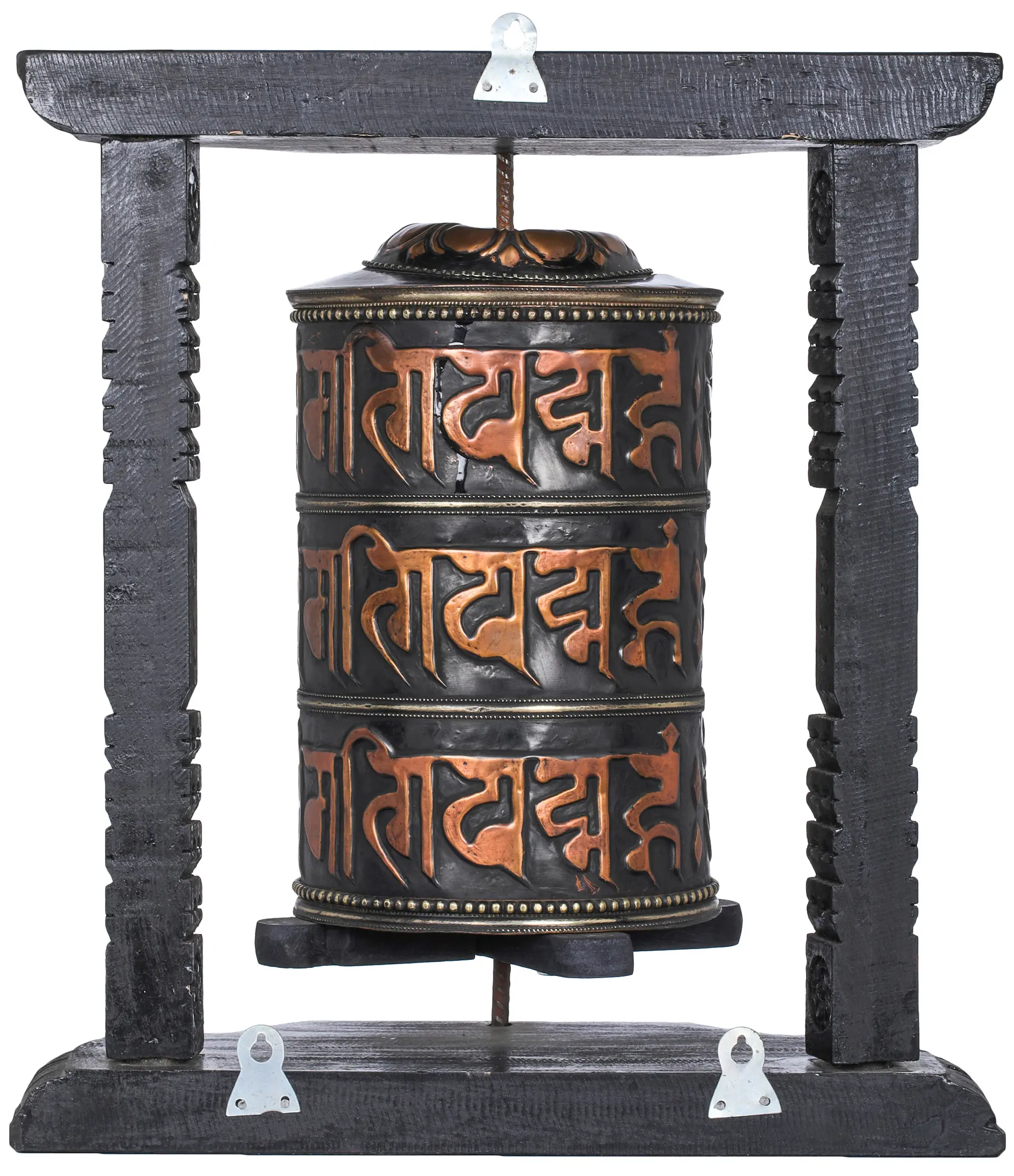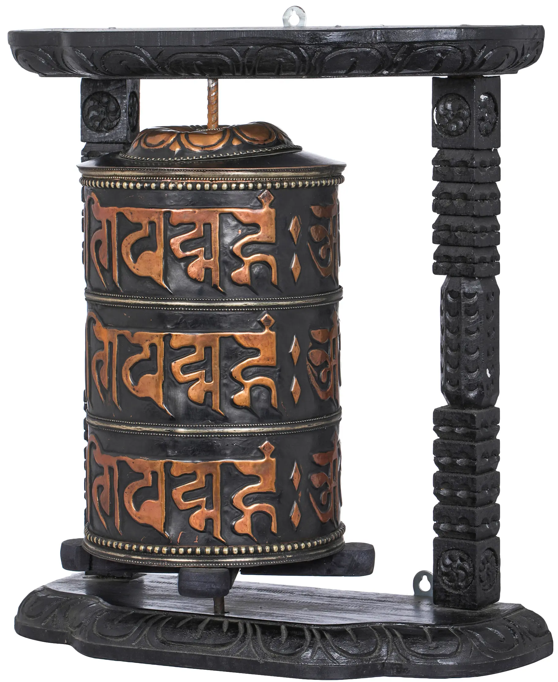 This prayer wheel is a testament to the skill and devotion of Nepalese artisans. The cylindrical body, made from sturdy copper, is adorned with the intricate Tibetan script of the mantra, each letter a work of art in itself. The copper's warm, earthy tones contrast beautifully with the deep, rich black of the intricately carved wooden stand. The stand, also a product of masterful woodworking, features traditional floral motifs and symbolic carvings, enhancing the overall aesthetic and spiritual aura of the piece. Its substantial size makes it a striking focal point in any meditation space, altar, or room dedicated to tranquility.