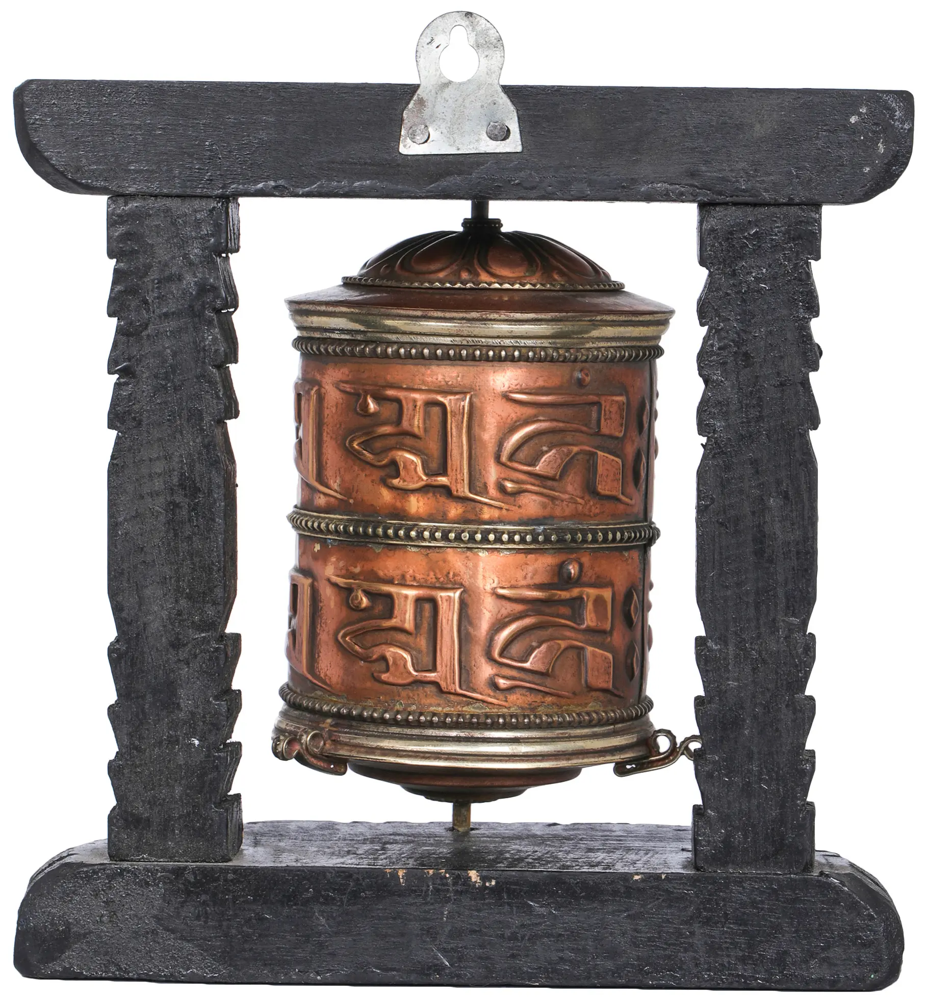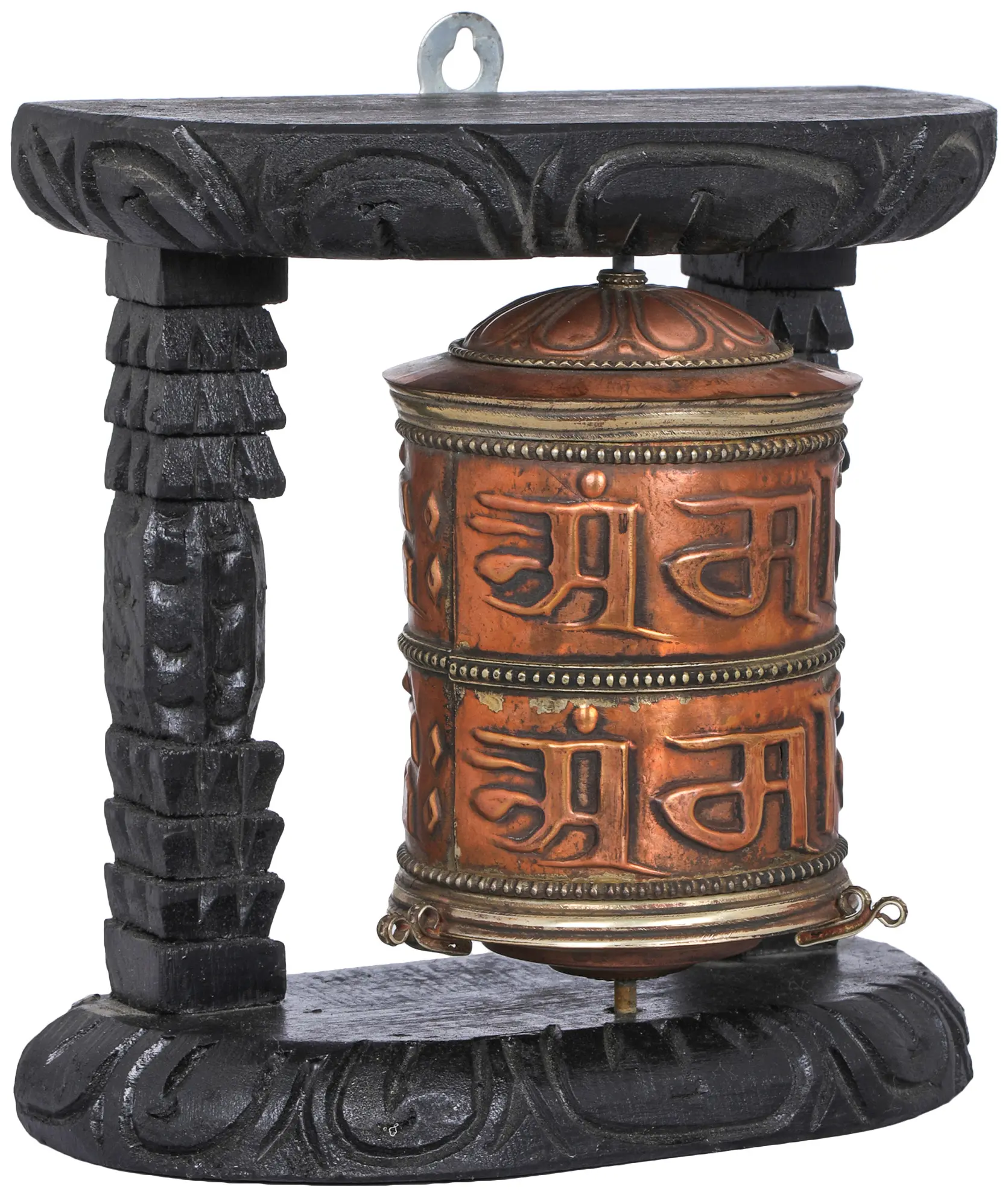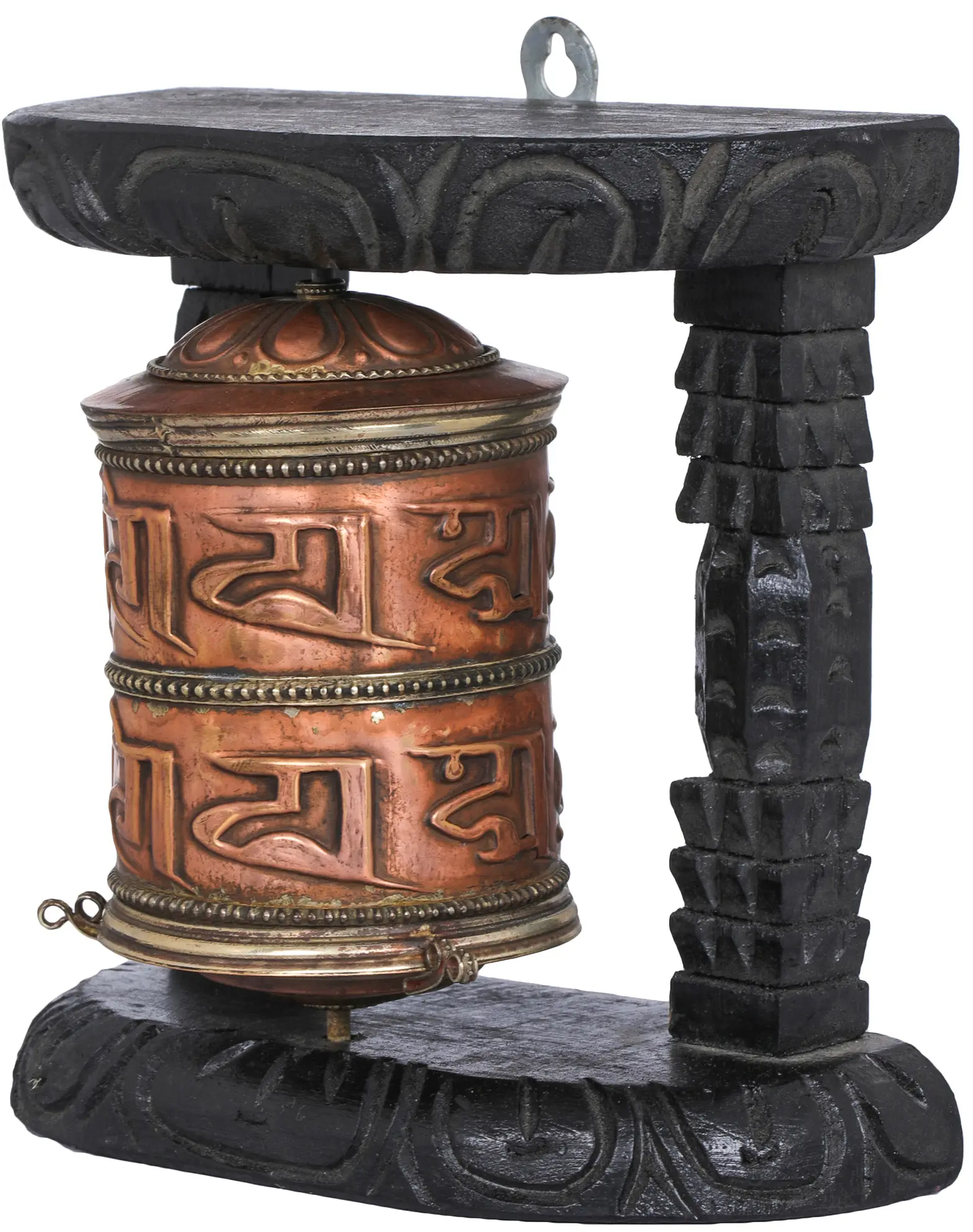 This prayer wheel features a beautifully detailed copper cylinder adorned with ancient Tibetan script, believed to be the mantra "Om Mani Padme Hum." This sacred mantra, a core teaching of Tibetan Buddhism, is a profound invocation to compassion and wisdom. The copper cylinder is intricately engraved, showcasing the dedication and skill of the artisans. It is encased within a sturdy and artistically carved wooden structure. The dark, richly finished wood provides a striking contrast to the warm hue of the copper, highlighting the sacred inscription. The detailed carvings on the wooden base and pillars evoke the traditional artistic motifs found in Himalayan monasteries, adding an authentic cultural resonance to the piece.