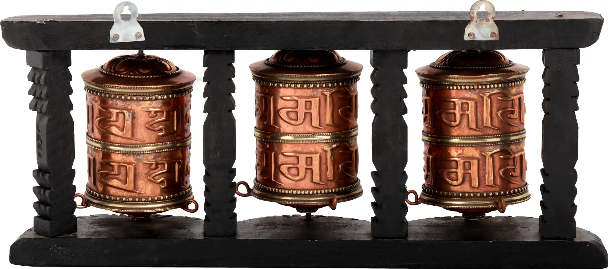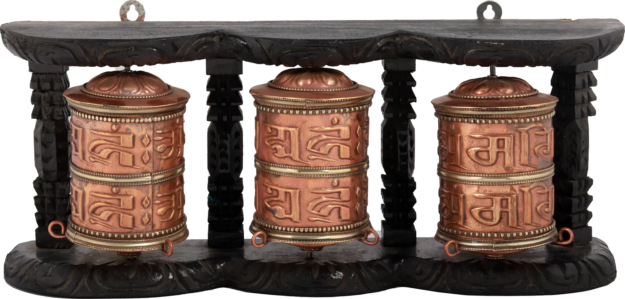Immerse yourself in the serene spiritual ambiance of the Himalayas with this exquisite tri-wheel prayer ensemble, meticulously crafted in Nepal. This artifact is more than just an object of beauty; it is a tangible representation of deep-rooted Tibetan Buddhist traditions, designed to bring peace, wisdom, and merit to its surroundings. The core of this piece features three intricately decorated copper cylinders, each representing a vital aspect of the spiritual journey. The mesmerizing Tibetan script, famously the mantra "Om Mani Padme Hum," is deeply embossed onto the copper, signifying compassion, purity, and the path to enlightenment.