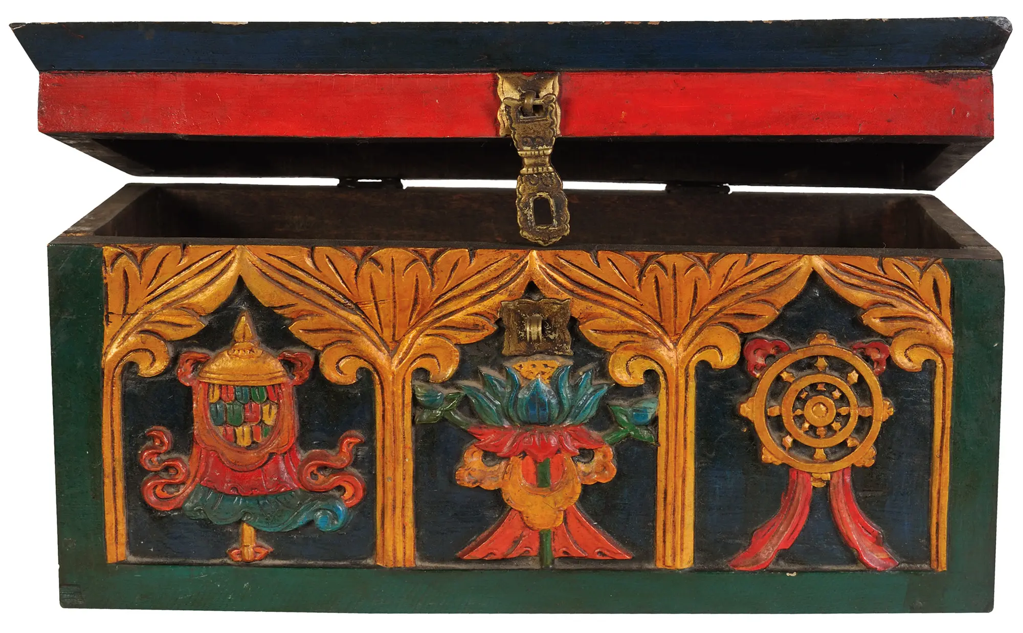 Tibetan Buddhist Ritual Box with Auspicious Ashtamangala Symbols