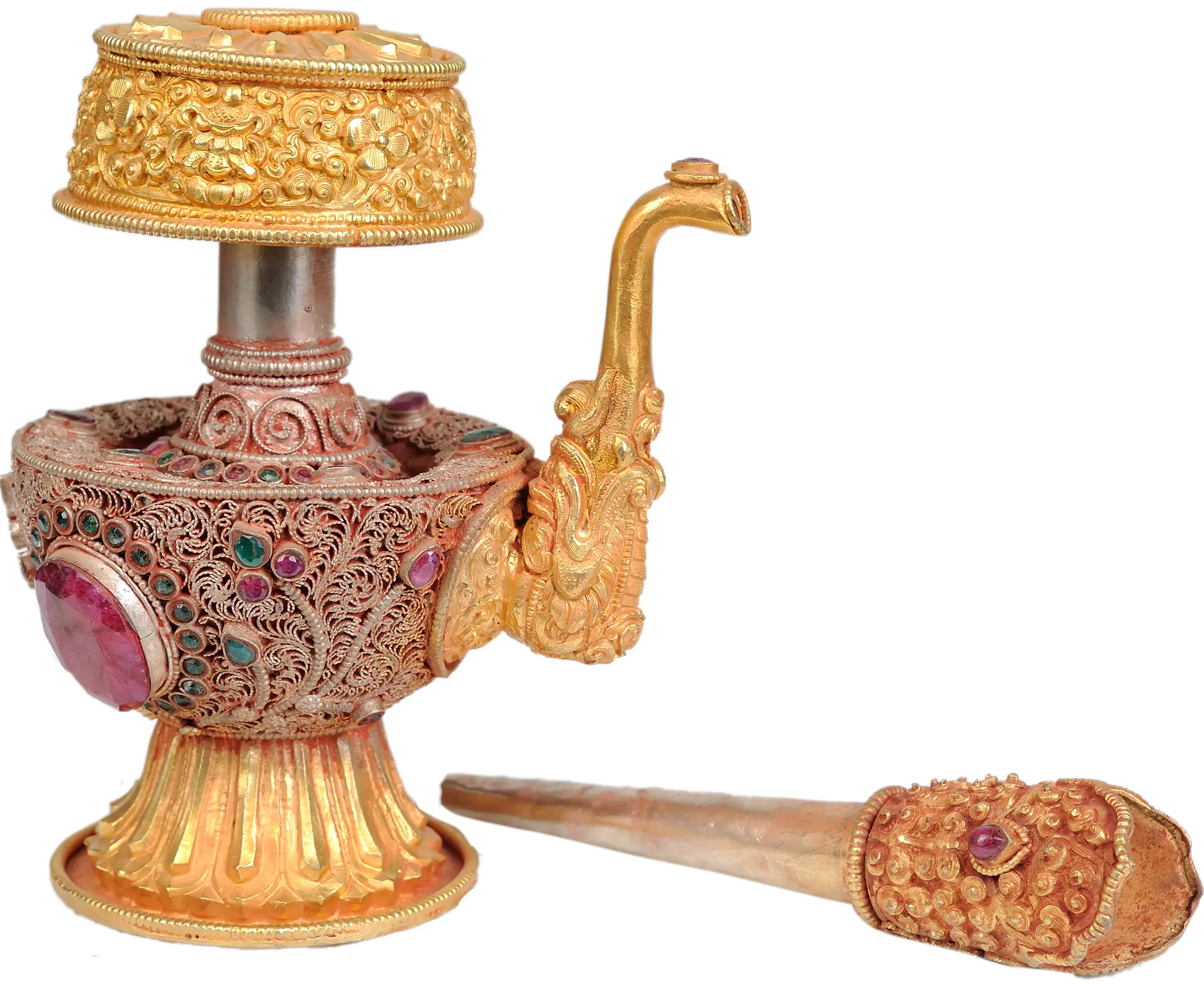Enter a realm where artistry meets spirituality with this meticulously crafted ritual implement, a testament to the rich artistic traditions of Nepal. Designed for use in sacred Buddhist ceremonies, this stunning object embodies purity and the transformative power of water. The kettle's elegant form and intricate detailing serve as a visual representation of the profound spiritual principles at the heart of Tibetan Buddhism.
