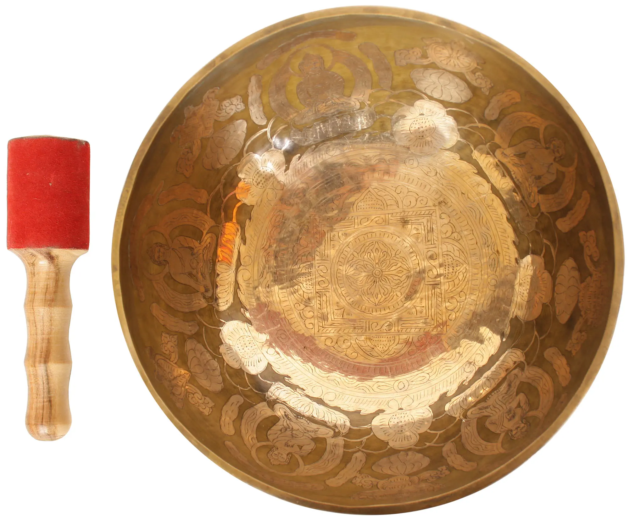 Crafted from a premium brass alloy, this ceremonial bowl showcases exceptional artistry and dedication. Each detail is meticulously etched by skilled hands, reflecting a deep understanding of sacred symbolism. The accompanying striker, made from natural wood with a plush red felt tip, is perfectly balanced for optimal performance.