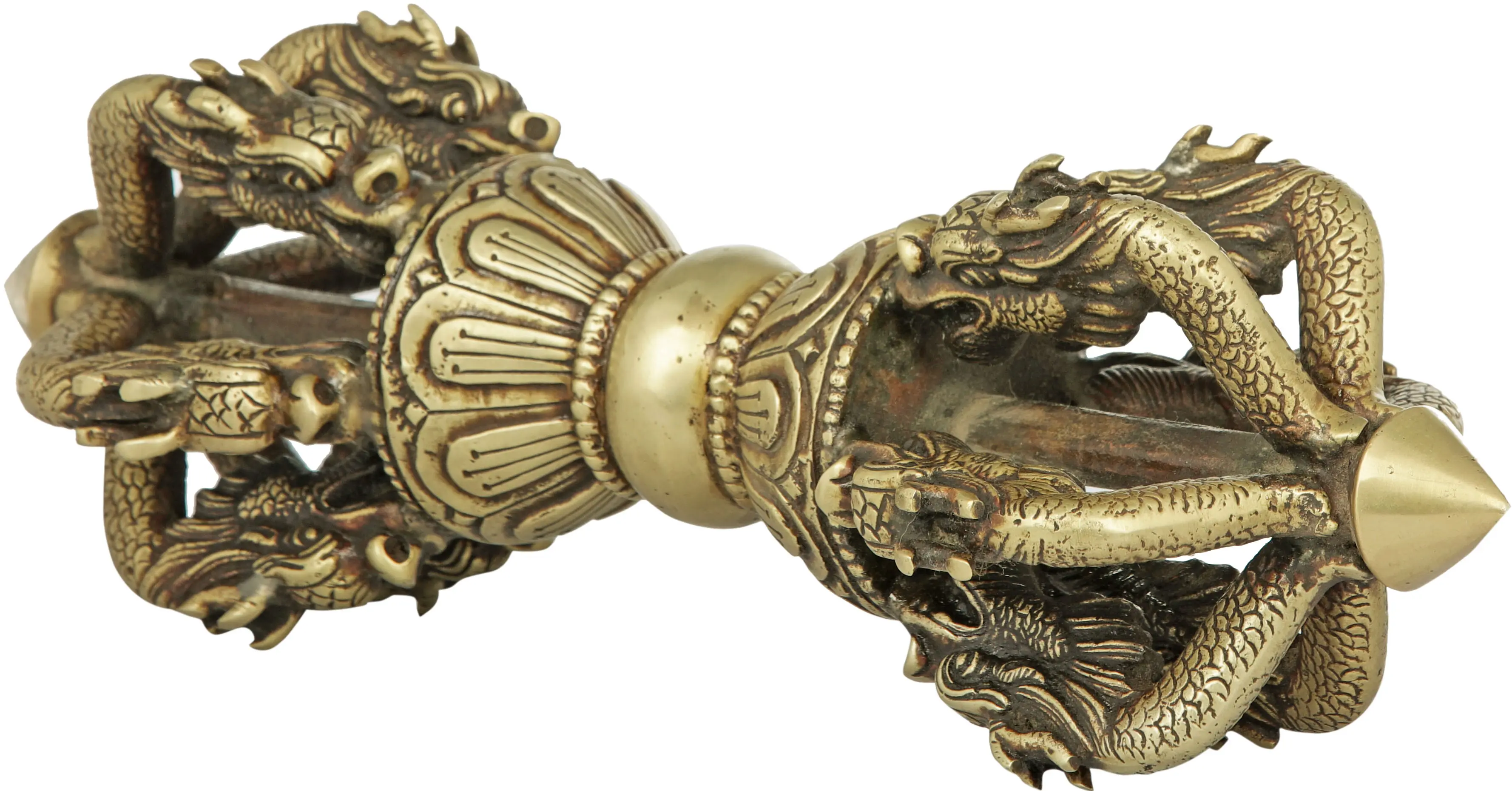 The design of this particular Dorje is further enriched by the presence of two majestic dragons, one at each end, locked in a protective embrace. Dragons in Tibetan culture are revered as powerful beings, often associated with water, thunder, and the bringing of rain, crucial for life and prosperity. They symbolize strength, wisdom, and the auspicious power to overcome adversity. The intricate detailing of their scales, fierce yet serene expressions, and powerful claws gripping the central shaft speaks to their role as guardians of the sacred Dharma, protecting the path to enlightenment from negativity and spiritual disturbances. The central knot, often depicted as an endless knot, signifies the interconnectedness of all things and the eternal nature of the Buddha's teachings.