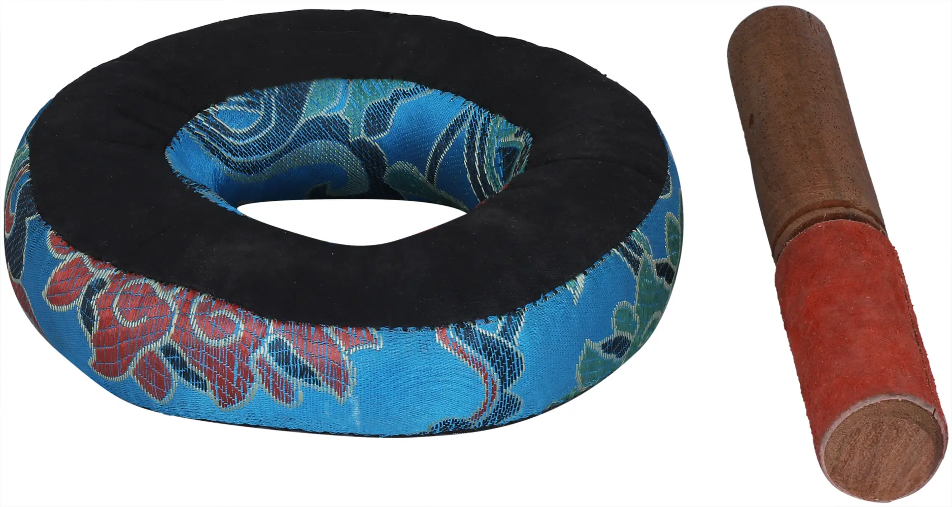 To play the singing bowl, there is a beautifully finished striker, known as the mallet made with a ‘soft strike technique’ involving fine quality wood wrapped with the maroon colored soft felt of appropriate density covered on its one end for striking. The bowl is securely placed atop an appropriate sized vibrant sky blue colored o-ring shaped cushion prepared to prevent the bowl from sliding around and to give an excellent tone quality.