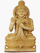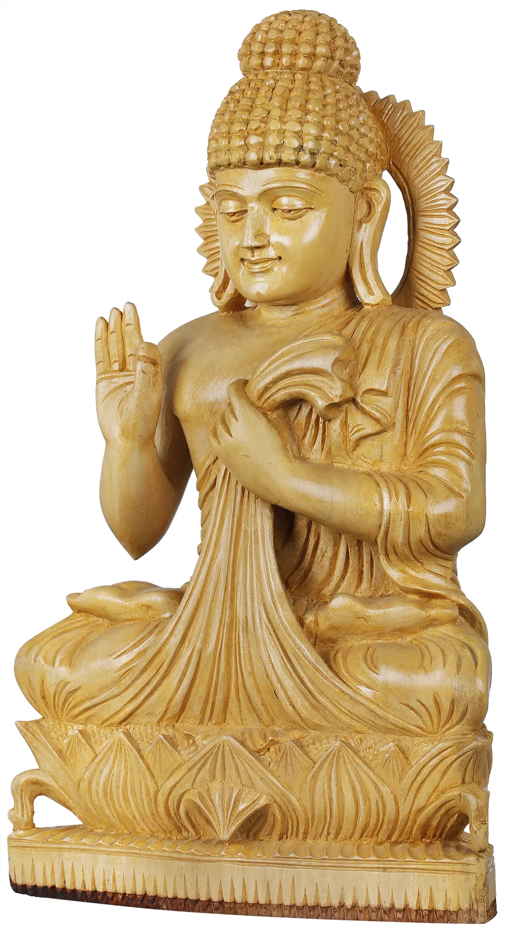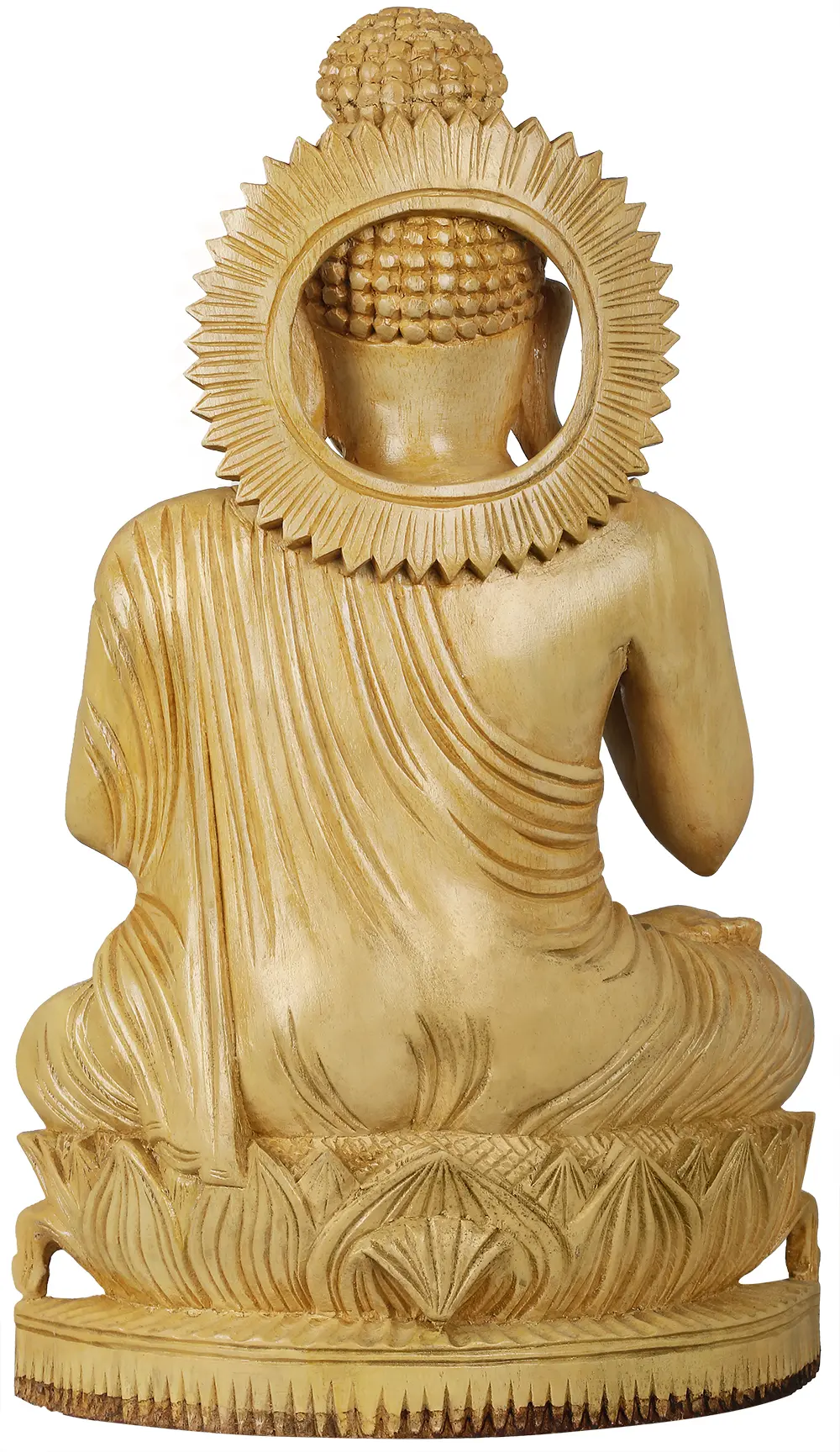 He sits here cross-legged in padmasana on an outgrown lotus pedestal and holds his long flowing robe, clustered together by the right hand; notice the sculptor’s realistic imaginations while carving out Buddha’s long, comfortable, easy flowing and pleated robe. The self-textured, smooth and glowy surface of this wooden statue, makes it all-the-more alluring and attractive. Zoom in to the face features of a sleek and pointed nose, gently smiling lips, long curvy earlobes and the half open eyes symbolizing the proper posture of meditation where the half-closed eyes match a mind that is awake and turned inwards. The tied coiled hair in front of the beautiful flower aureole represent his continuous determination to achieve enlightenment.