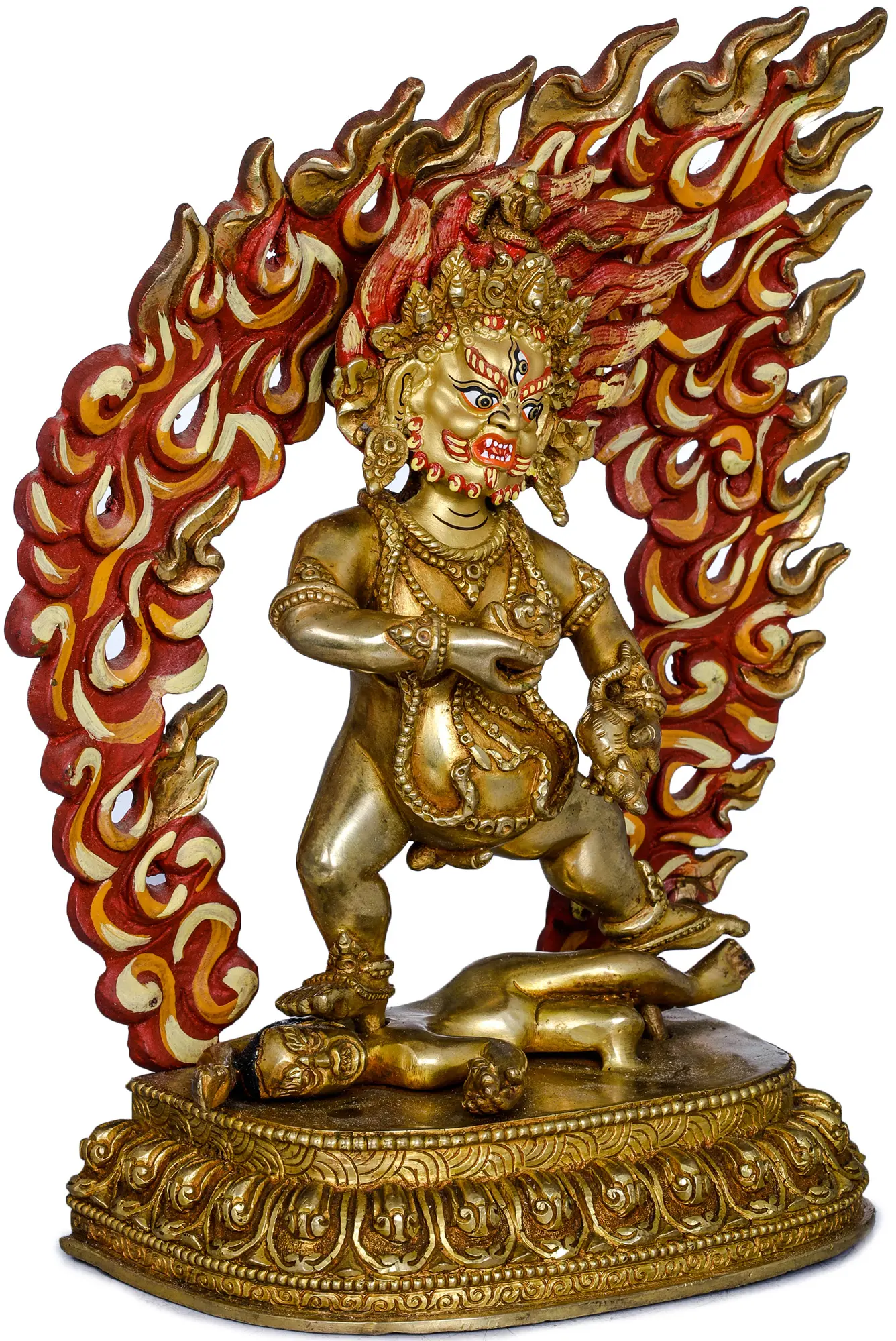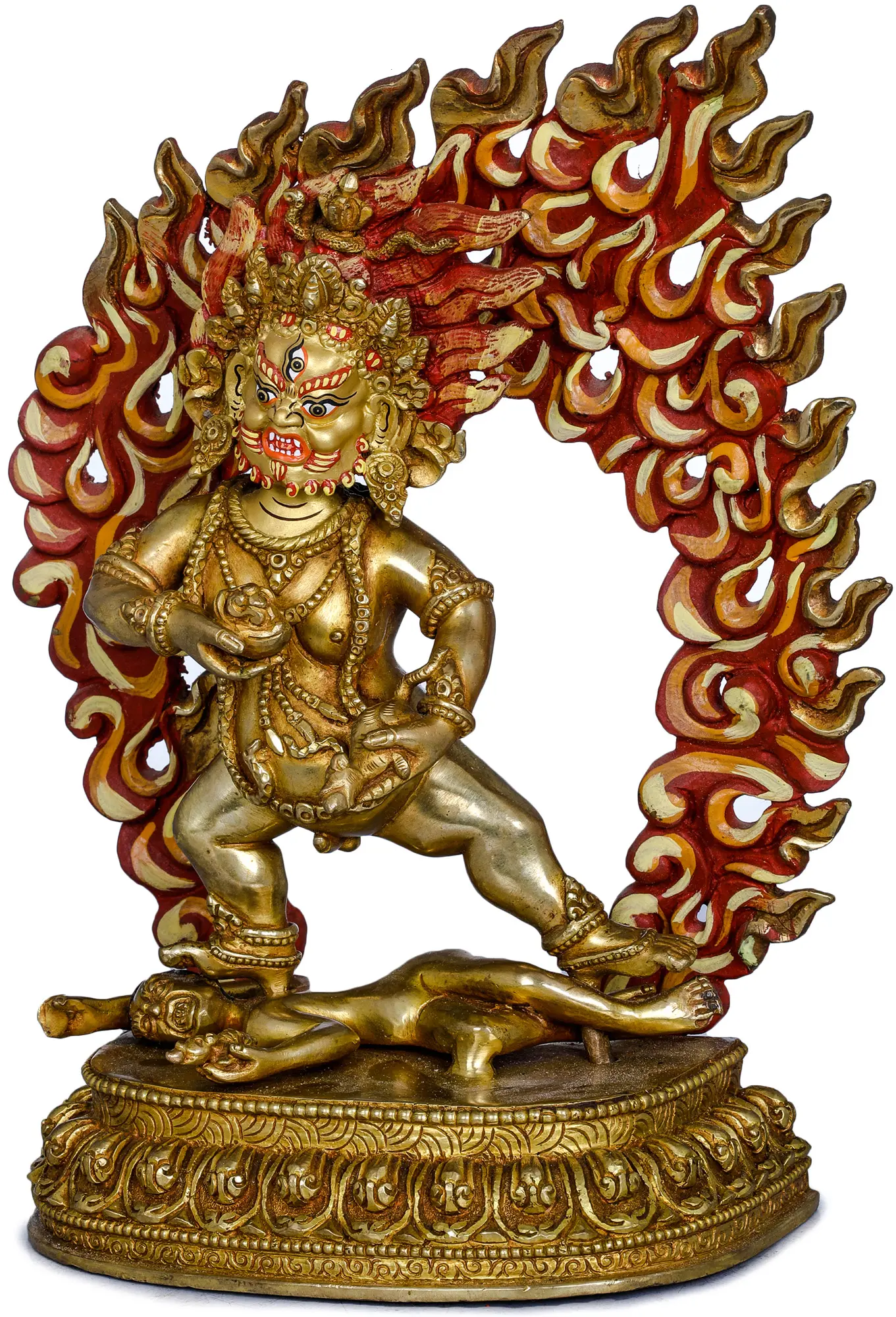 The fiery halo that encircles the deity is a common representation of spiritual illumination and the burning away of negative forces. The flames, rendered in vibrant reds and yellows, suggest the transformative power of enlightened wisdom. The deity's fearsome expression, with bared teeth and wide, piercing eyes, is not one of malice but of intense focus and unwavering determination to protect. The third eye on its forehead signifies its all-seeing awareness. Adorned with ornate jewelry and necklaces, the deity exhibits a regal bearing, underscoring its divine status and authority. The intricate detailing on the base, featuring classic Buddhist motifs, further enhances the sacred nature of the piece. ––––––––––––––––––