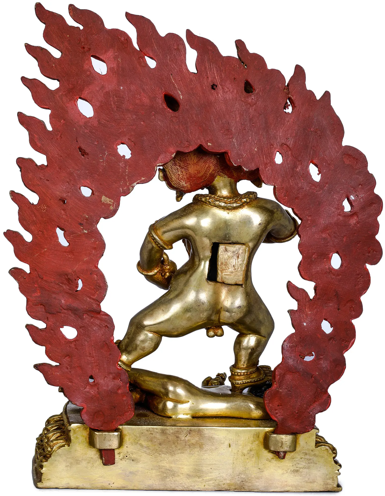 Originating from Nepal, a land steeped in Buddhist philosophy and artistry, this copper statue is more than just a decorative object; it is a conduit for spiritual energy and a focal point for contemplation. The skilled artisans have channeled centuries of tradition into its creation, ensuring that each detail, from the sharp lines of the flames to the subtle musculature of the deity, is rendered with profound respect and artistic mastery. The choice of copper as the material, combined with the rich gilding, creates a timeless and sacred artifact that will grace any space with its presence and spiritual significance. It serves as a powerful reminder of the resilience of the spirit and the ultimate triumph of light over darkness.