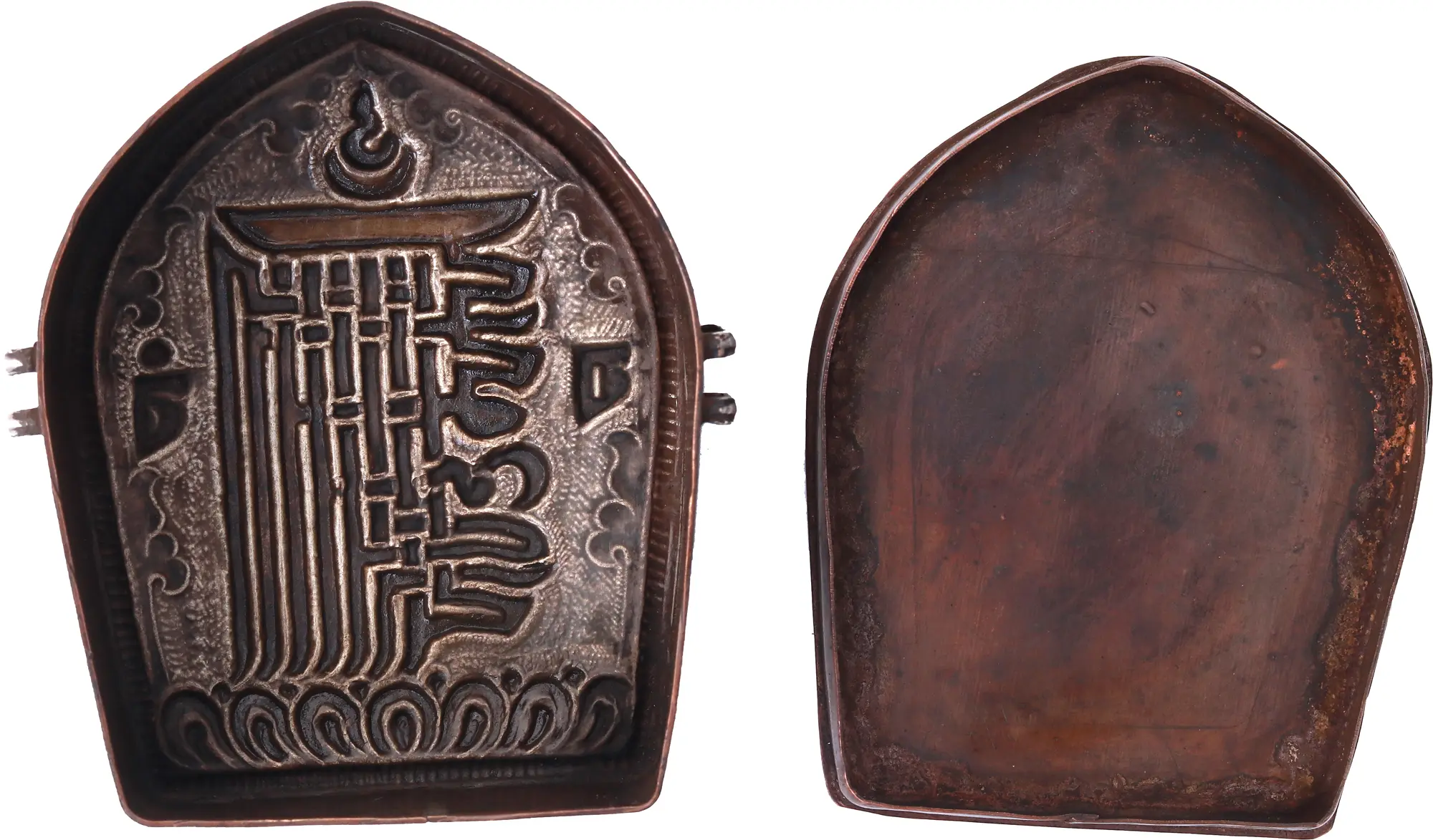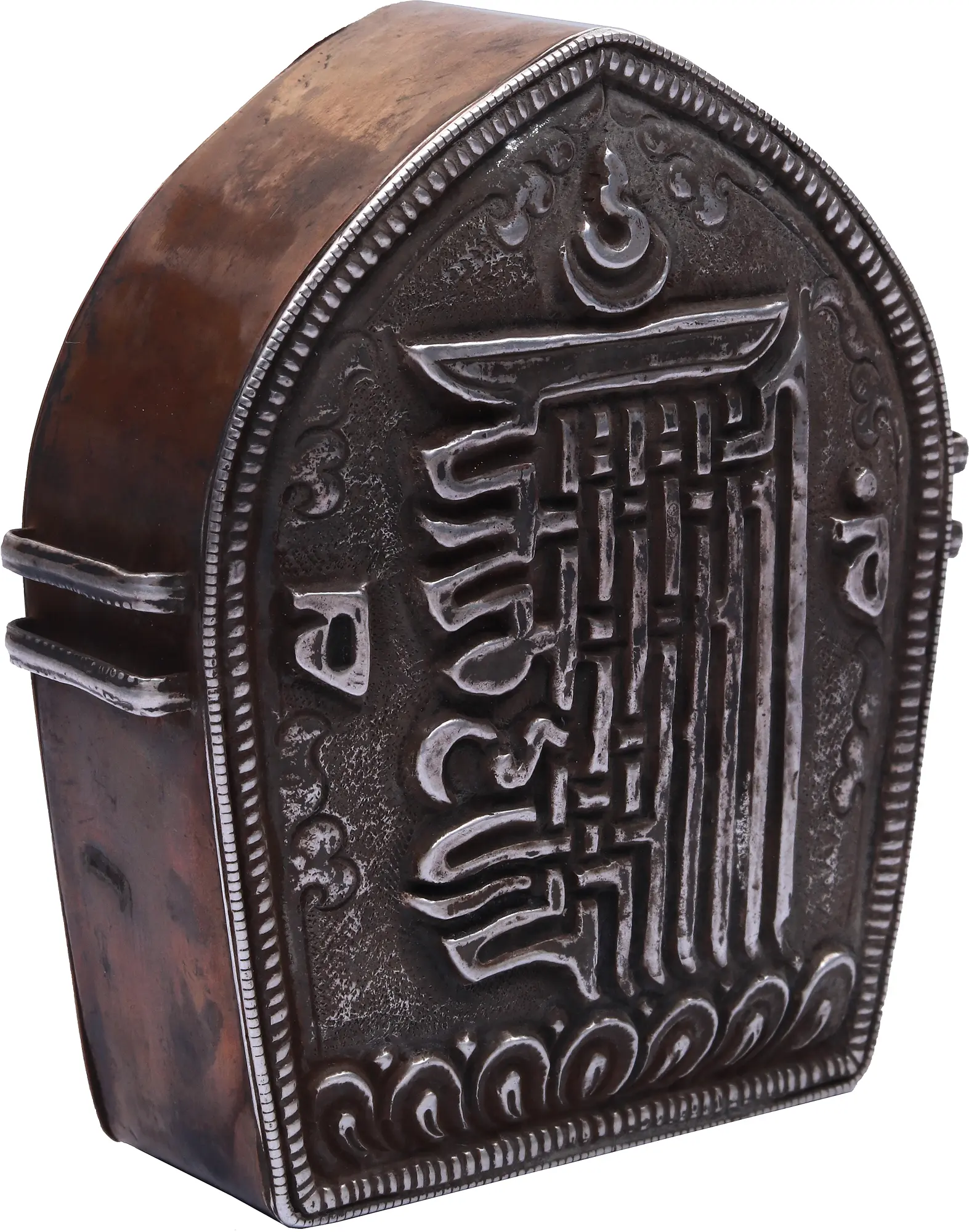 Each element of this gau box is imbued with meaning. The central script is meticulously rendered, inviting deep contemplation. The border is adorned with a delicate patterned edge, reminiscent of ancient coins and seals, further enhancing its sacred aura. The overall shape, with its pointed top, evokes the sacred mountains and celestial realms central to Buddhist cosmology. The use of sterling silver with a copper backing is not merely for aesthetic appeal; the inherent properties of these metals are often associated with purity, conductivity of spiritual energy, and longevity in various spiritual traditions. The two loops on either side suggest it was designed to be worn or hung, making it a truly portable shrine, a constant companion for the devoted practitioner. ––––––––––––––––––