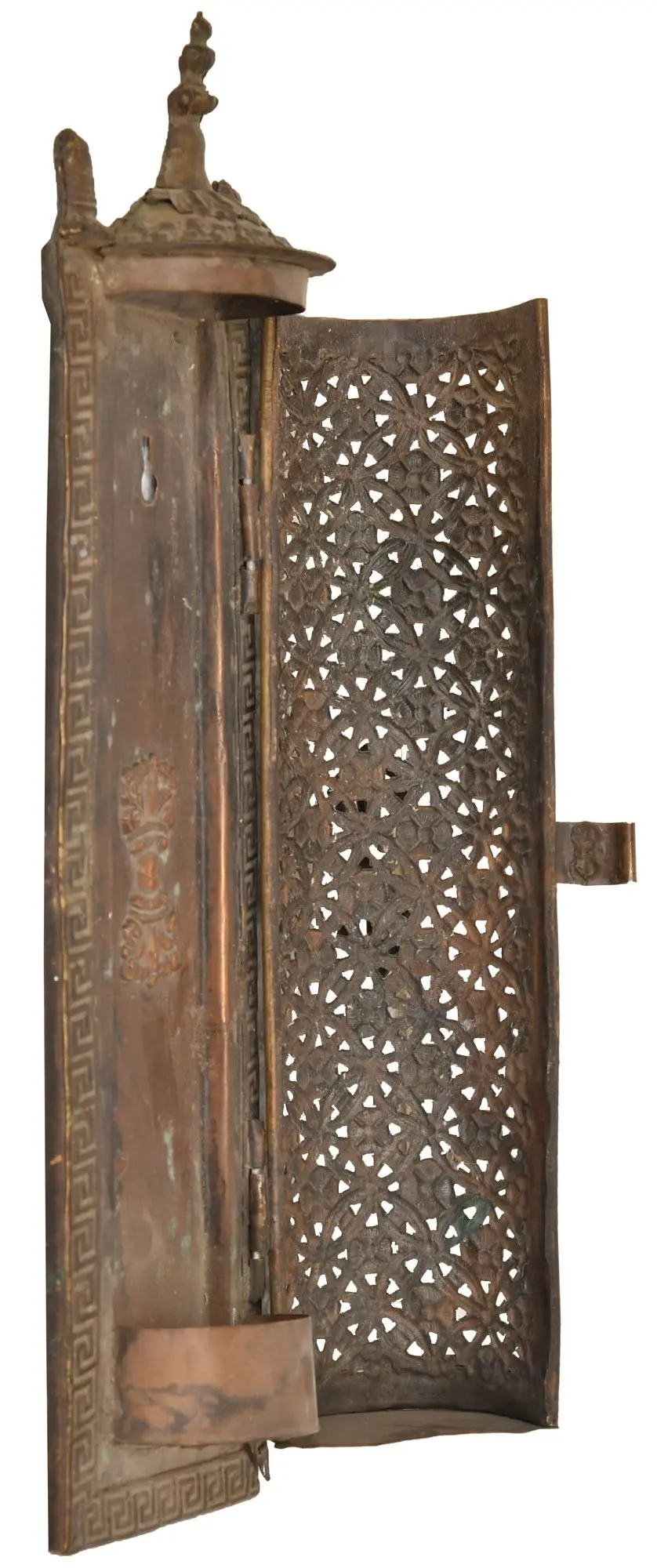 This exquisite copper incense holder is more than just an object; it is a vessel for devotion, a conduit for sacred aromas, and a piece of living history. Crafted with meticulous detail, its intricate openwork design invites contemplation, allowing the fragrant smoke of incense to rise and fill the space with a calming, purifying aura. The rich patina of the aged copper whispers tales of countless prayers offered and meditations undertaken. The body of the holder is adorned with a mesmerizing geometric pattern, evoking the labyrinthine paths of the spiritual journey and the interconnectedness of all things. Flanking this central motif, a border of Greek key, or meander, pattern adds an ancient and timeless aesthetic, suggesting the cyclical nature of existence and the endless flow of energy. At the apex, a delicate finial crowns the piece, reminiscent of the stupa's pinnacle, symbolizing enlightenment and the ultimate aspiration of the Buddhist path. Attached to the side is a finely rendered vajra, also known as a Dorje. In Tibetan Buddhism, the vajra is a powerful symbol representing the indestructible nature of wisdom and the thunderbolt of enlightenment that cuts through ignorance. It is often depicted as a scepter wielded by deities to vanquish inner demons and external obstacles. Its presence here imbues the incense holder with potent spiritual significance, transforming it into an object that actively assists in dispelling negativity and fostering inner peace. The craftsmanship is a testament to the artisans of the Himalayan region, where metalworking traditions have been passed down through generations, often in service of religious practice. The tradition of using incense in Buddhist rituals dates back to ancient times, with aromatic resins and herbs burned to purify the air, appease deities, and create a conducive atmosphere for meditation and prayer. Incense was believed to carry prayers to the heavens and to cleanse not only the physical space but also the mind and spirit. This wall-hanging incense burner is designed to be both functional and aesthetically profound. Its vertical orientation and openwork structure allow for optimal circulation of fragrant smoke, while its striking design makes it a captivating focal point in any meditation room, altar, or sacred space. Imagine the gentle tendrils of sandalwood or frankincense unfurling through the intricate patterns, carrying with them wishes for well-being and tranquility. This piece is an invitation to connect with ancient wisdom and cultivate a deeper sense of inner harmony.