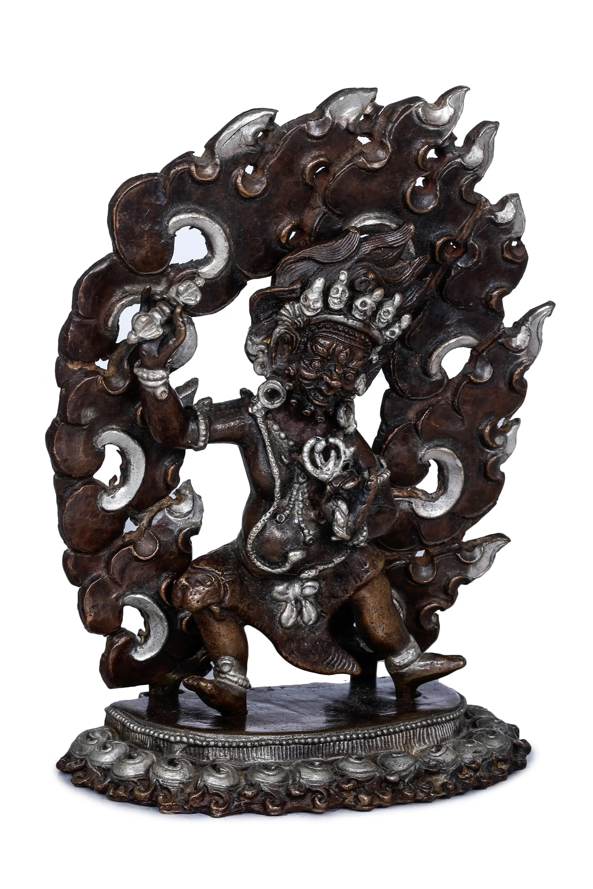 Vajrapani, the possessor of the thunderbolt, is connected to the highest level of awakened clarity attained through the fire of inner consciousness. The thunderbolt is the Buddhist symbol of supreme enlightenment and its powers. The vigor on Vajrapani's face in this copper Nepalese statue is a reminder of the forces of enlightenment, which persistently oppose and vanquish the darkness inside. Vajrapani's head and shape are encircled by a fiery halo made of the light of the awakened state. Vajrapani dynamically lunges while donning a tiger hide and a crown made of jewels, giving the statue a distinctive appearance.