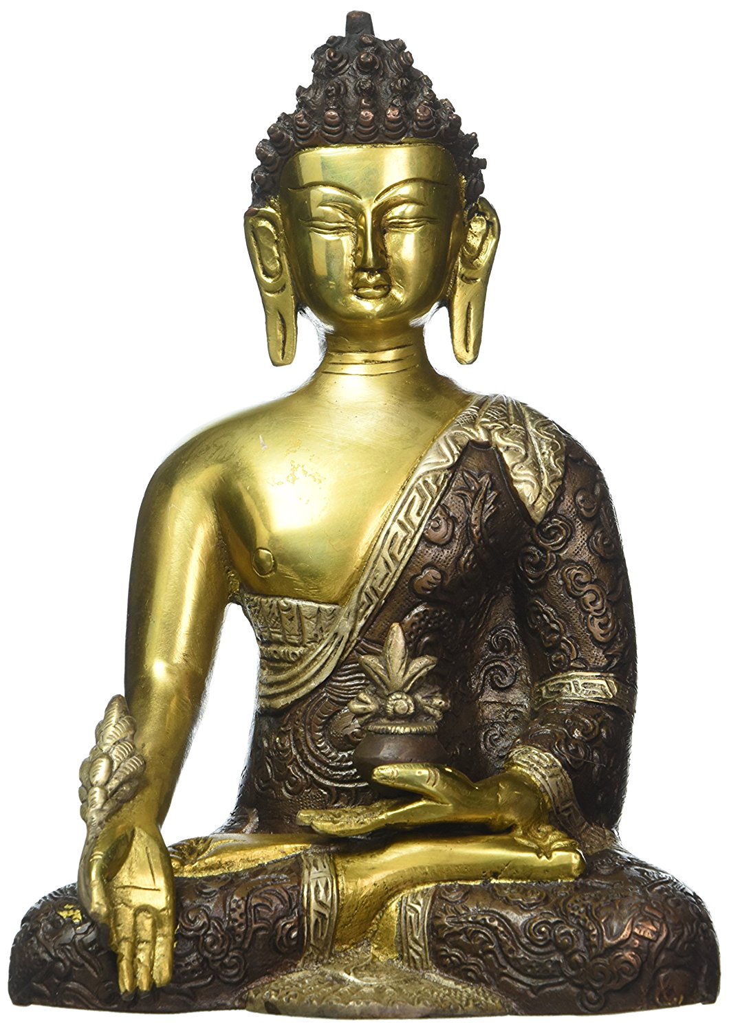 This exquisite statue portrays the Medicine Buddha, also known as Bhaisajyaguru, a revered figure in Mahayana Buddhism. He is depicted in the traditional meditative posture, seated on a lotus throne, with his eyes gently closed in profound concentration. His serene countenance radiates peace, wisdom, and an unwavering sense of compassion. The rich, warm tones of the brass evoke a sense of timeless sanctity, making this piece a captivating focal point for any sacred space or home altar. The Medicine Buddha is considered the master of healing, both physical and spiritual. According to Buddhist lore, he made twelve great vows upon attaining enlightenment, vowing to heal the sick, relieve suffering, and guide all beings towards enlightenment. His presence is said to purify the mind and body, dispel illness, and offer solace to those afflicted by physical ailments or mental distress. In his left hand, he holds an alms bowl filled with the nectar of immortality, symbolizing his ability to bestow blessings of long life and good health. His right hand rests in the *varada mudra*, the gesture of wish-granting and generosity, signifying his readiness to offer assistance and alleviate suffering.