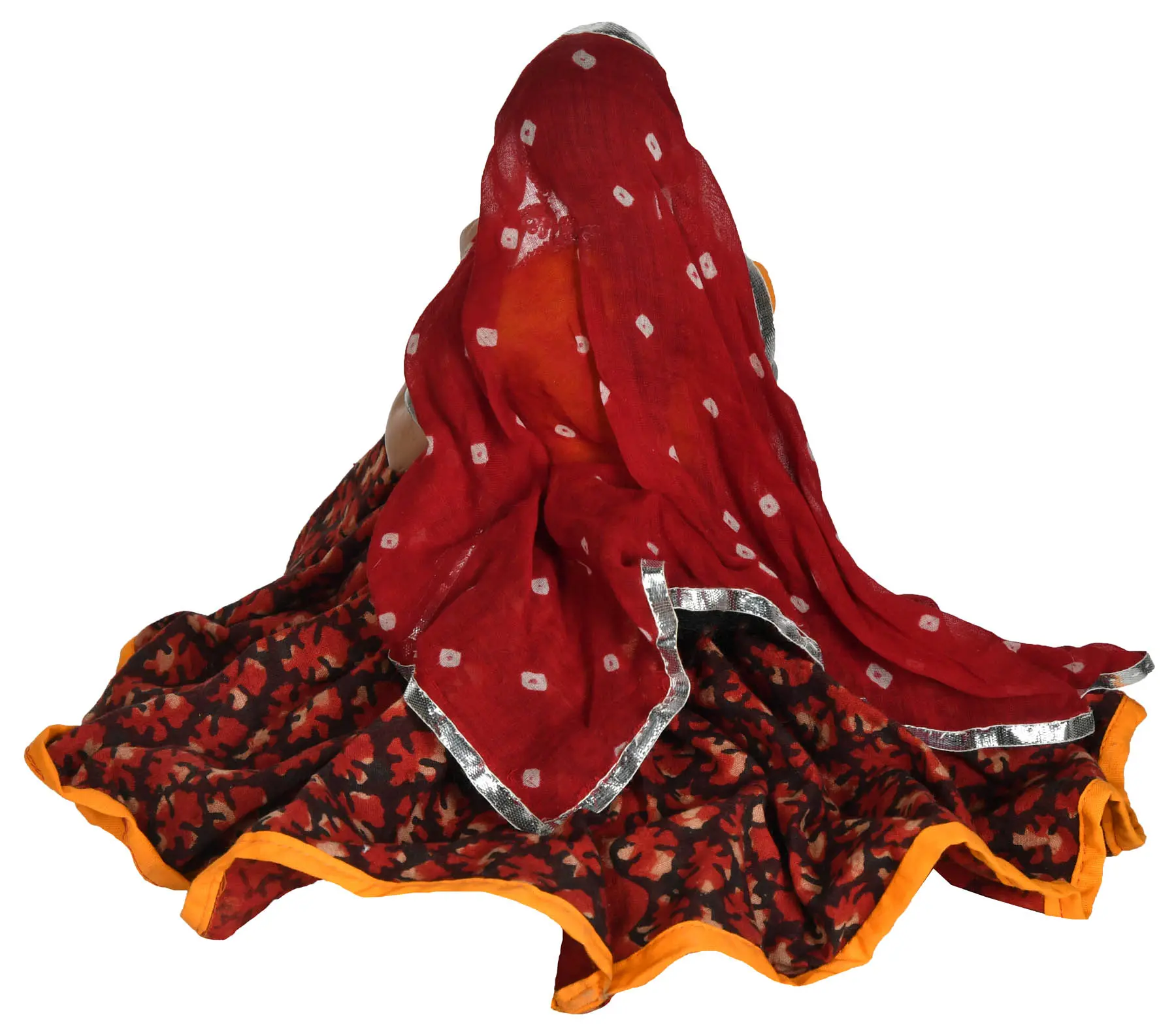 Immerse yourself in the vibrant tapestry of Indian culture with this exquisite Papier-mâché doll, a captivating representation of the Bagdi community from Rajasthan. Crafted with meticulous detail, this piece brings to life the spirit and traditions of a people deeply connected to the land. The doll sits gracefully, her posture exuding a sense of serene strength, reminiscent of the women who traverse the Thar Desert, their resilience a testament to generations of adapting to a challenging yet beautiful environment. The intricate adornments tell a story of cultural richness. Her vibrant attire, a fusion of traditional fabrics and colors, speaks of a heritage steeped in artistry. The layered necklaces and bangles, rendered with delicate precision, echo the importance of ornamentation in Rajasthani culture, where jewelry is not merely decorative but often carries symbolic meaning and signifies social status. The traditional ghungroo earrings, designed to jingle with every movement, evoke the sounds of folk dances and festive celebrations that are intrinsic to life in Rajasthan. ––––––––––