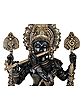 A small, oval-shaped face. Bright eyes complemented by a dreamy brow. The Vaishnava tilaka, indicative of the fact that He is a Vishnu-avatara. A tall crown and a supersized halo that contrast with the delicate proportions of that handsome face. A finely sculpted, chaturbhujadhari (possessed of four arms) form. While the posterior hands wield the implements associated with the iconography of Vishnu Himself, the fingers of the anterior hands cradle a flute as long and slender as Himself. Ample adornments, an expression of His status as the most widely revered Vishnu-avatara.
