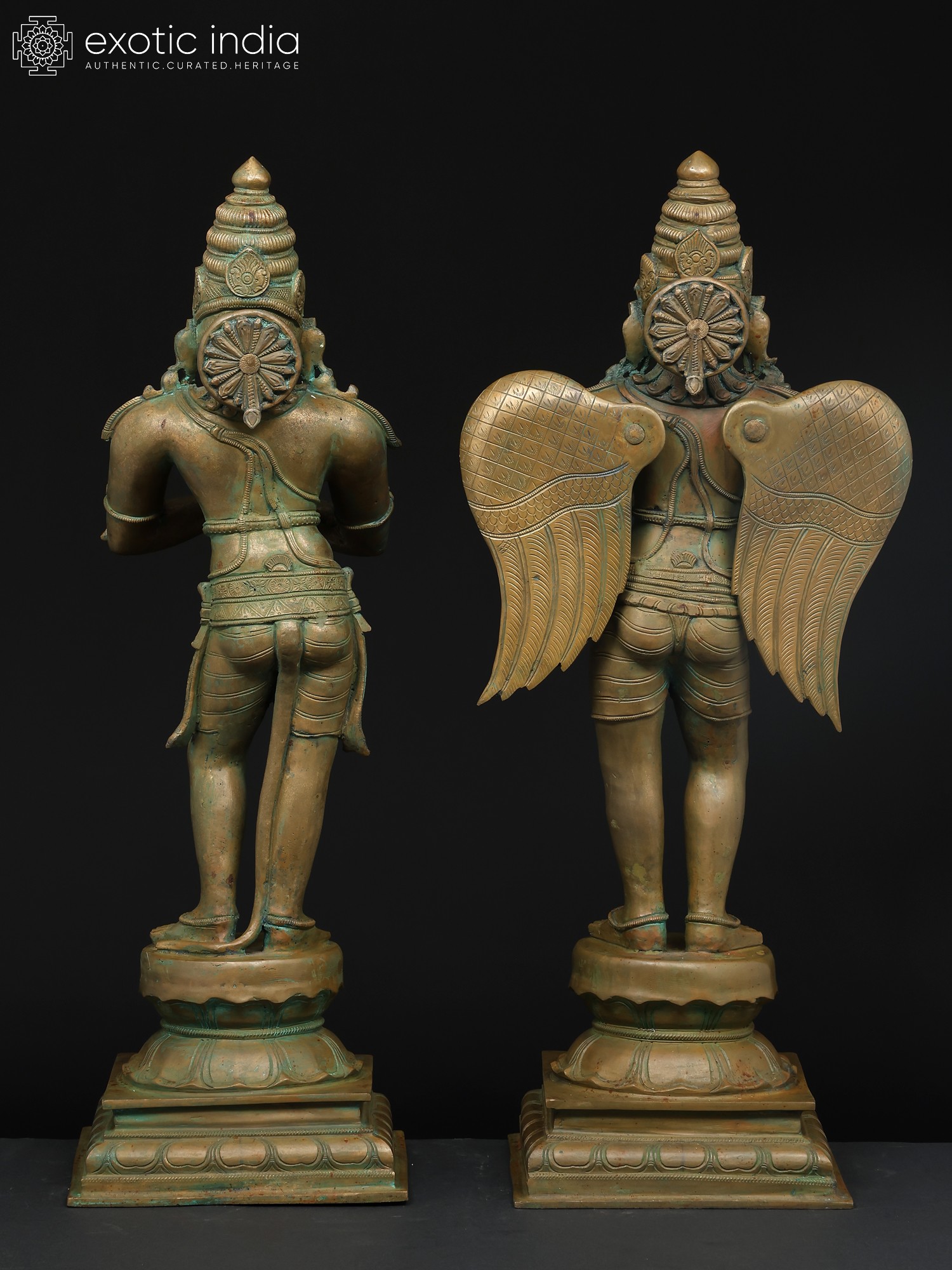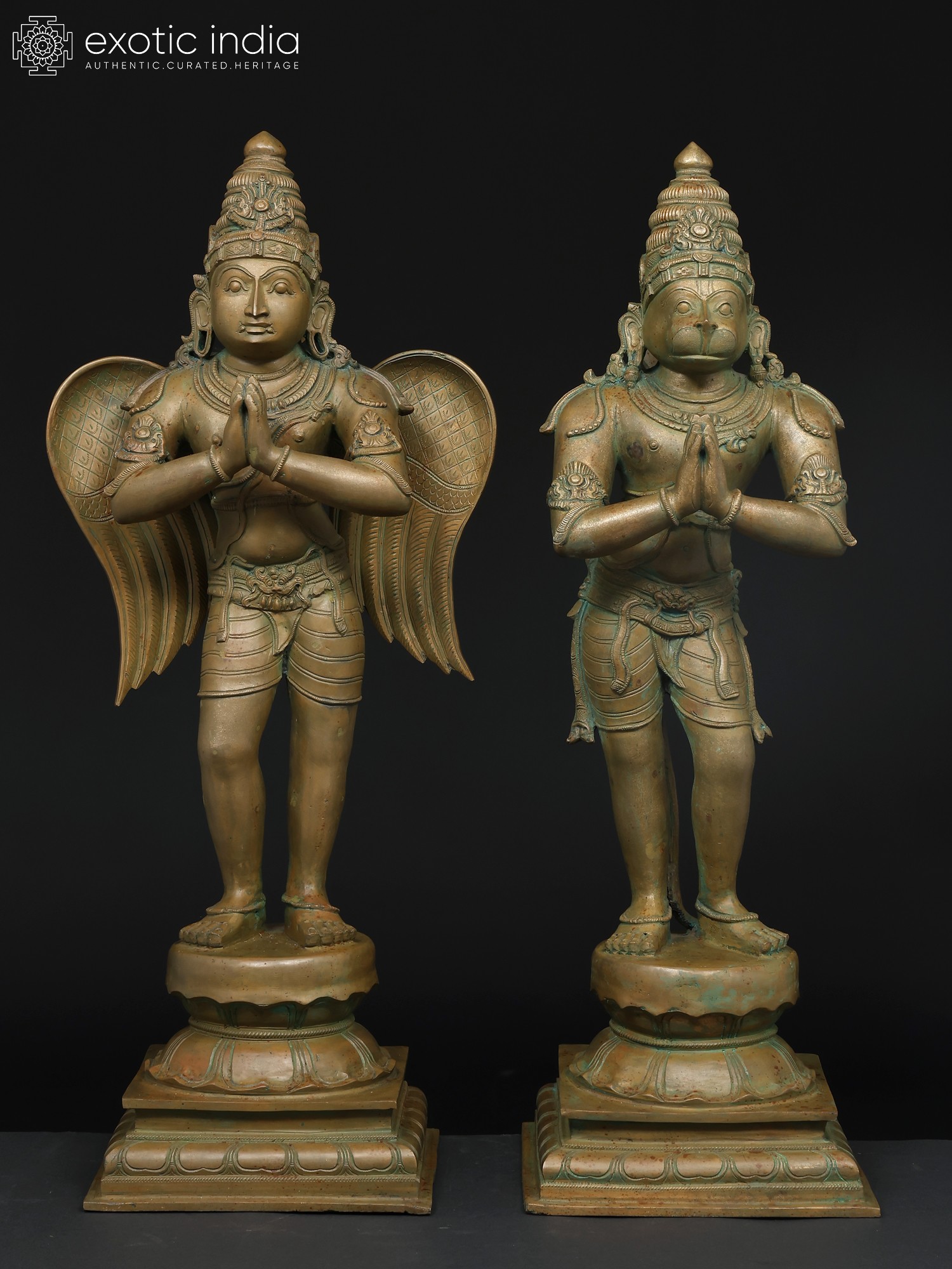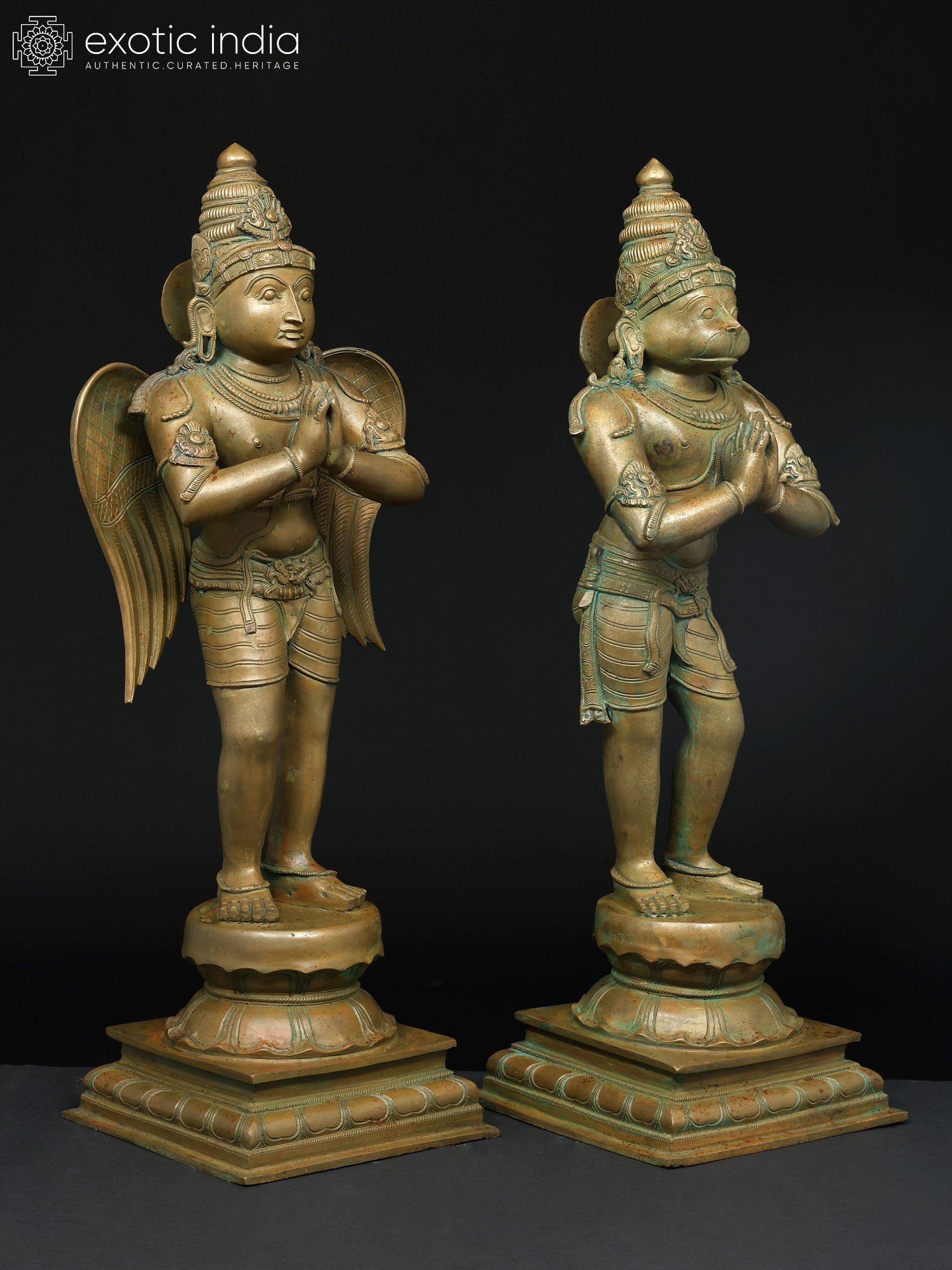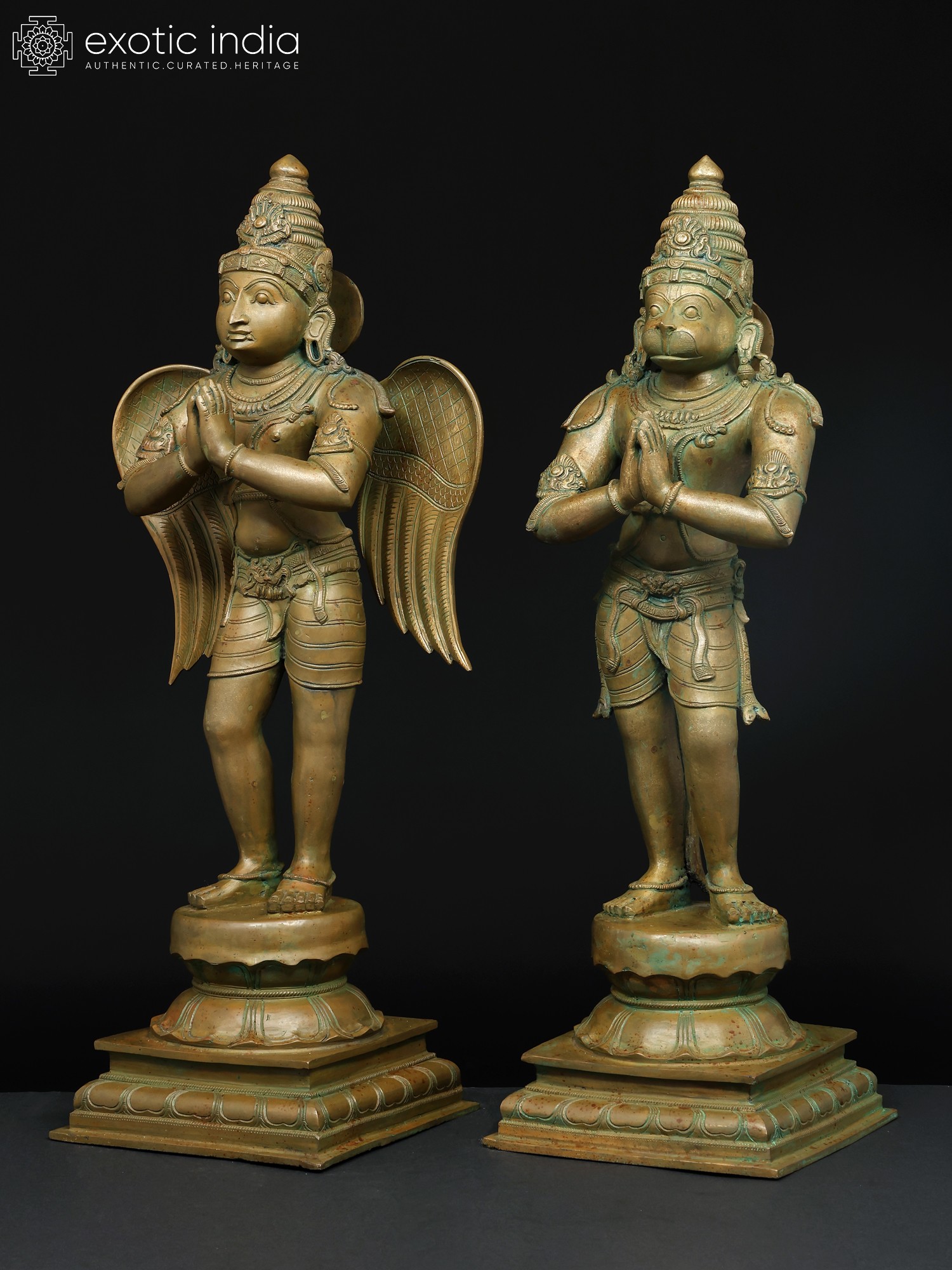 Both are adorned with exquisite precision, wearing kirtimukha waistbands and makara-shaped armbands, with Garuda marked by peacock feathers tucked behind his ears and Hanuman adorned with his characteristic globular kundalas, reflecting the meticulous attention to detail with which Chola bronzes treat ornamentation.