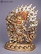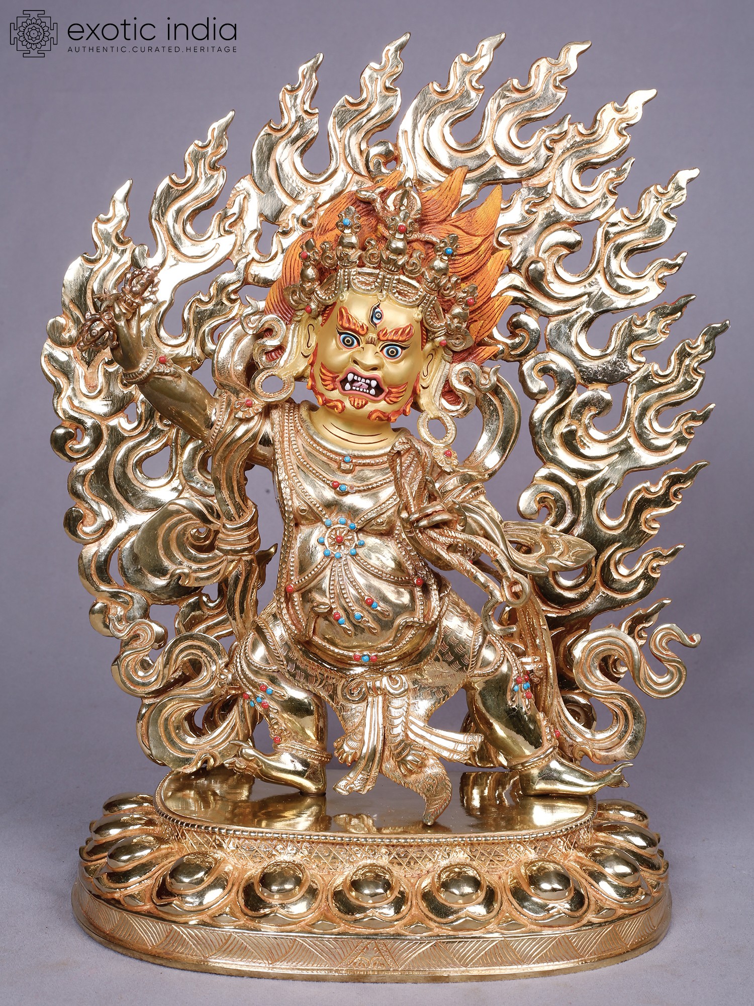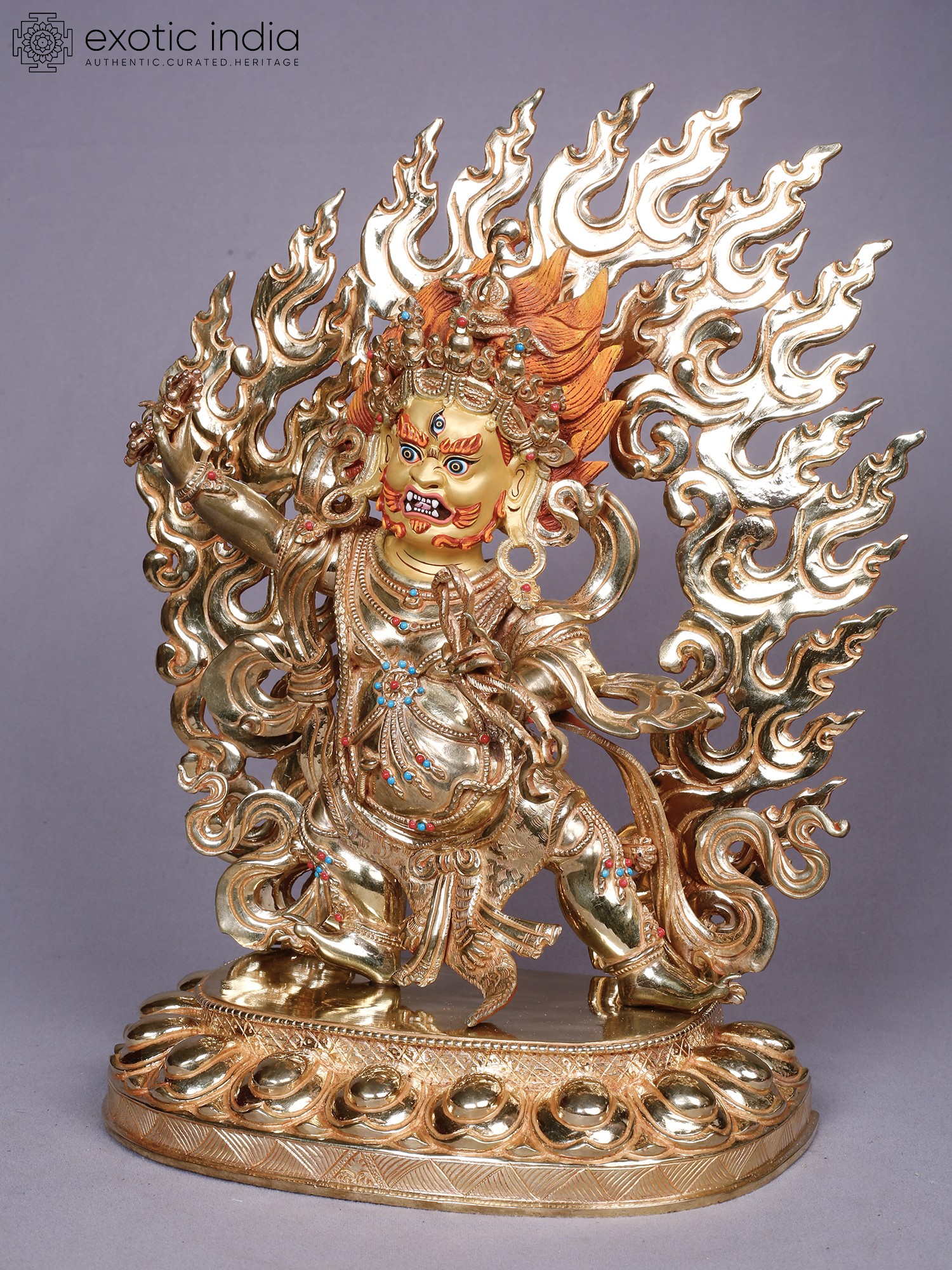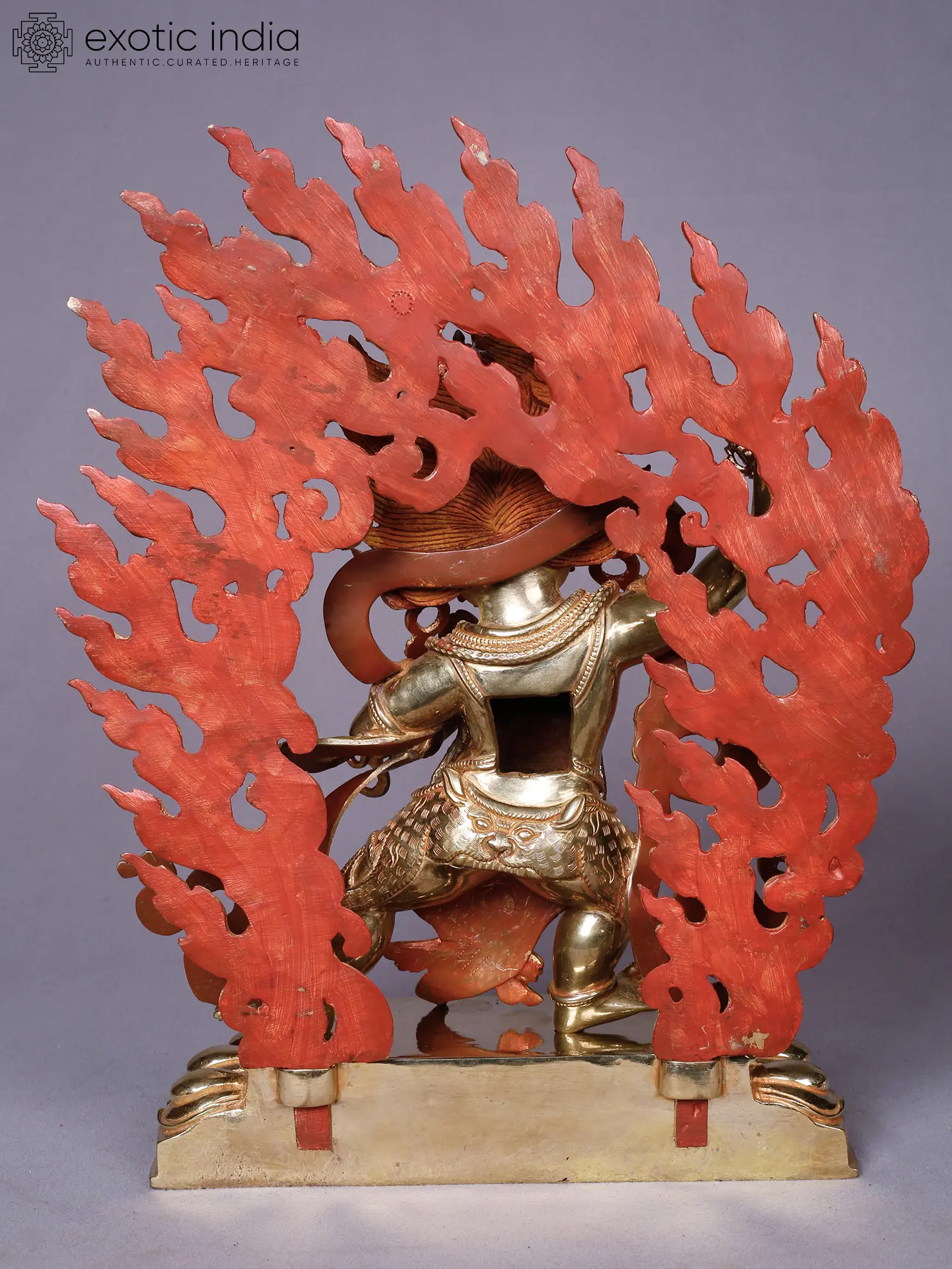 You will be captivated by the intricate details that bring this deity to life, from the fierce expression and multiple eyes to the dynamic aura of flames that engulfs it. The rich gold plating gleams, highlighting the powerful musculature and elaborate ornamentation adorning the figure. Small, vibrant gemstones are precisely set, adding pops of color and further enhancing its opulent appearance. This piece stands at approximately 13 inches tall, with a width of 11 inches and a depth of 5 inches, commanding a significant yet balanced presence.