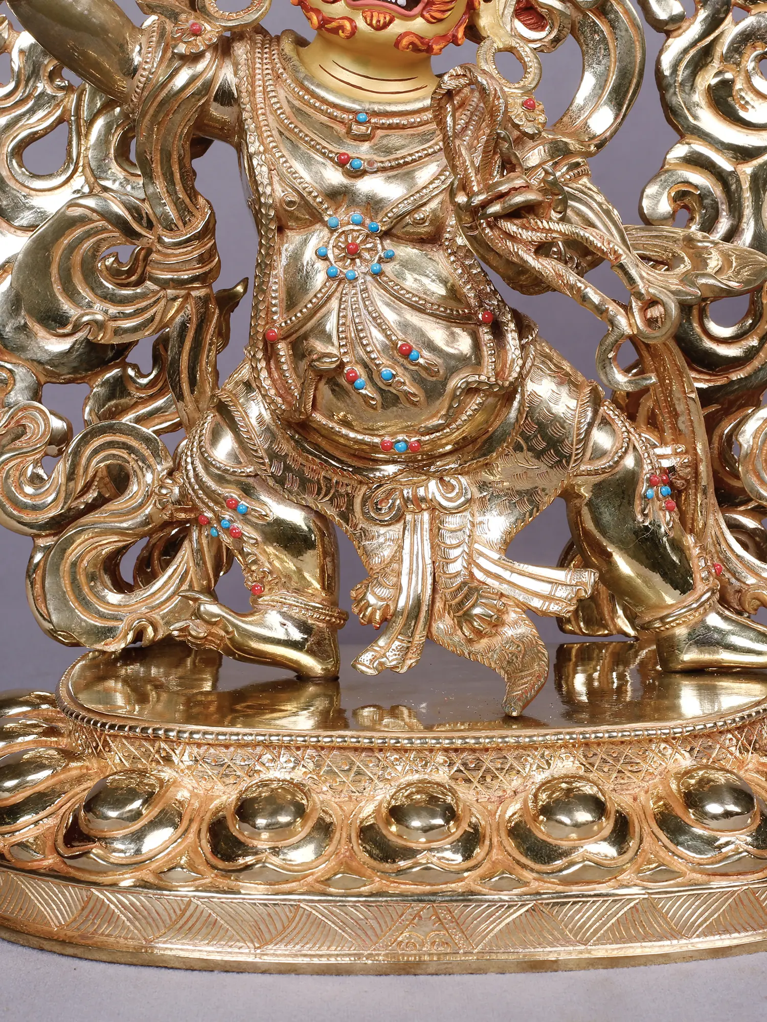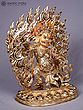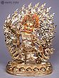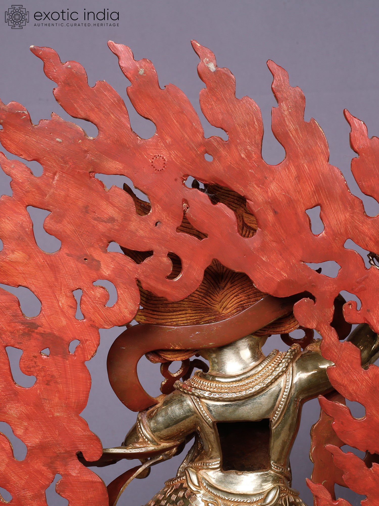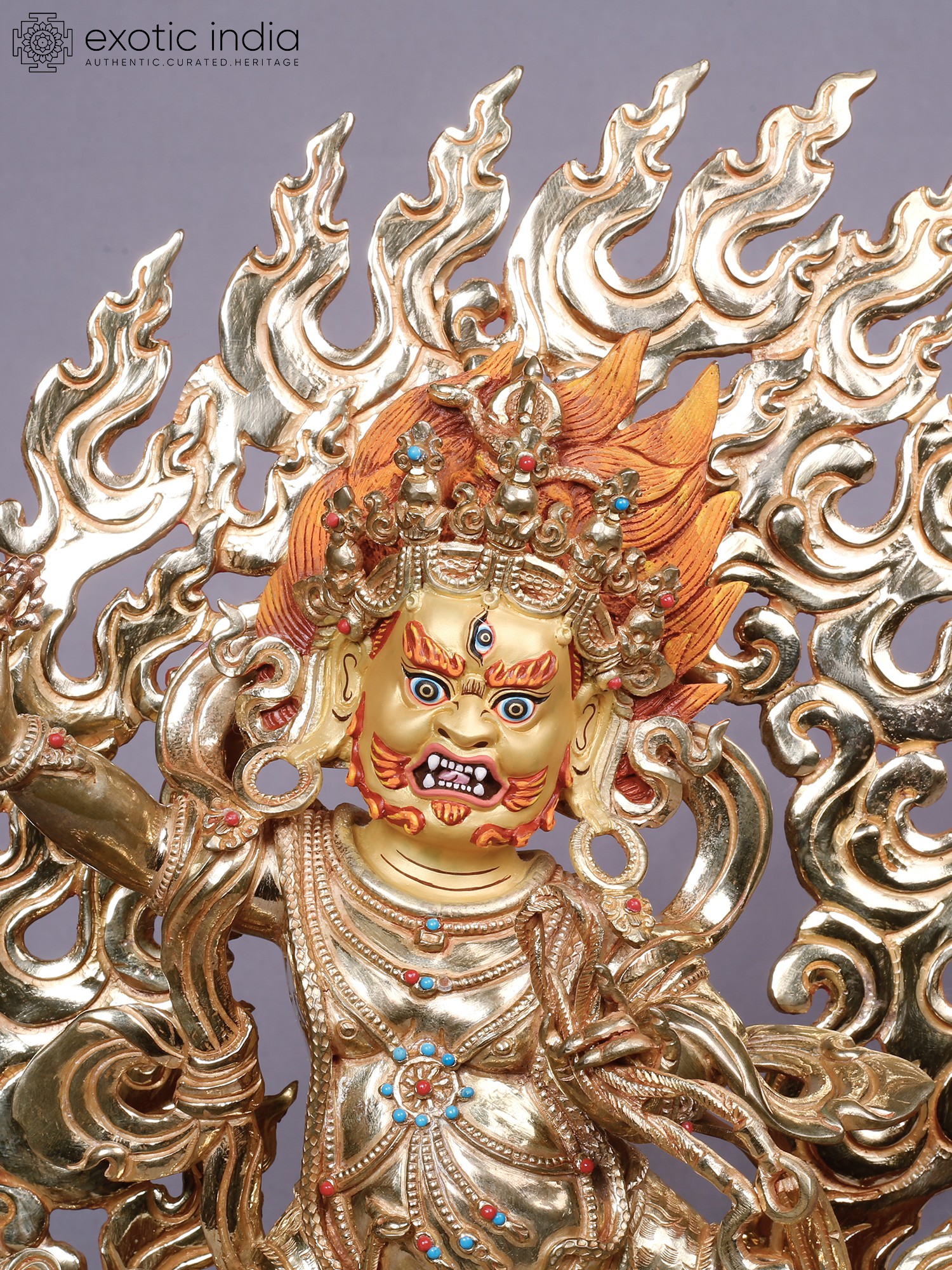 You will be captivated by the intricate details that bring this deity to life, from the fierce expression and multiple eyes to the dynamic aura of flames that engulfs it. The rich gold plating gleams, highlighting the powerful musculature and elaborate ornamentation adorning the figure. Small, vibrant gemstones are precisely set, adding pops of color and further enhancing its opulent appearance. This piece stands at approximately 13 inches tall, with a width of 11 inches and a depth of 5 inches, commanding a significant yet balanced presence.