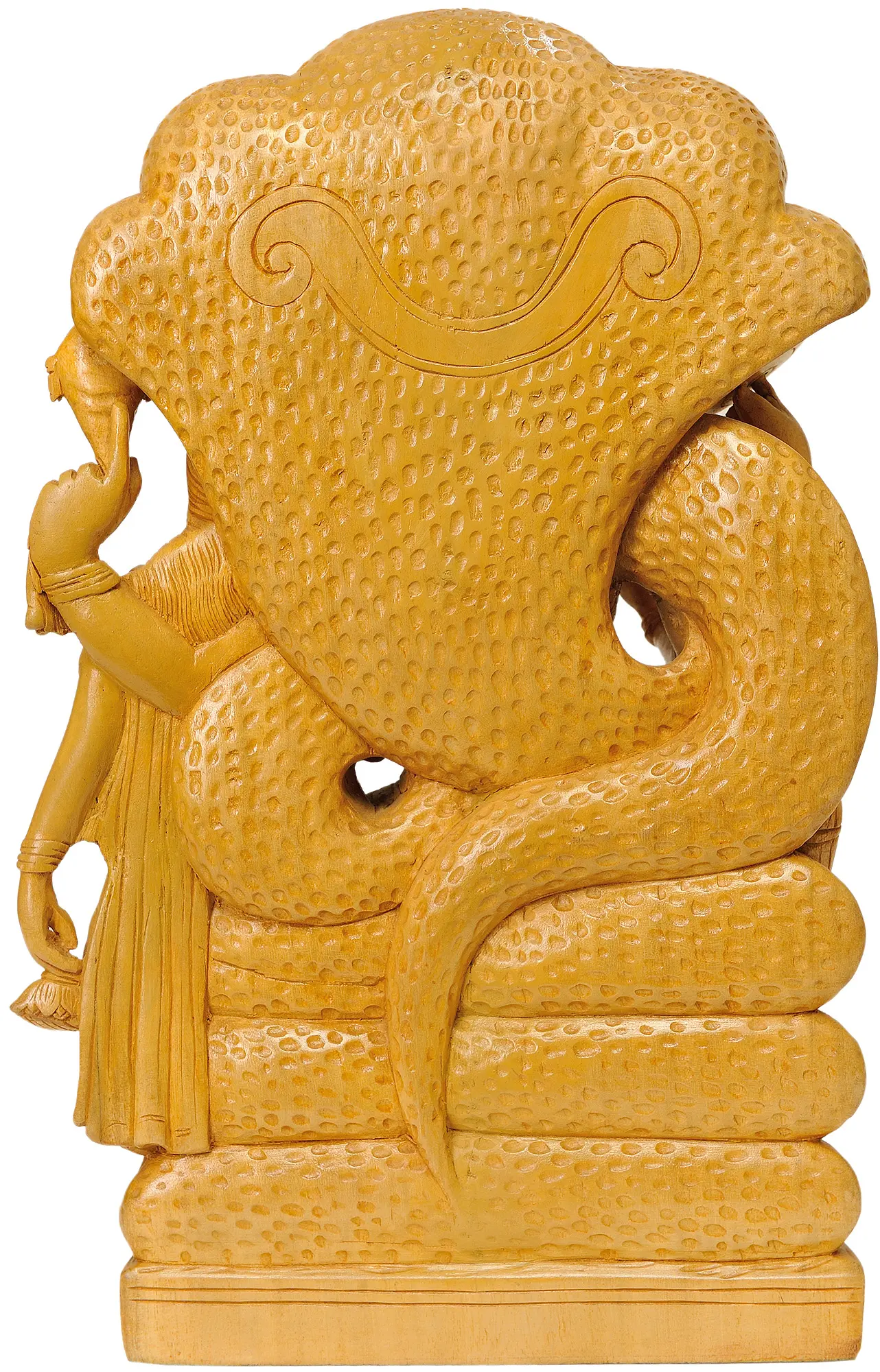 This exquisite wooden carving depicts the divine embrace of Lord Vishnu and Goddess Lakshmi, sheltered by the benevolent hood of Sheshanaga. Crafted from fine white cedar wood sourced from the lush region of Trivandrum, this piece embodies a profound spiritual narrative and exquisite artistry. The natural, warm hue of the wood enhances the intricate details, bringing to life the serene power of the deities and the protective presence of the cosmic serpent.