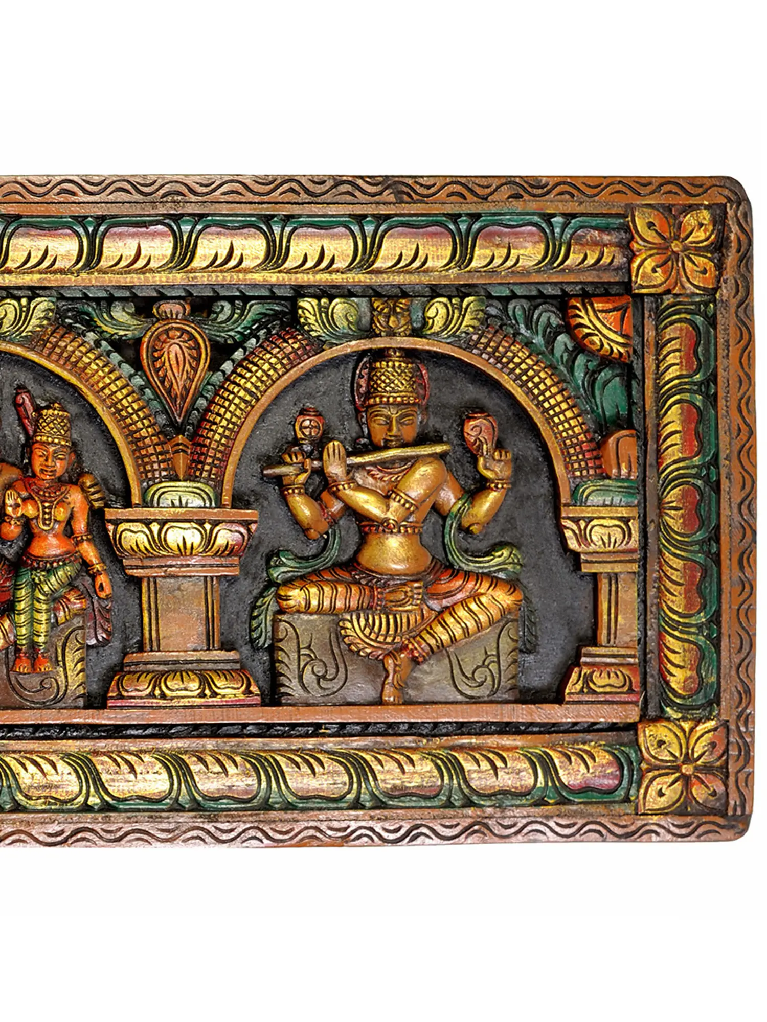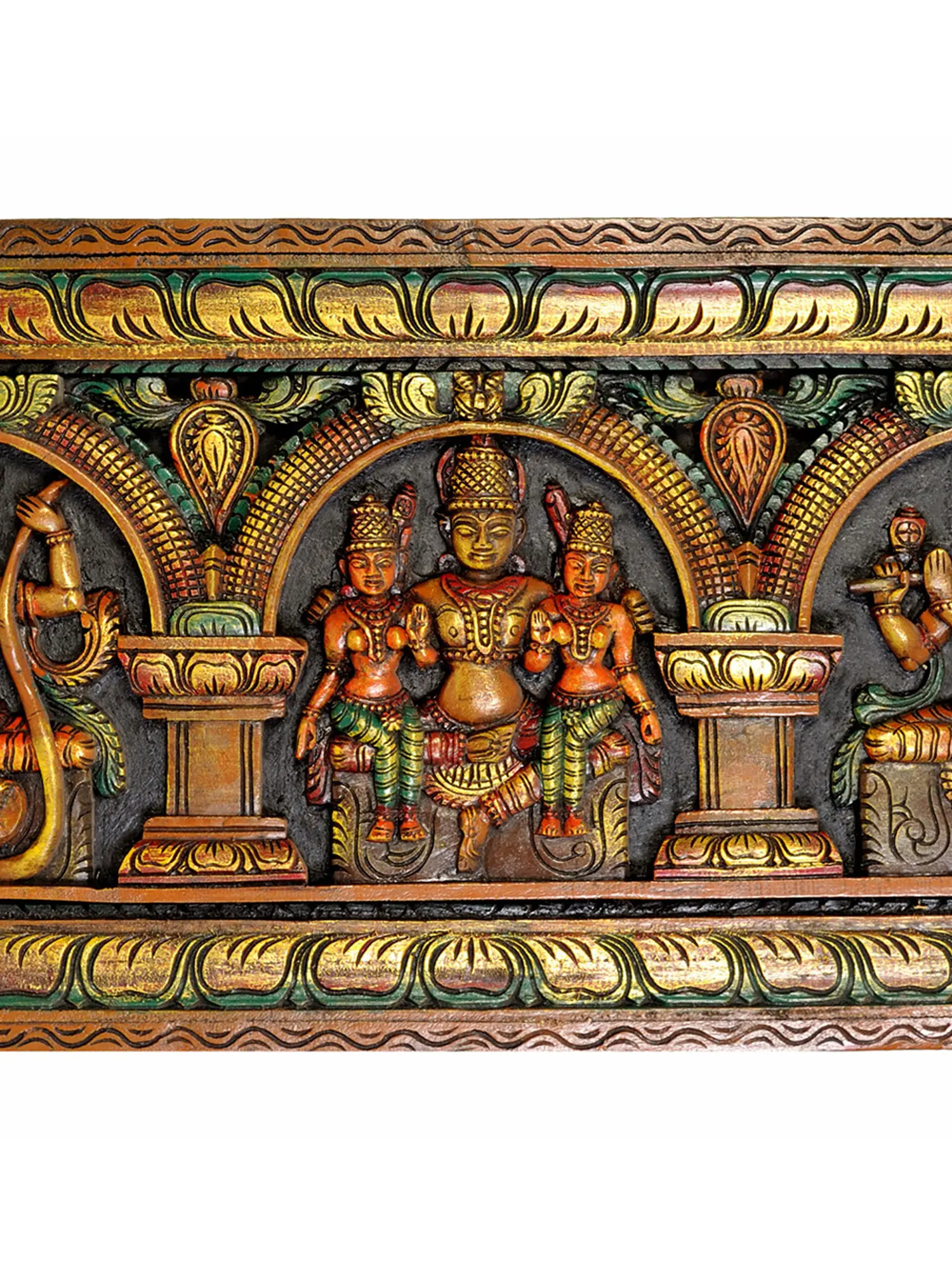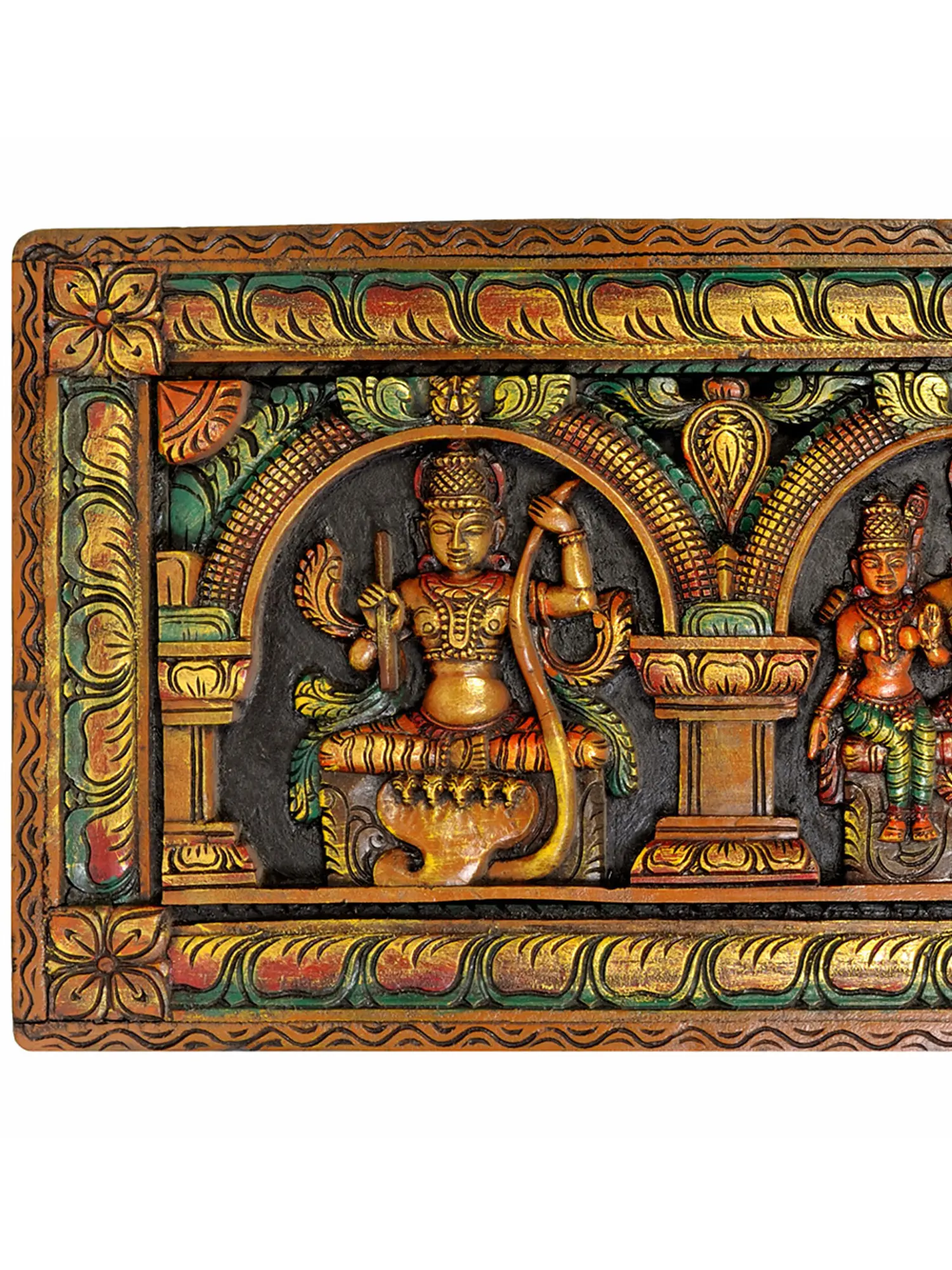 Hailing from the esteemed tradition of South Indian temple wood carving, this panel showcases the exceptional skill of artisans who have honed their craft over generations. The intricate details, from the delicate ornamentation on the crowns and attire of the deities to the flowing drapery and serene expressions, speak of a deep understanding of both form and spirit. The wood, likely a durable hardwood chosen for its ability to hold fine carvings and withstand time, has been skillfully shaped and finished. The vibrant, yet harmonious, color palette further enhances the visual appeal, highlighting the divine figures and the architectural elements of the panel. Each stroke of the chisel contributes to the narrative and the devotional aura of the artwork, making it a truly remarkable piece of cultural heritage.