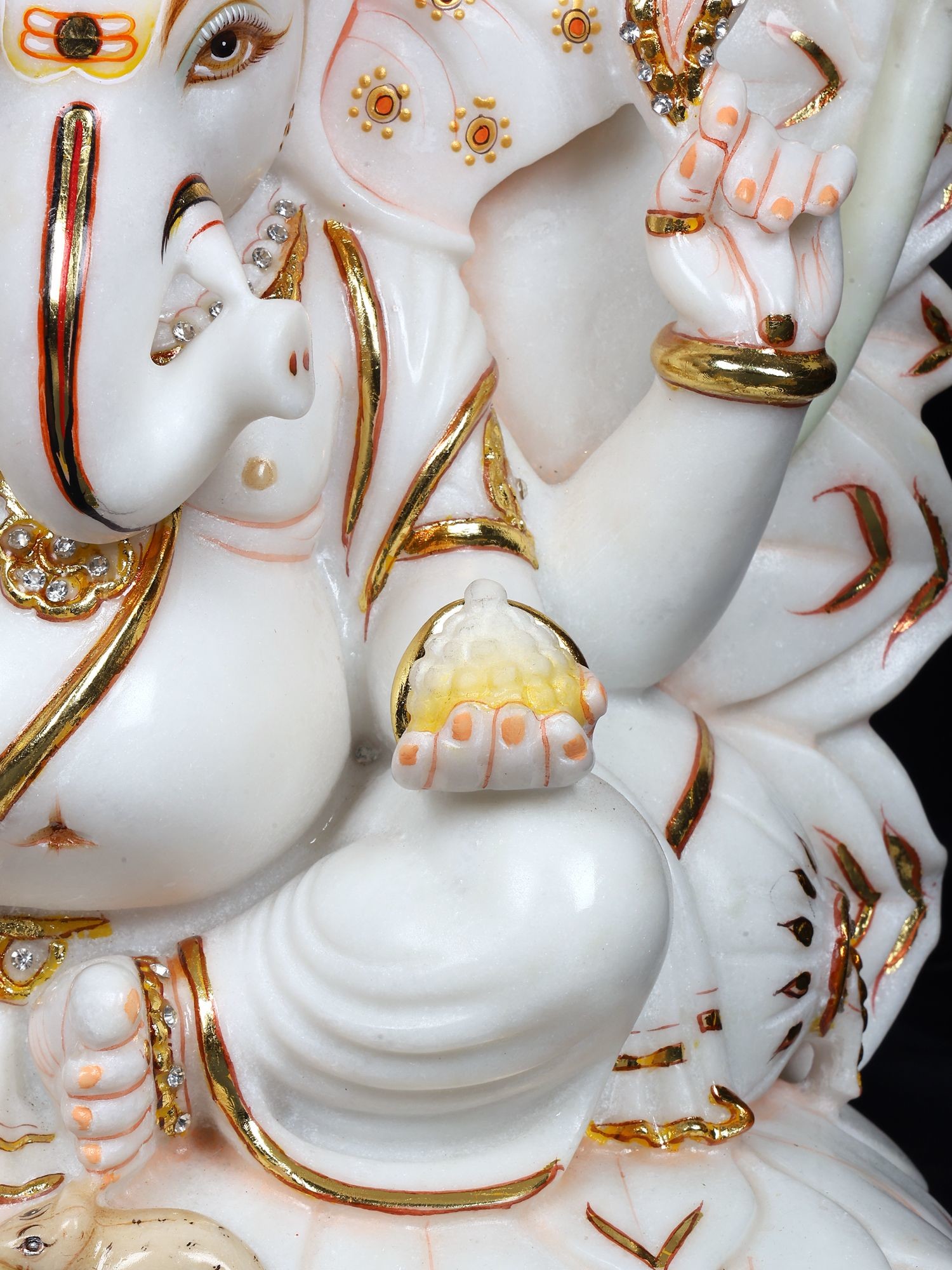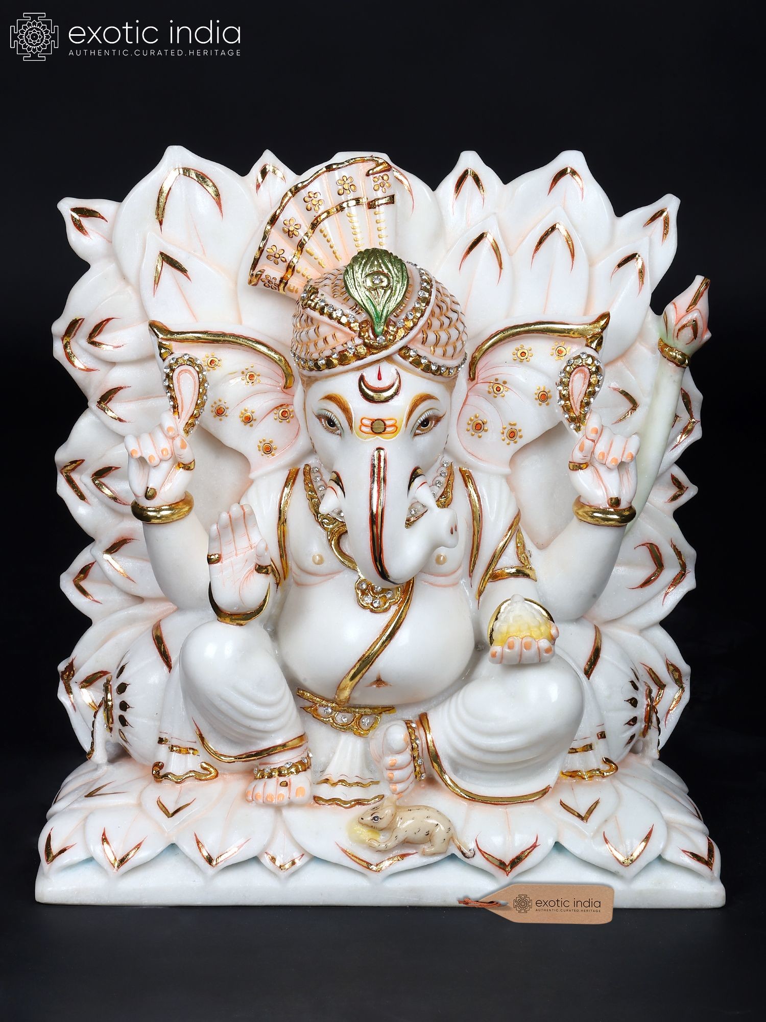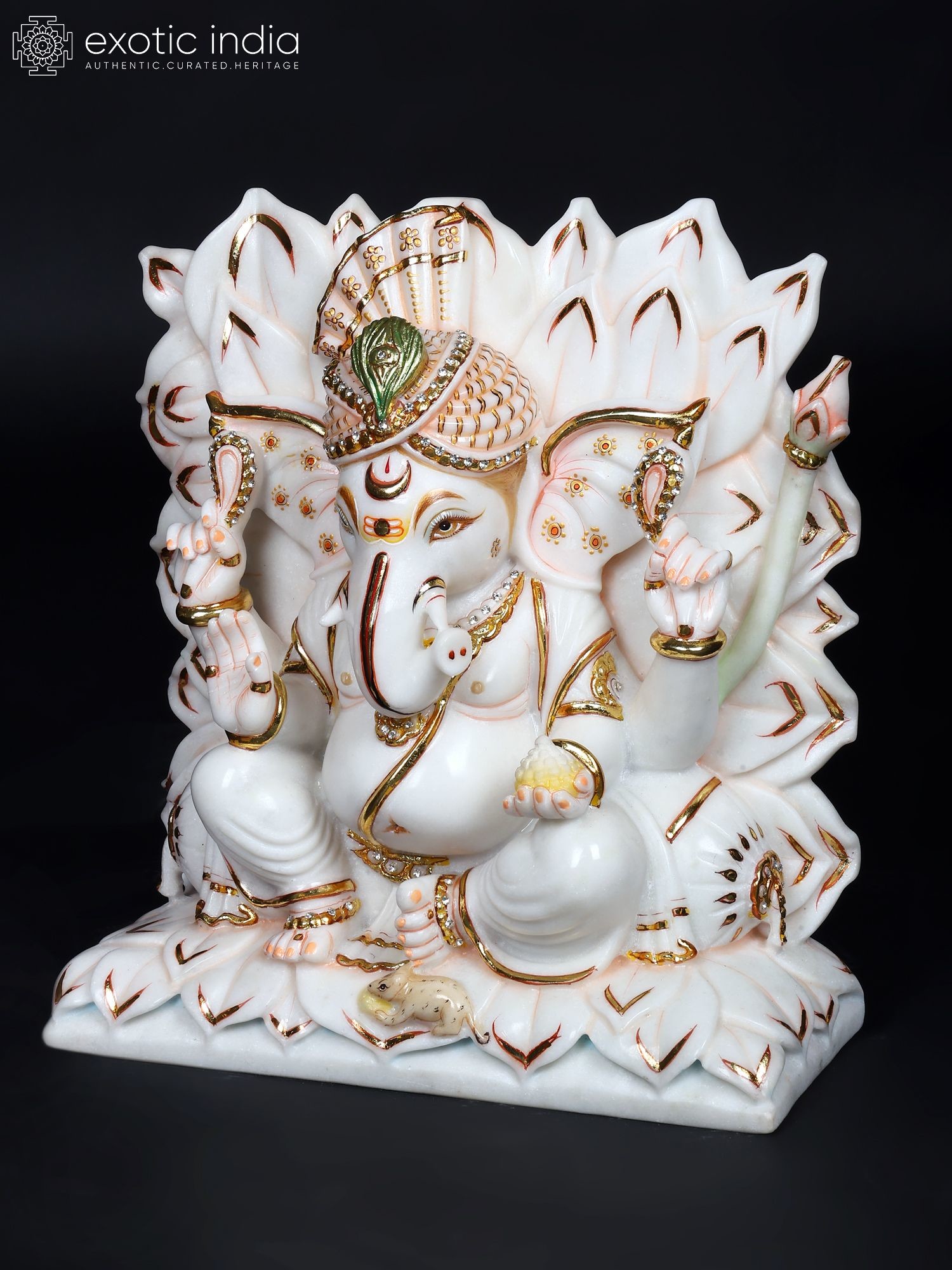 18" Lord Ganesha Seated on Lotus | Handmade | White Marble Ganesh Statue | Ganpati Statue | Vinayak | Ganpati