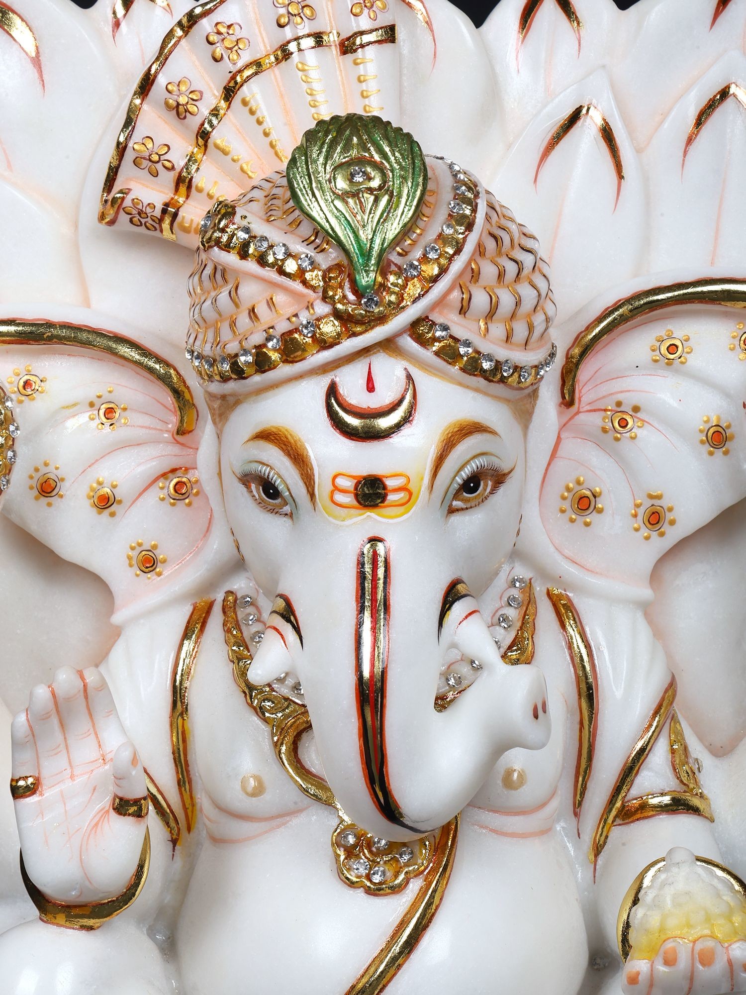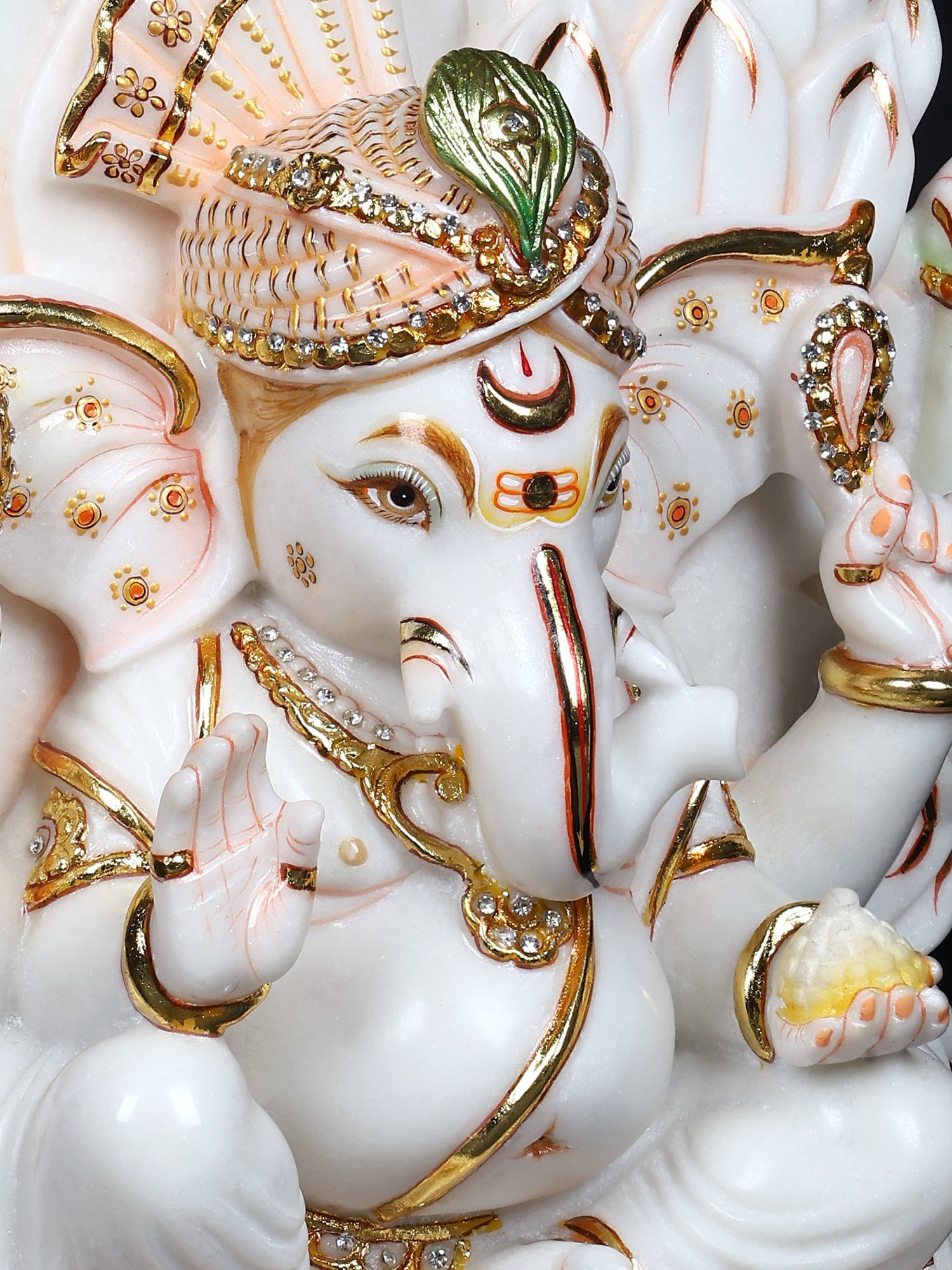 White Marble Ganesha Sculpture, 15", with Stylized Turban