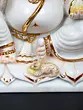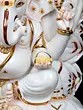 Sits majestically on a lotus base, symbolizing purity and enlightenment.