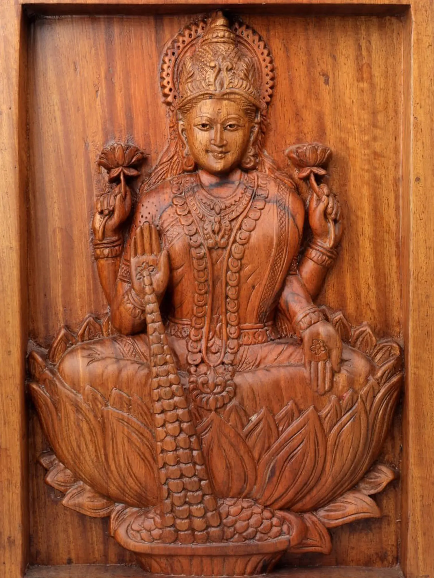 Invite the divine presence of Goddess Lakshmi, the revered Hindu deity of wealth, prosperity, and auspiciousness, into your home with this exquisite hand-carved wooden wall panel. Crafted from rich, warm wood, this piece embodies centuries of artistic tradition and spiritual devotion. The intricate details capture the serene majesty of the goddess, seated gracefully upon a blooming lotus, a symbol of purity, beauty, and spiritual awakening. The goddess is depicted in her classic form, radiating an aura of peace and abundance. Her hands are adorned with symbolic gestures: one is raised in the Abhaya Mudra, offering protection and dispelling fear, while the other gently holds a lotus bud, signifying fertility and the unfolding of fortune. Her benevolent gaze and serene expression invite a sense of calm and well-being into any space. The delicate carving of her ornaments, the flowing fabric of her attire, and the beautifully rendered lotus petals showcase the masterful skill of the artisan. Each stroke of the chisel has brought to life a divine image, imbued with reverence and artistic passion.