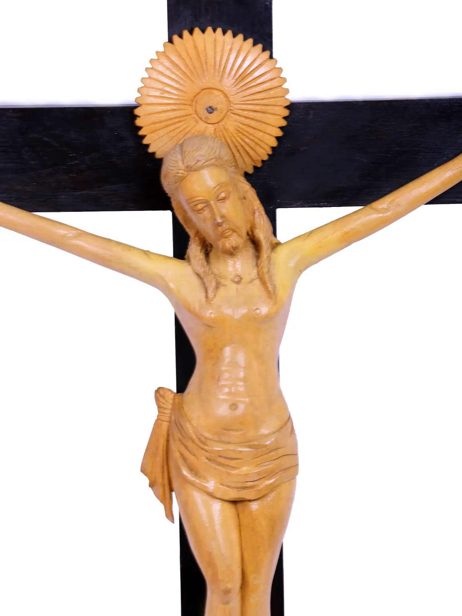 The crucifix has long been a central icon in Christianity, representing the ultimate act of love and the foundation of Christian faith. The image of Christ on the cross evokes powerful narratives from the Gospels, reminding believers of his suffering and resurrection. The sunburst halo behind his head, often referred to as a mandorla, signifies divine glory and enlightenment, while the simple loincloth speaks to humility and vulnerability. This piece transcends mere decoration; it is an object of contemplation, inviting prayer, reflection, and a deeper connection to spiritual teachings. Its presence can transform a space into a sanctuary, a place of peace and reverence.