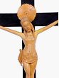 This exquisite wooden carving captures the profound moment of the crucifixion, offering a poignant symbol of sacrifice, redemption, and enduring love. Meticulously crafted from fine wood, each detail speaks to the devotion and skill of the artisan. The natural grain of the wood brings a warm, organic texture to the figure of Christ, imbuing it with a tangible sense of life and presence. The stark contrast of the dark cross against the lighter wood of the figure creates a visually striking composition, drawing the eye to the central drama of the scene.