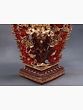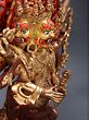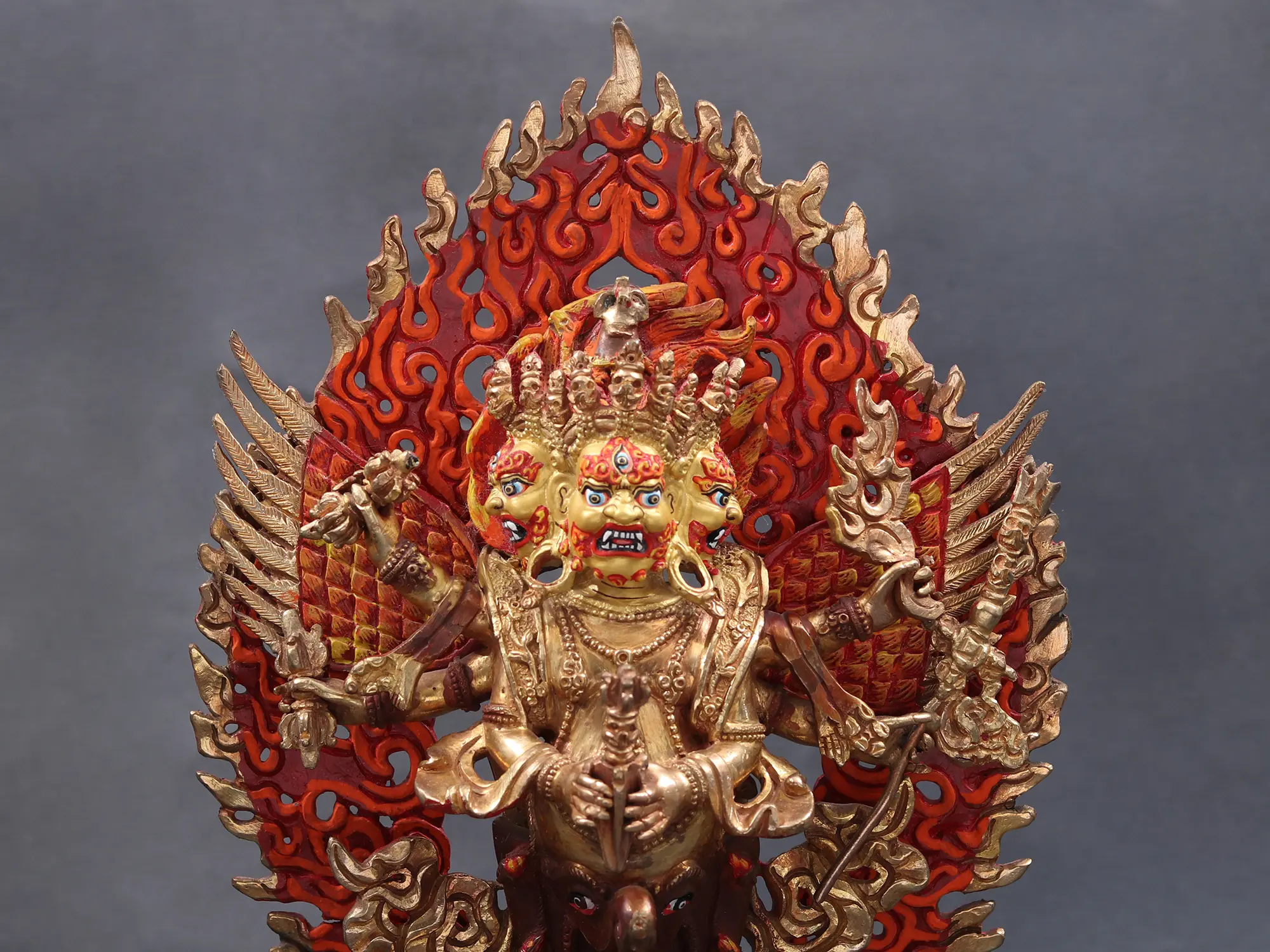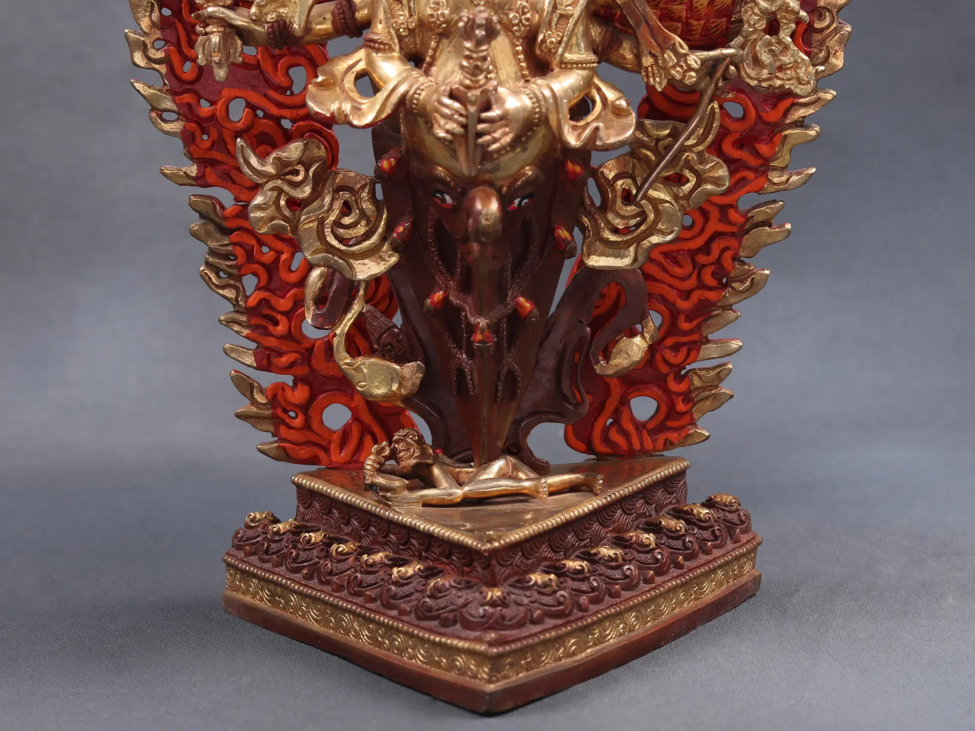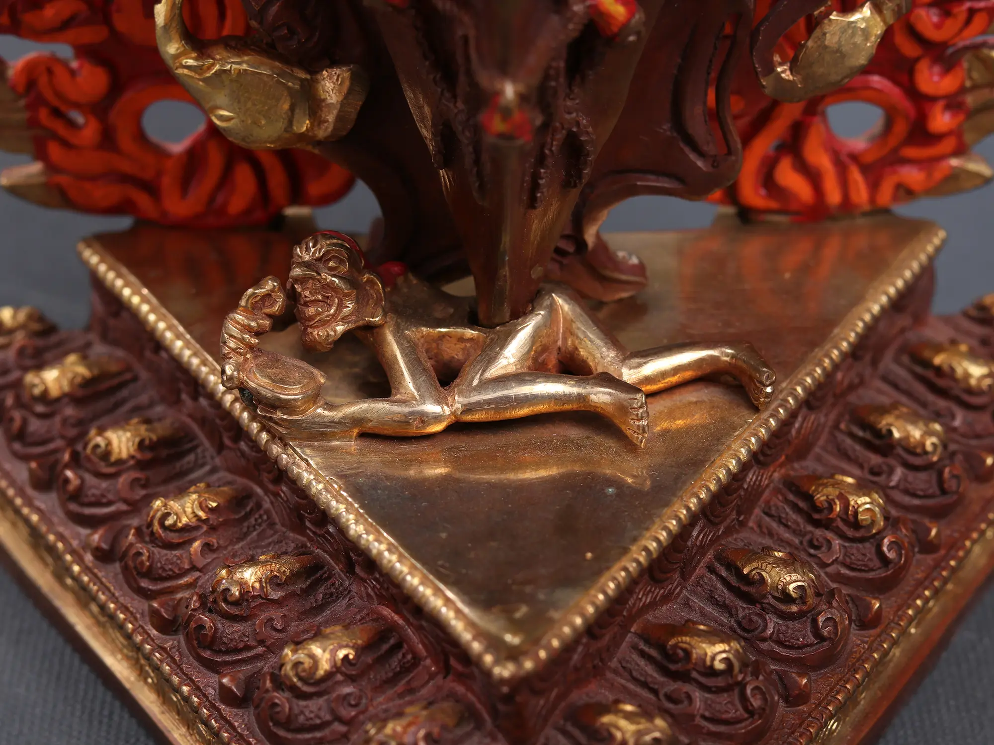 The rich patina of the copper base, contrasted with the radiant gleam of the 24 karat gold gilding, creates a visually striking piece that commands attention. The detailed rendering of the base, often depicting subjugated beings or symbolic offerings, further underscores the deity's power over all hindrances. The presence of a prostrate figure beneath the deity’s feet is a common motif, symbolizing the complete subjugation of negativities, ego, and worldly attachments, thereby clearing the path for spiritual realization. This sculpture is a testament to the enduring skill of Nepalese artisans and the deep devotional practices that inspire such powerful representations of enlightened energy. It serves as a potent reminder of the inherent capacity within all beings to achieve liberation through wisdom and unwavering determination.